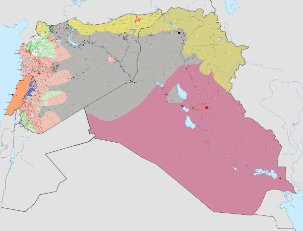 Situacija na Bliskom istoku: ljubičasto - iračka vojska; sivo - Islamska Država; tamno žuto - irački Kurdi; svjetlo žuto- sirijski Kurdi; ružičasto - sirijska vojska; zeleno - sirijska opozicija; bijelo - Front Al Nusra; plavo – Hezbolah; narančasto - libanonska vojska (Izvor: Wikimedia Commons)
