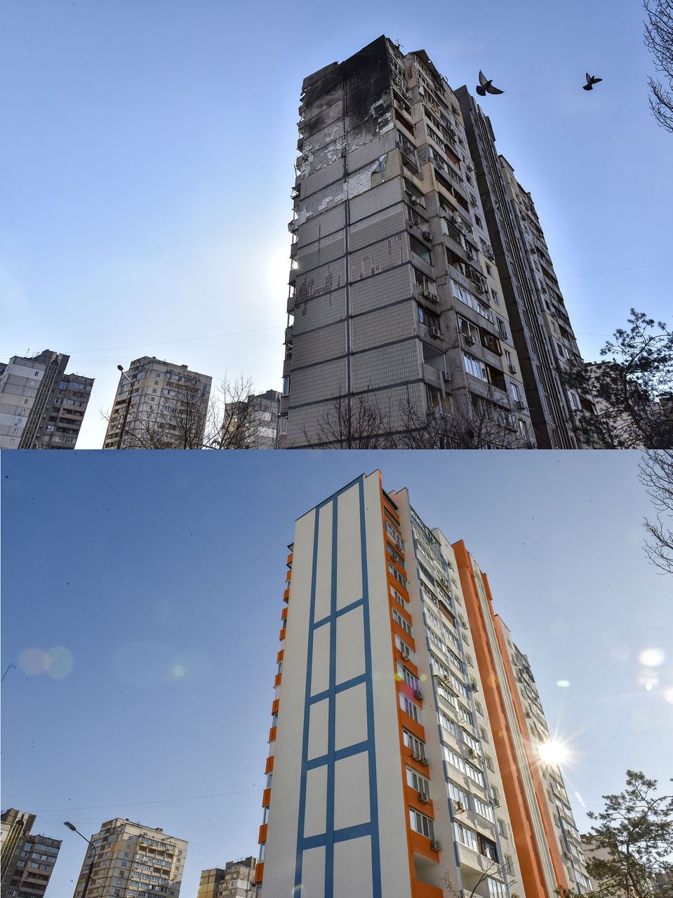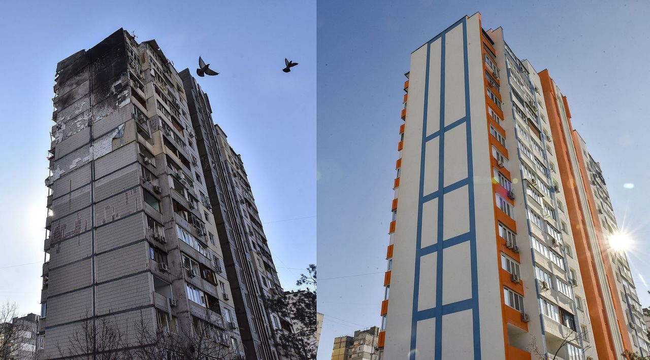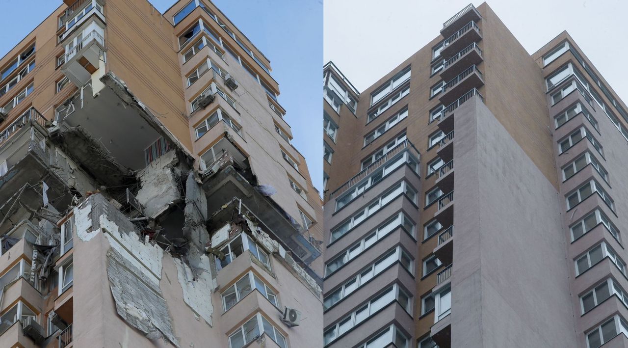 U galeriji donosimo nekoliko takvih primjera. Na jednom od njih nalazi se neboder u Kijevu koji je ruski projektil pogodio trećeg dana rata, 26. veljače 2022. godine. Projektil je „pomeo“ nekoliko stanova na višim katovima, a neboder je obnovljena prije nego se to moglo očekivati i unatoč objektivnim razlozima uslijed ratnog stanja. Učinak obnove spomenutog nebodera vidljiv je iz fotografija snimljenih 11. veljače ove godine. Slično je i s nekim drugim kijevskim zgradama.