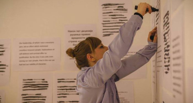 Sarajevska umjetnica Adela Jušić u svom performansu "Svilena košulja boje lavande" bavi se Biljanom Plavšić i njezinim likom i (ne)djelom koristeći transkripte s haškog suđenja, njezine memoarske zapise i izjave za medije (FOTO: Martina Anišić/adelajusic.wordpress.com)