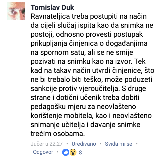 Tvrdnju ilustriraju snimkom zaslona komentara Tomislava Duka, ravnatelja osnovne škole Antunovac, koji je u Facebook grupi što okuplja više tisuća učitelja i nastavnika, napisao: "Ravnateljica treba postupiti na način da cijeli slučaj ispita kao da snimka ne postoji, odnosno provesti postupak prikupljanja činjenica o događanjima na spornom satu, ali se ne smije pozivati na snimku kao na izvor. Tek kad na takav način utvrdi činjenice, što ne bi trebalo biti teško, može poduzeti sankcije protiv vjeroučitelja. S druge strane i dotični učenik treba dobiti pedagošku mjeru za neovlašteno korištenje mobitela, kao i neovlašteno snimanje učitelja i davanje snimke trećim osobama."
