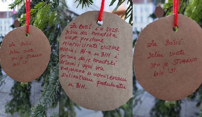 „Za Božić želim znati što je STVARNO bilo '91.”, pisalo je na jednom kartončiću. “U sljedećoj godini želim da kao društvo češće pomislimo 'A što smo mi njima radili?' i počnemo kolektivno čistiti u svom dvorištu. Jer je i to domoljublje”, stajalo je na drugom. Na trećem: “U 2025. godini želim da se ratnim zločincima: Kordiću, Praljku, Petkoviću, Prliću, Blaškiću, Ćoriću i Merčepu – oduzmu državna odlikovanja. Mi se njima ne ponosimo.” Dakle, sasvim legitimna i potrebna pitanja.