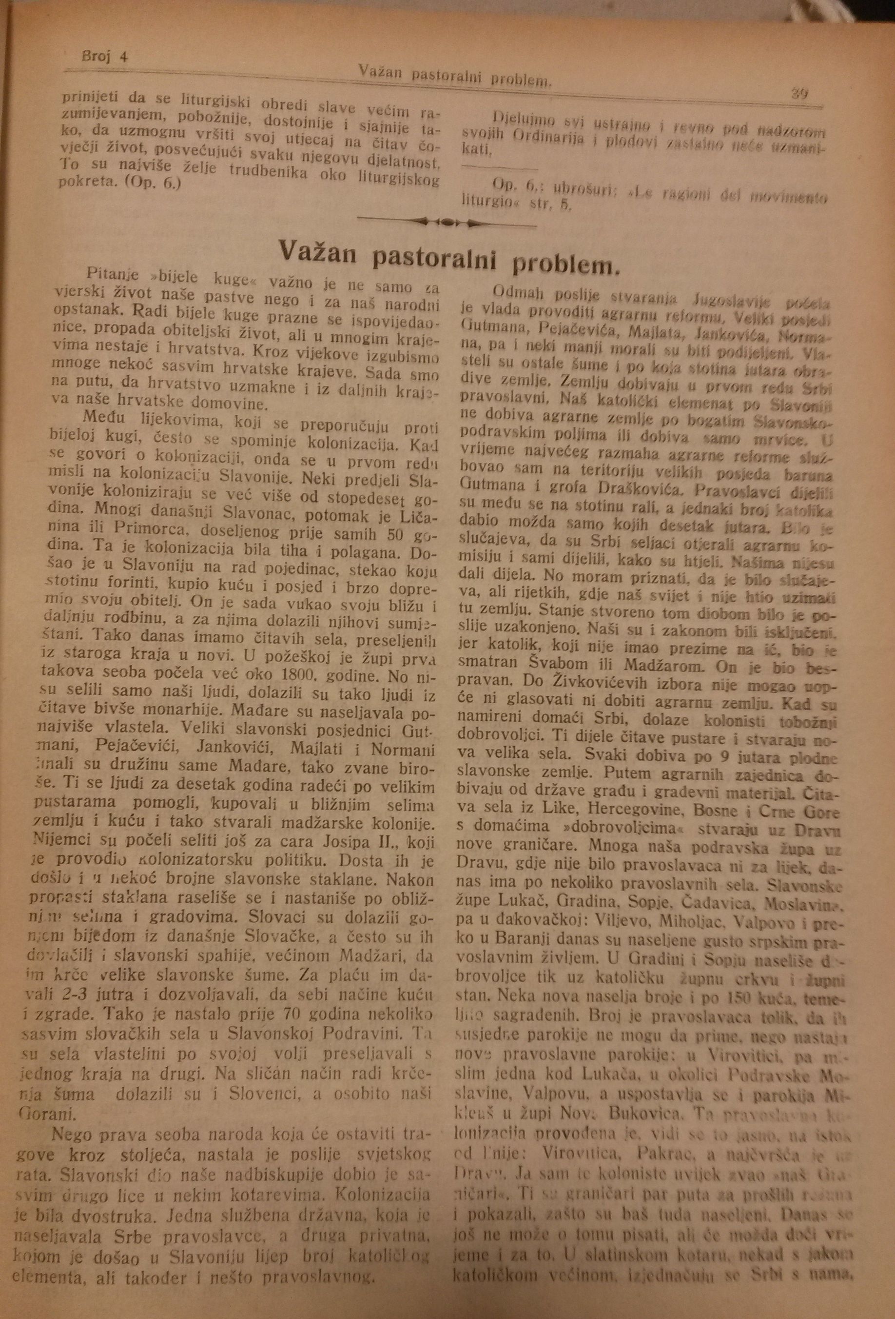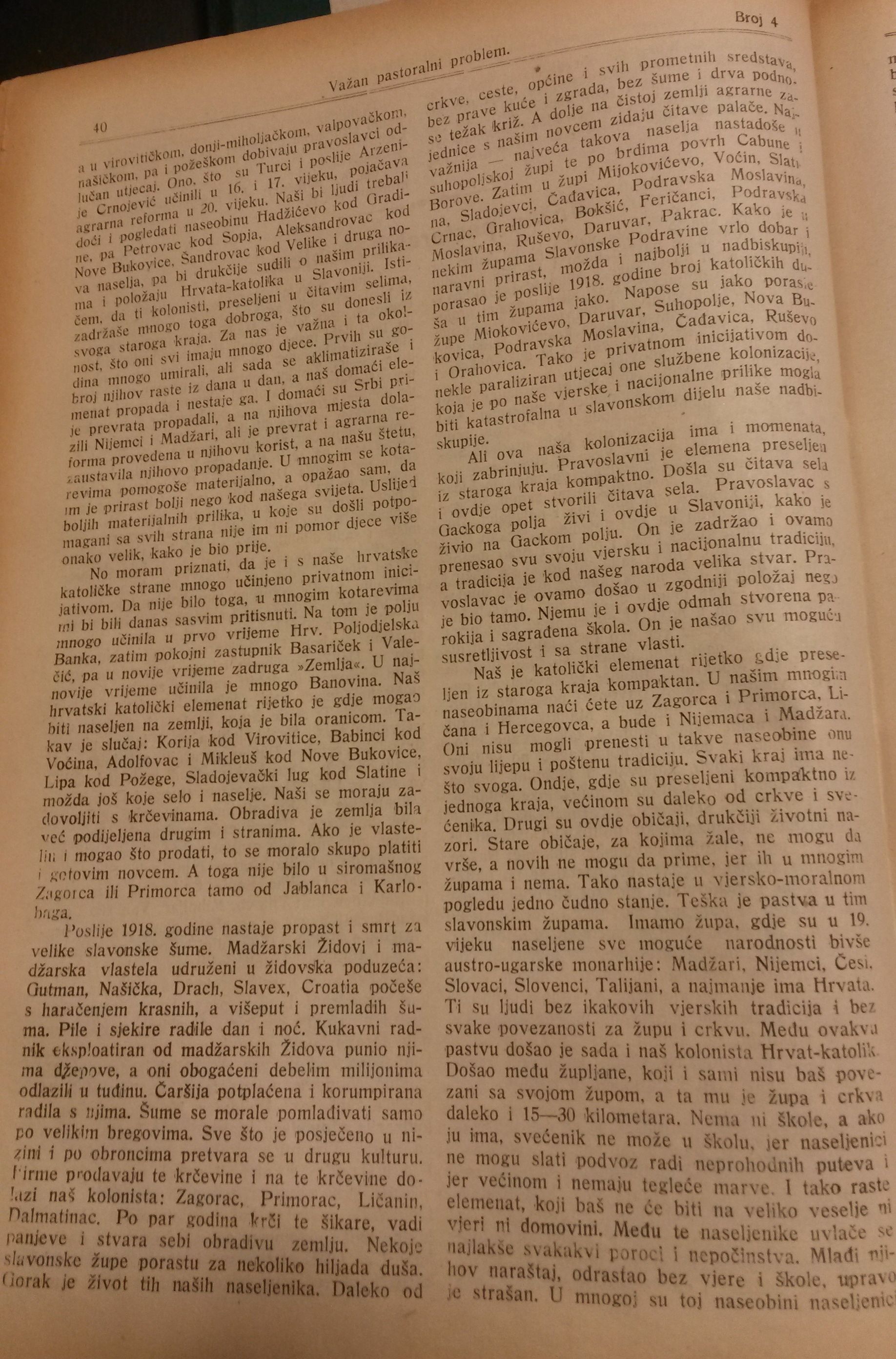 Za početak ćemo se kratko osvrnuti na pojedine napise uoči uspostave NDH. U tekstu "Važan pastoralni problem", koji se tiče demografije, ali i kritizira agrarnu reformu Kraljevine Jugoslavije, prema kojoj "zemlju dobivaju u prvom redu Srbi pravoslavni", a katolicima pripadaju mrvice. Posljedica toga je gusto naseljavanje Slavonije i Baranje Srbima, Podravine "gdje nije bilo pravoslavaca ni za lijek, a danas ima po nekoliko pravoslavnih sela", dok se u većinskim katoličkim područjima "izjednačuju Srbi s nama". Kolonisti, nastavlja se (PR1), imaju mnogo djece. "Prvih su godina mnogo umirali, ali sada se aklimatiziraše i broj njihov raste iz dana u dan, a naš domaći elemenat propada i nestaje ga". Poslije 1918. godine "nastaje propast i smrt za velike slavonske šume", jer "madžarski židovi i madžarska vlastela udruženi u židovska poduzeća... počeše s haračenjem krasnih, a višeput i premladih šuma", čime se su punili džepove "debelim milijonima". Među naseljenike, pritom, "uvlače se najlakše svakakvi poroci i nepočinstva".