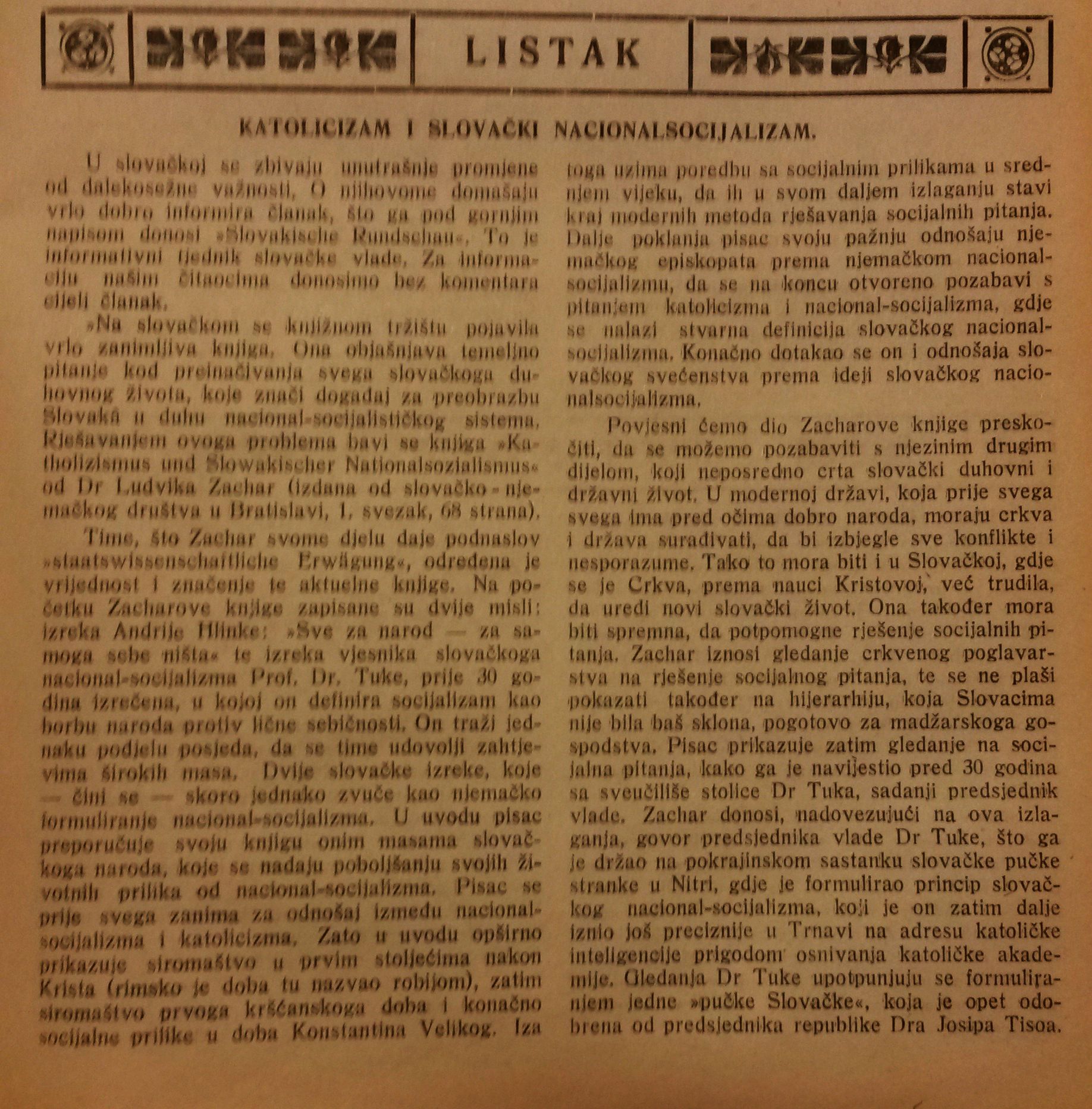 No, simpatije za nacifašizam možda se bolje primjećuju u tekstu "Katolicizam i slovački nacionalsocijalizam", objavljen originalno u "Slovakische Rundschauu". Bavi se među ostalim i odnosima katolicizma i slovačkog nacional-socijalizma. U tom sistemu, piše: "Neće Crkva niti biti progonjena. Progoni bi bili protiv nacional-socijalizma. U Njemačkoj je pisao osnivač nacional-socijalizma Adolf Hitler u svojoj knjizi 'Mein Kampf', da u redovima nacional-socijalista može sjediti također uvjereni katolik pokraj uvjerenog protestanta, a da ne dođu u duševni sukob sa svojim vjerskim naziranjem".