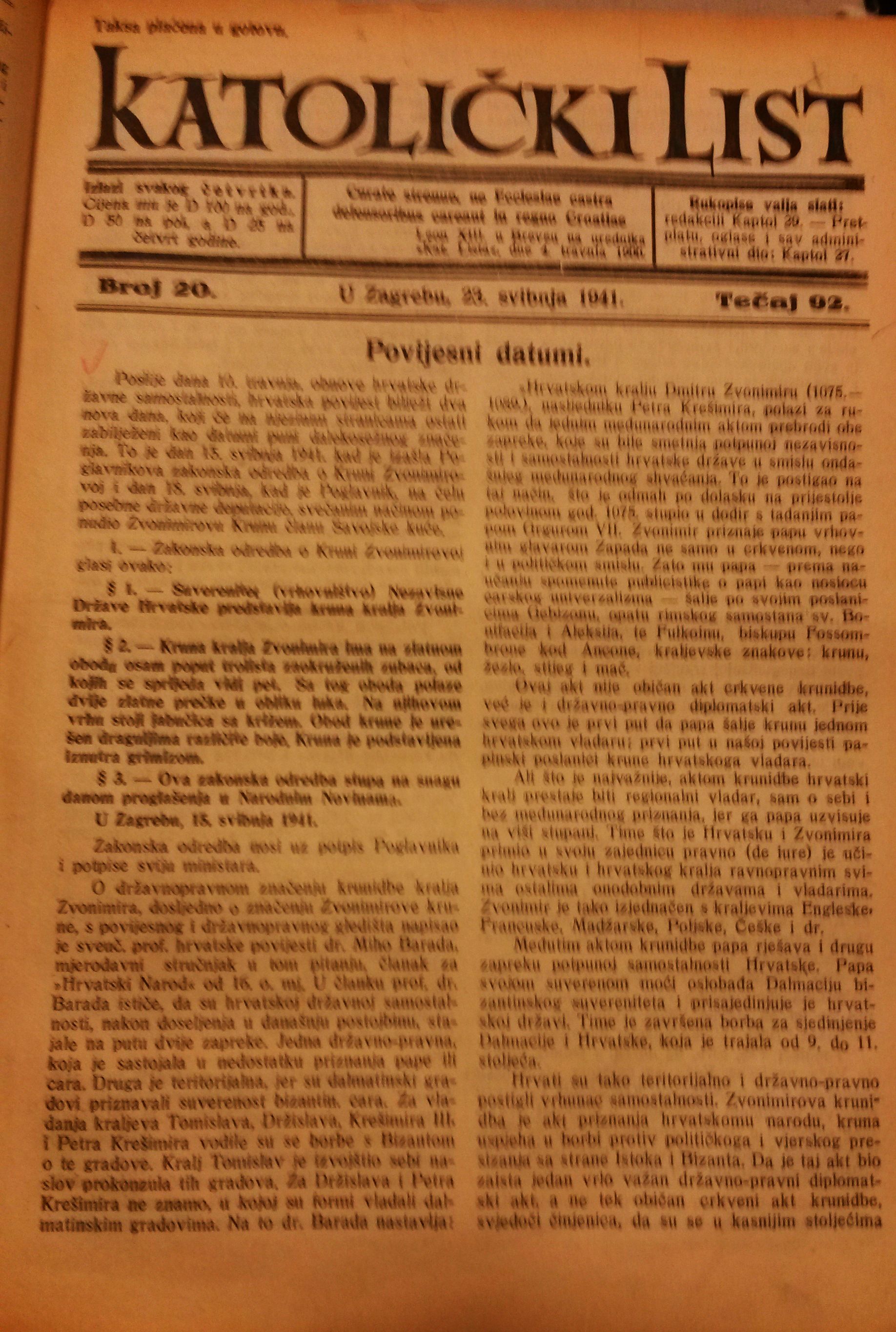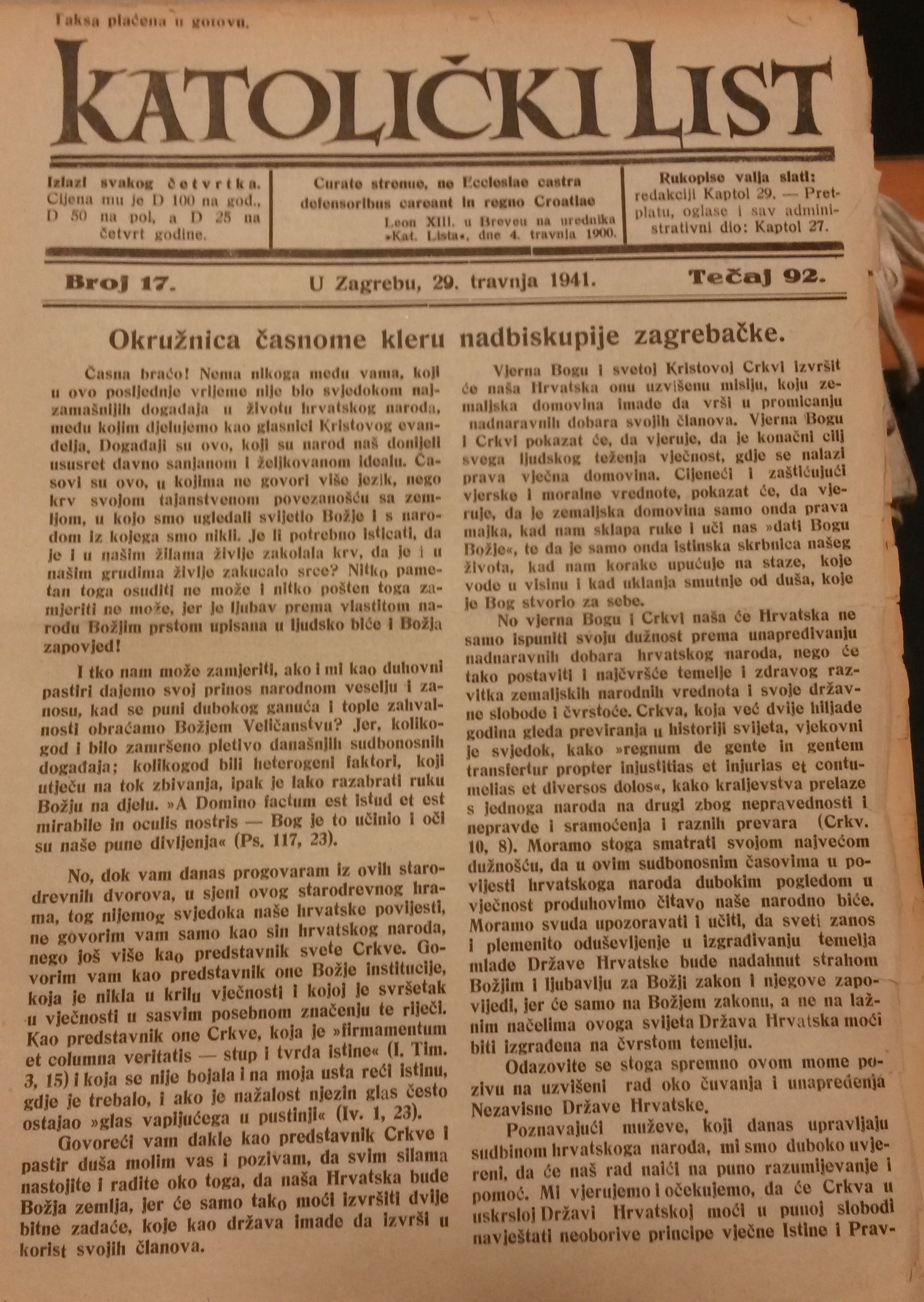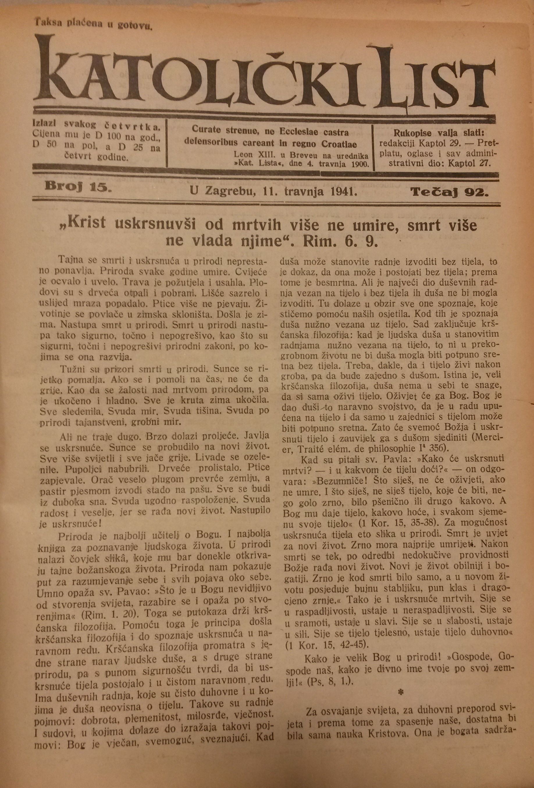 Prvi broj Katoličkog lista s nadnevkom 11. travnja bio je već otisnut kada su ustaše umarširale u Zagreb s Nijemcima. Nema traga vijesti - posvećen je Uskrsu.