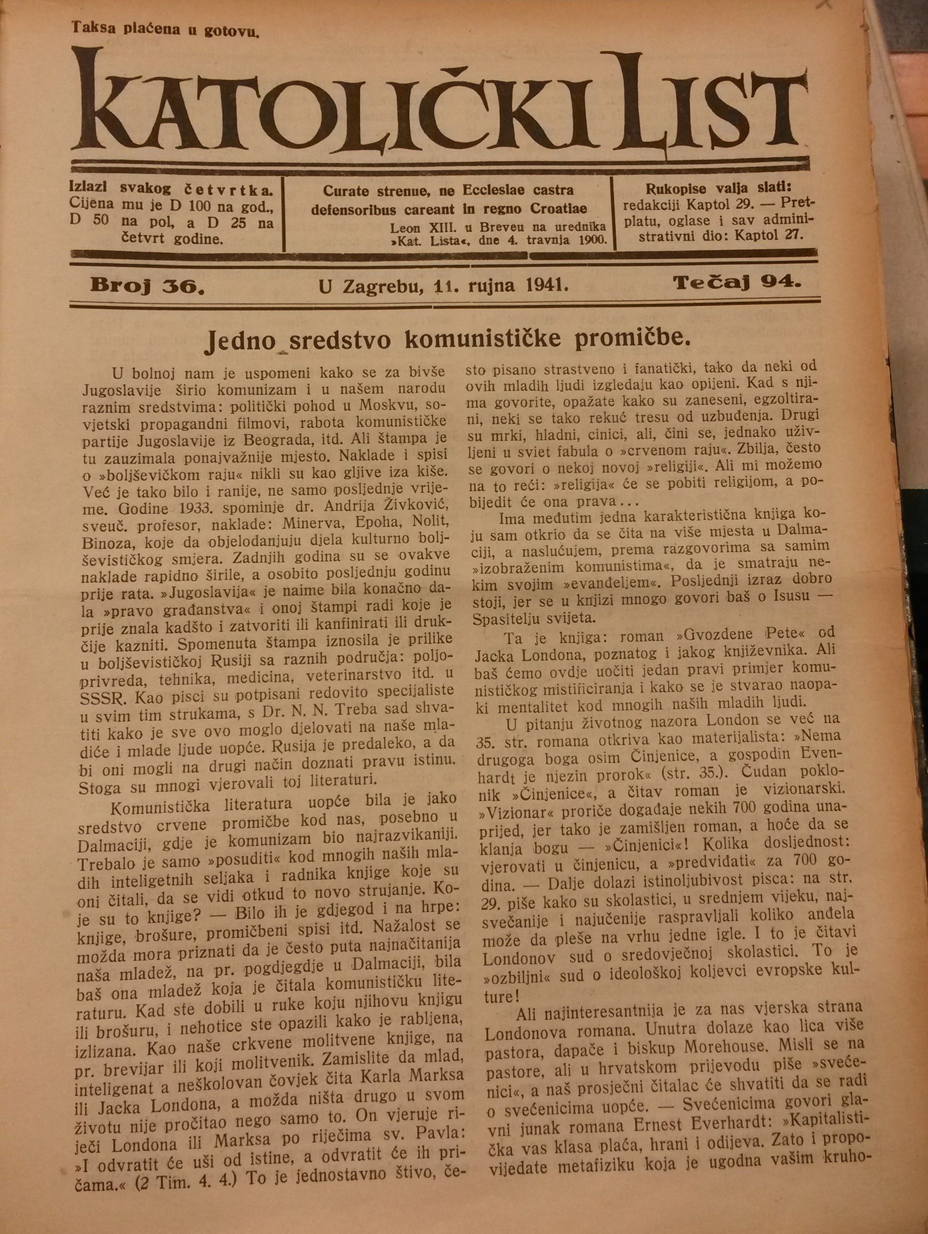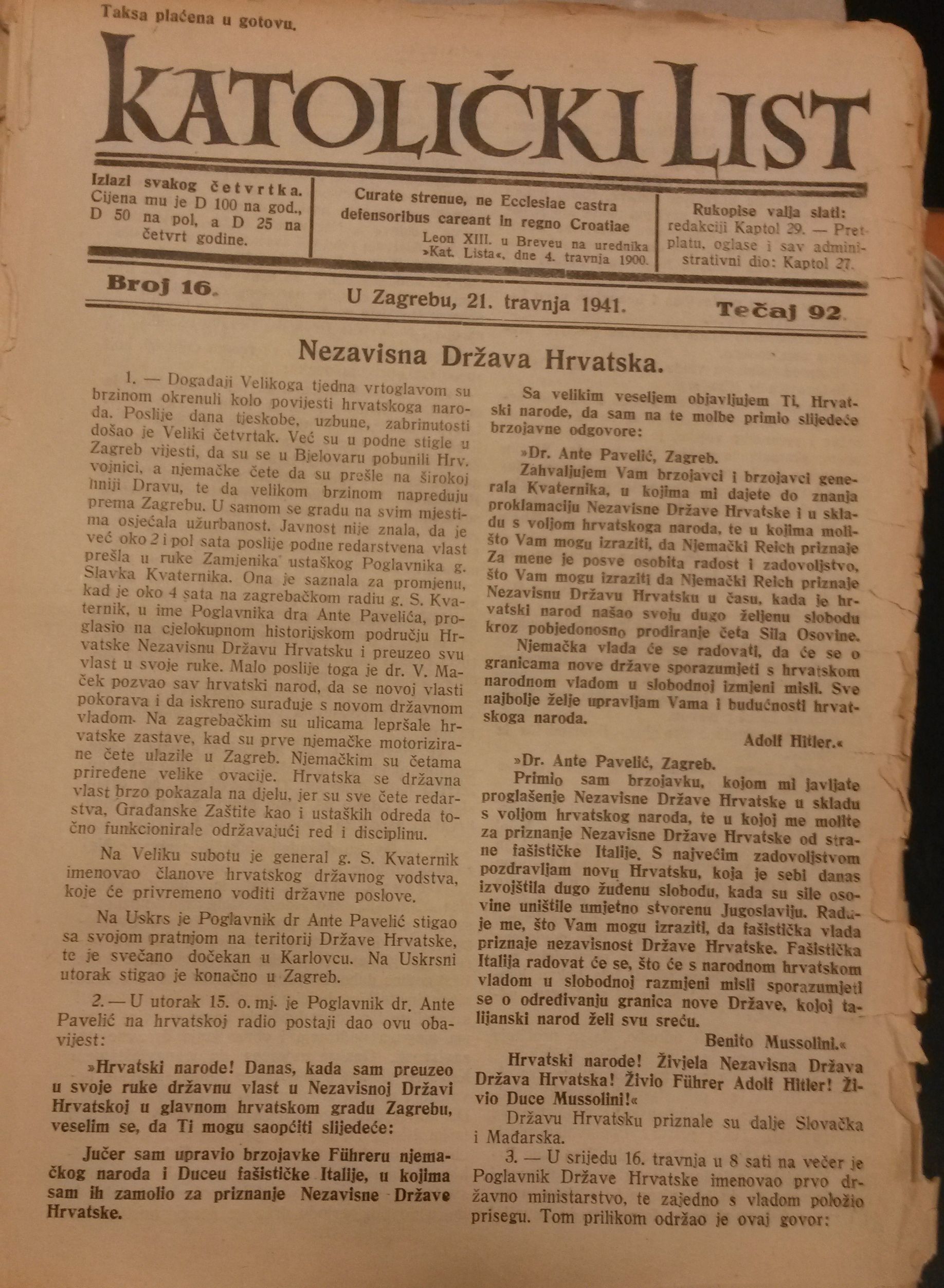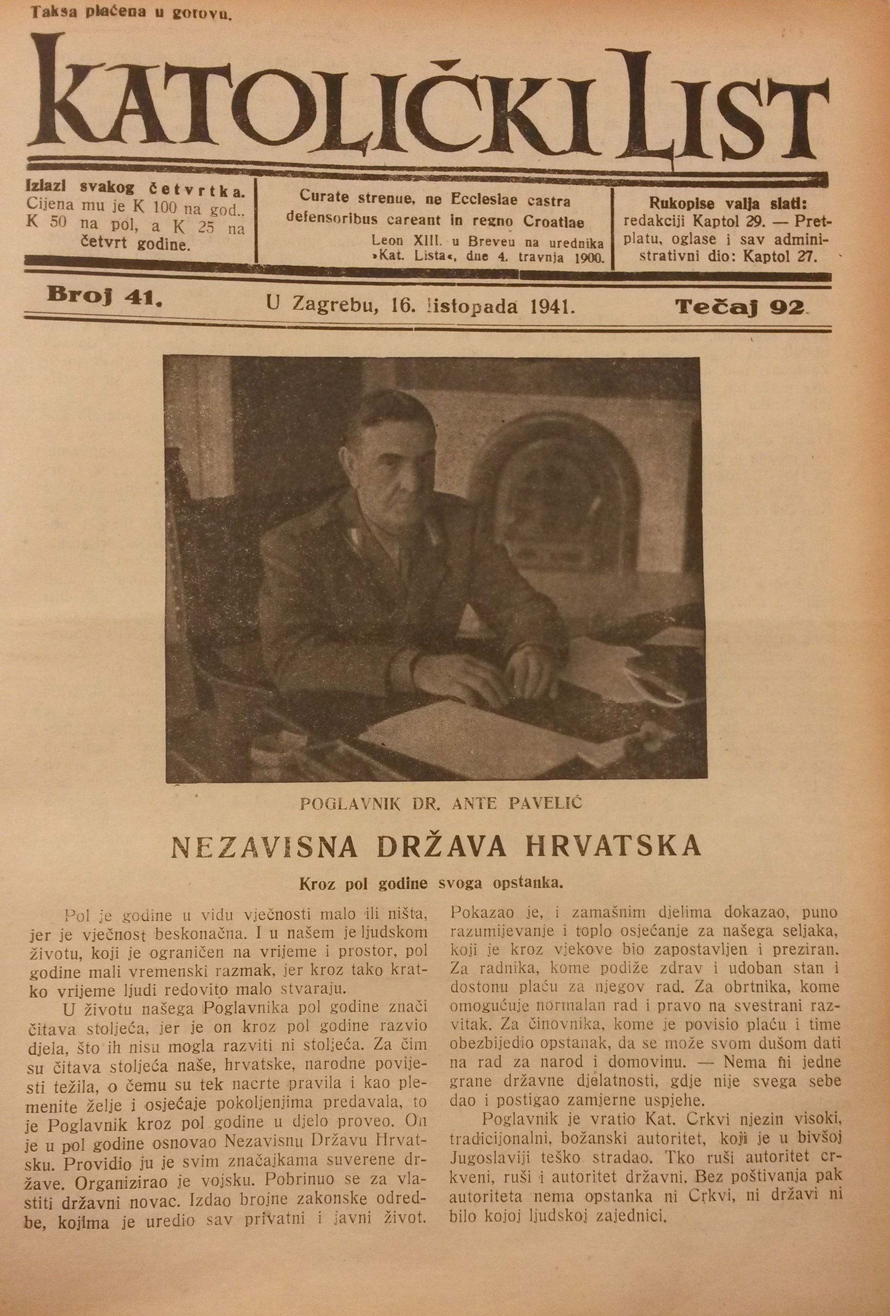 Tjednik Zagrebačke nadbiskupije kojom u to vrijeme upravlja Alojzije Stepinac, a za čiju se svetost danas bori Katolička crkva u Hrvatskoj, možda najbolje ocrtava službenu politiku vjerskih poglavara tada. Ekstremizam je prepušten listovima poput Hrvatskog glasa, ali i Katolički list je imao svoje zasluge u širenju mržnje (FOTO: Lupiga.Com)