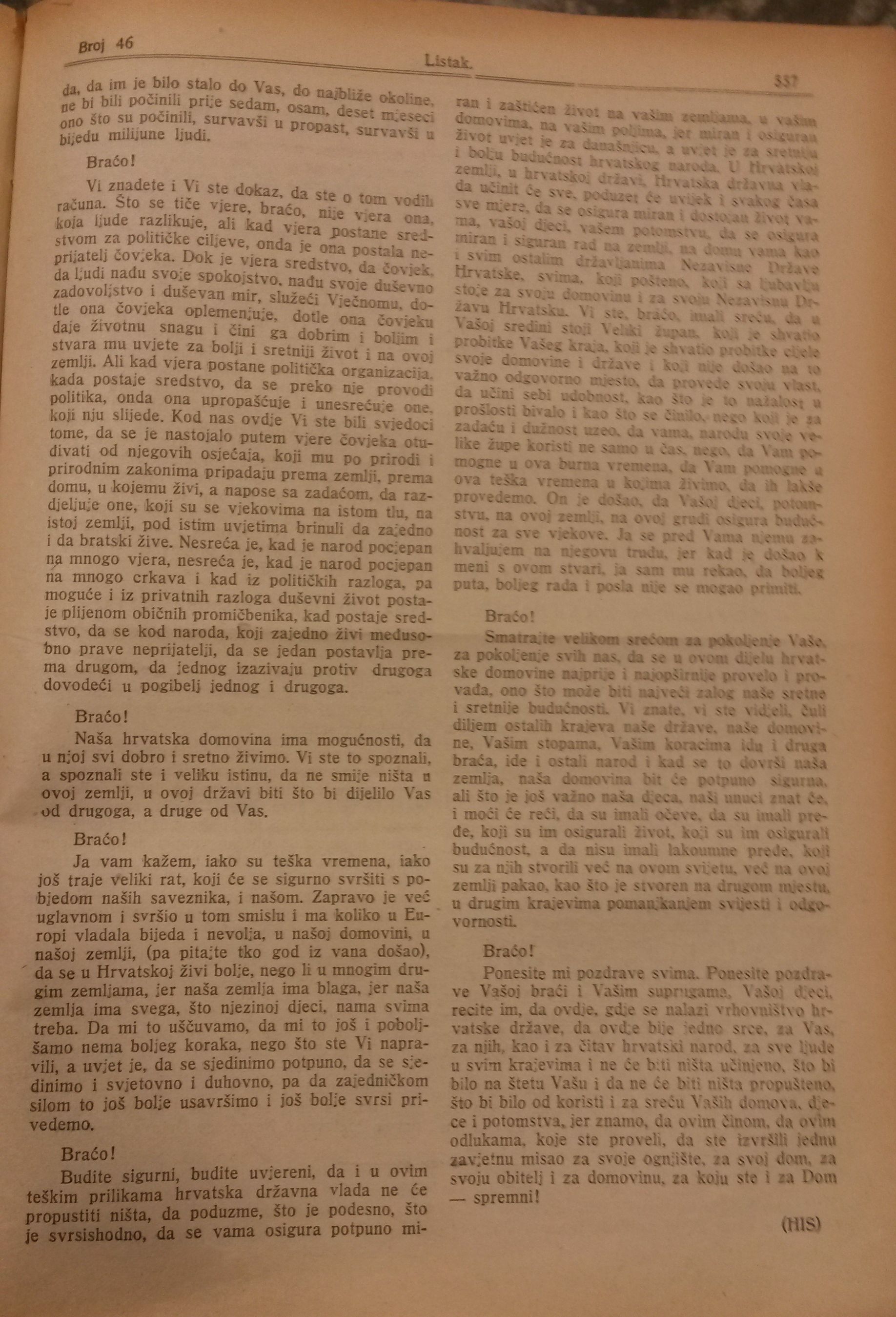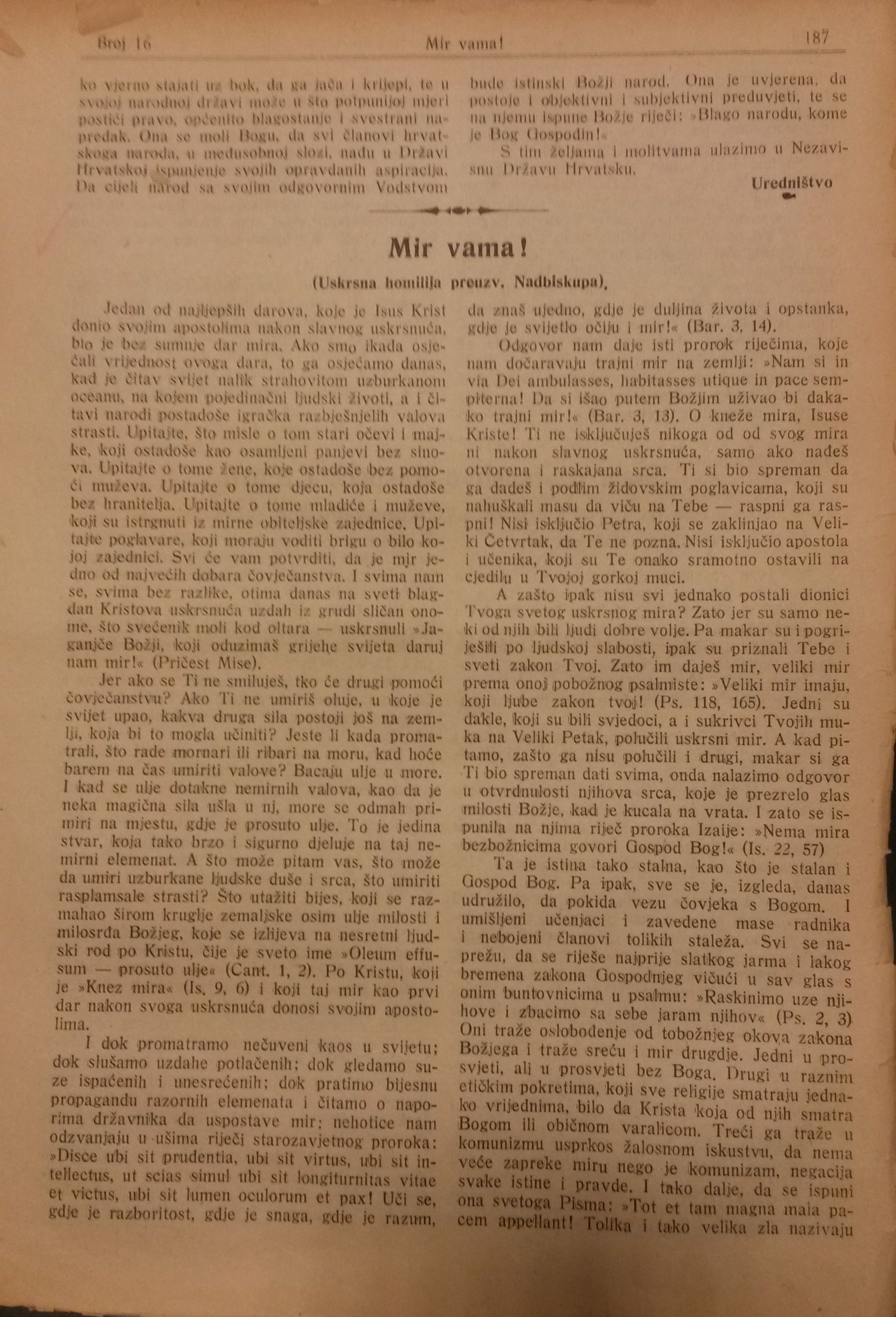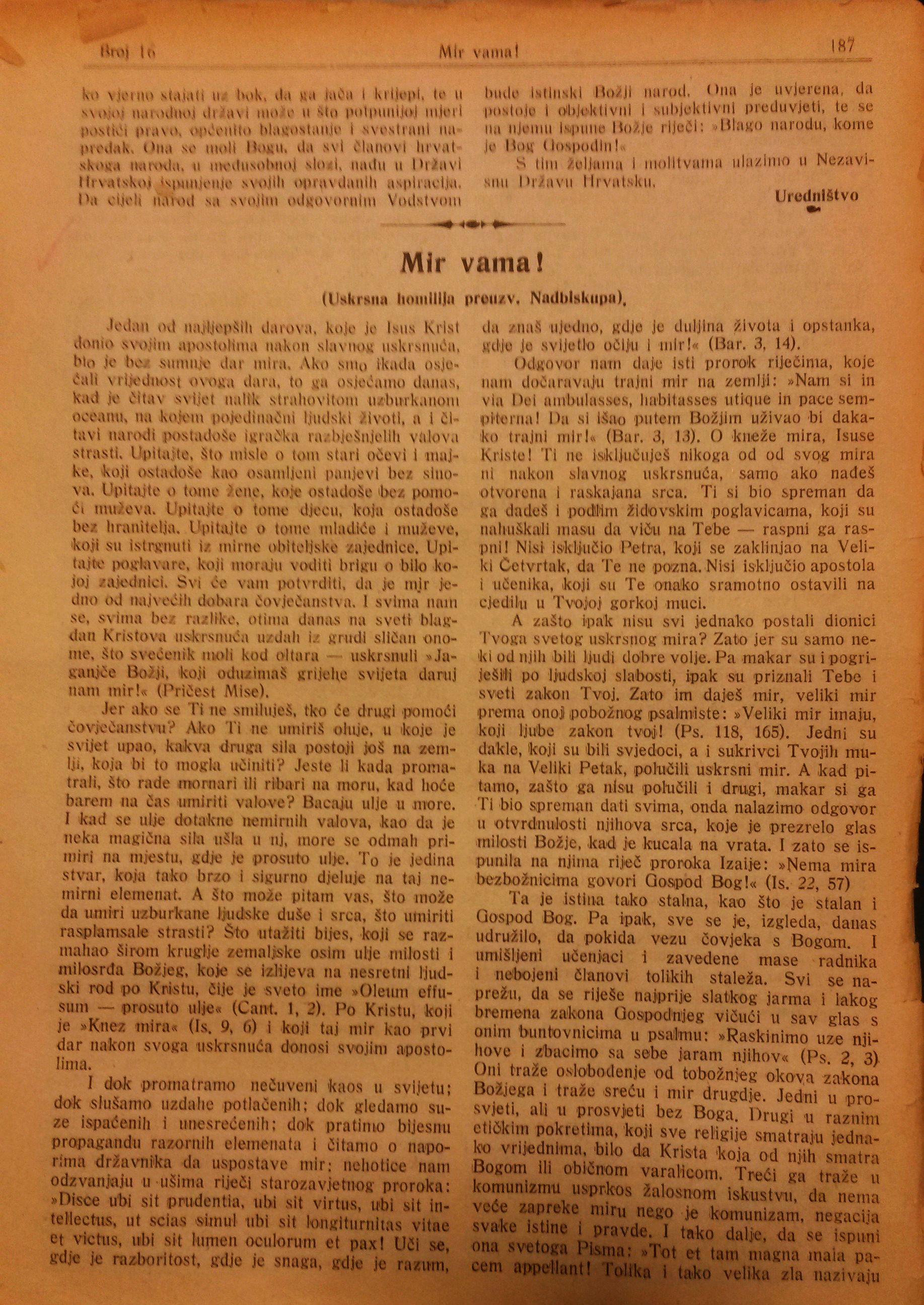 Na istoj stranici započinje uskrsna homilija Alojzija Stepinca, budući je proglašenje NDH pao na Veliki četvrtak. Kardinal je homiliju posvetio temi mira, budući da promatramo "nečuveni kaos u svijetu, slušamo uzdahe potlačenih, gledamo suze ispaćenih i unesrećenih, pratimo bijesnu propagandu razornih elemenata i čitamo o naporima državnika da uspostave mir". Osim što Židove naziva nevjernicima, navodi i: "O kneže mira, Isuse Kriste! Ti ne isključuješ nikoga od svog mira ni nakon slavnog uskrsnuća, samo ako nađeš otvorena i raskajana srca. Ti si bio spreman da ga dadeš i podlim židovskim poglavicama, koji su nahuškali masu da viču na Tebe - raspni ga, raspni! Nisi isključio Petra, koji se zaklonjao na Veliki Četvrtak da Te ne pozna..." Dio homilije posvećuje i "umišljenim učenjacima i zavedenim masama radnika" koji žele pokidati veze s Bogom, kako kroz prostvetu, etičke pokrete, koji "sve religije smatraju jednako vrijednima", tako i najveću zapreku miru - komunizam, "negaciju svake istine i pravde". Homiliju završava zamolbom da kaže "hrvatskom narodu na pragu novoga razdoblja života kao nekoć apostolima nakon Uskrsnuća - mir s vama!".