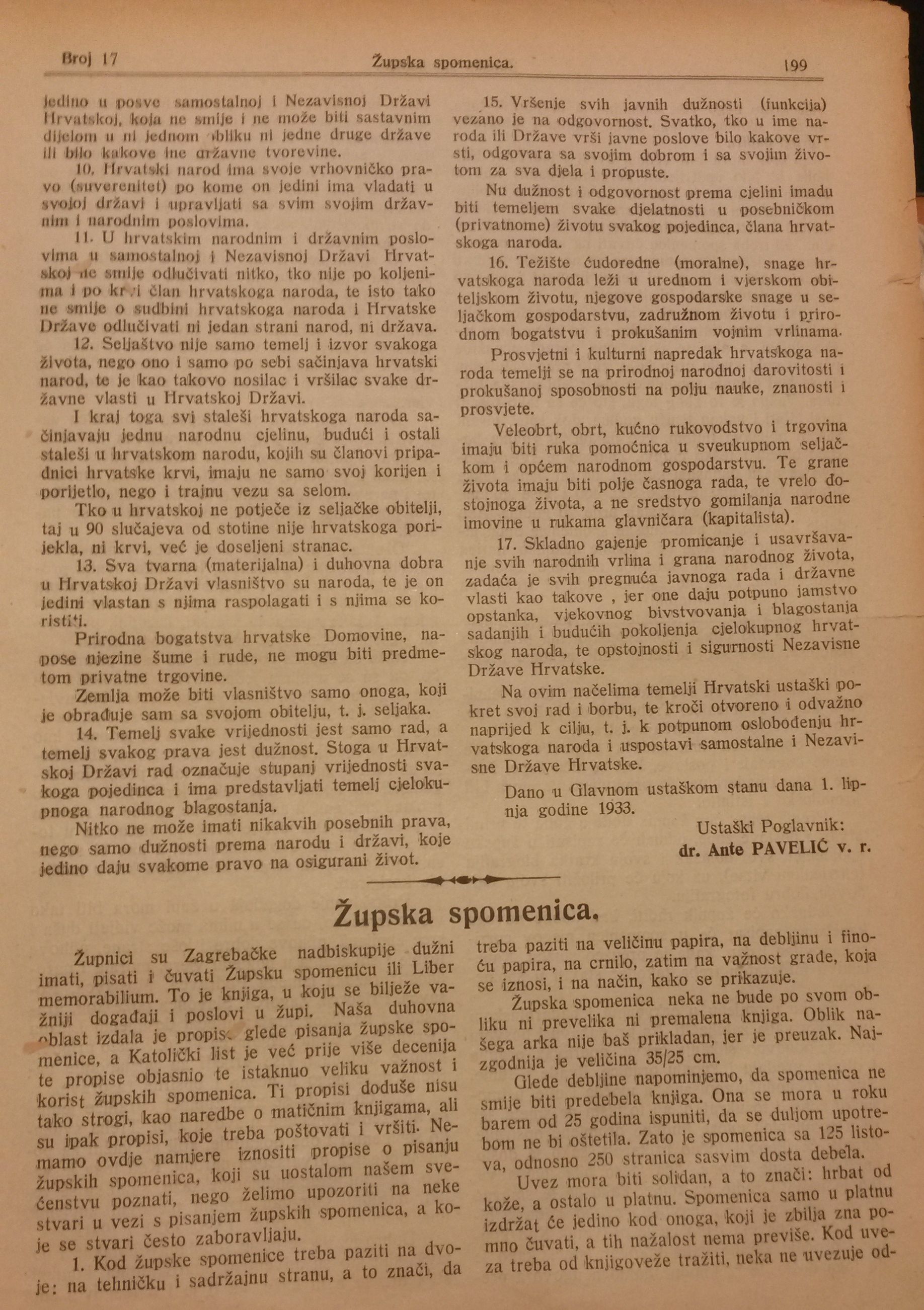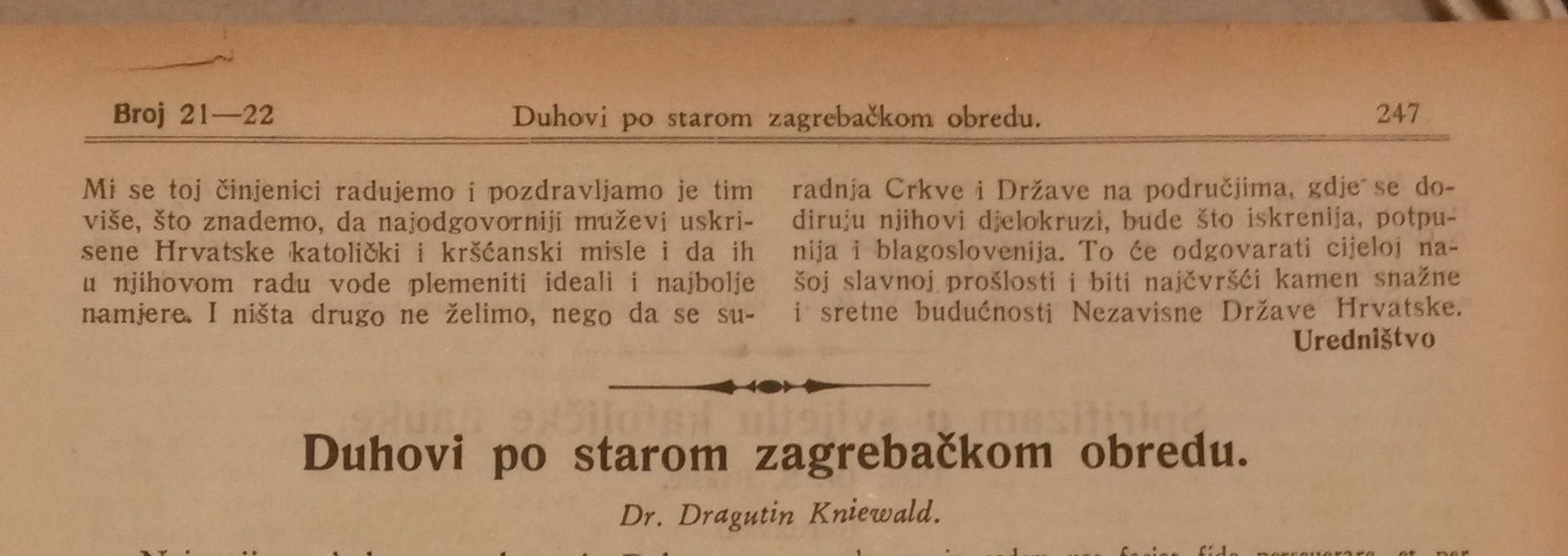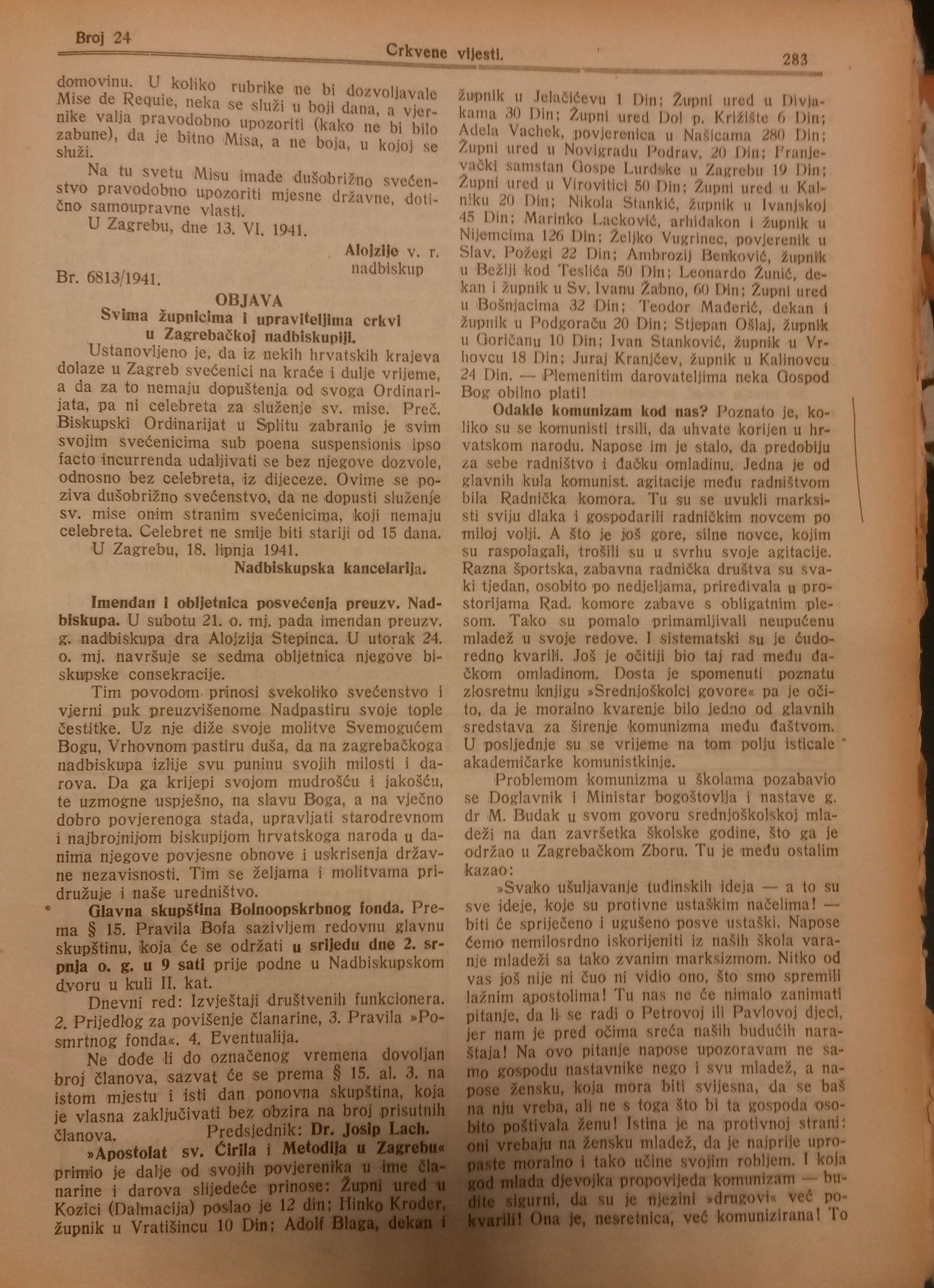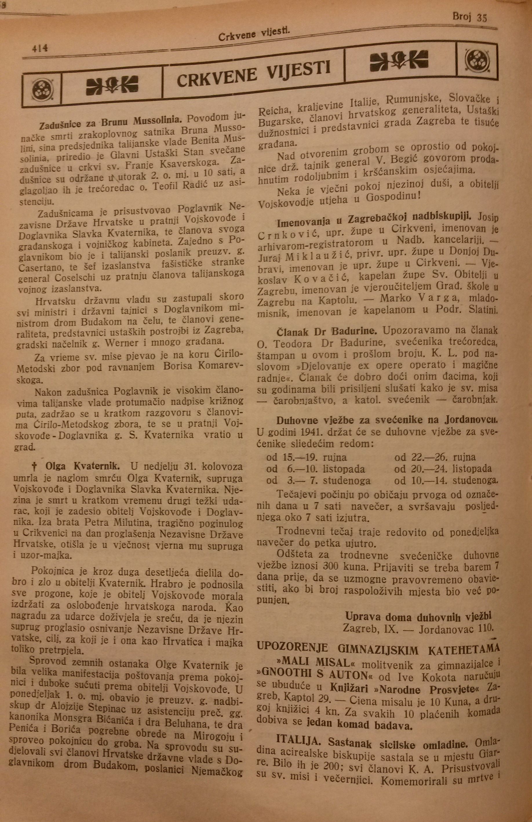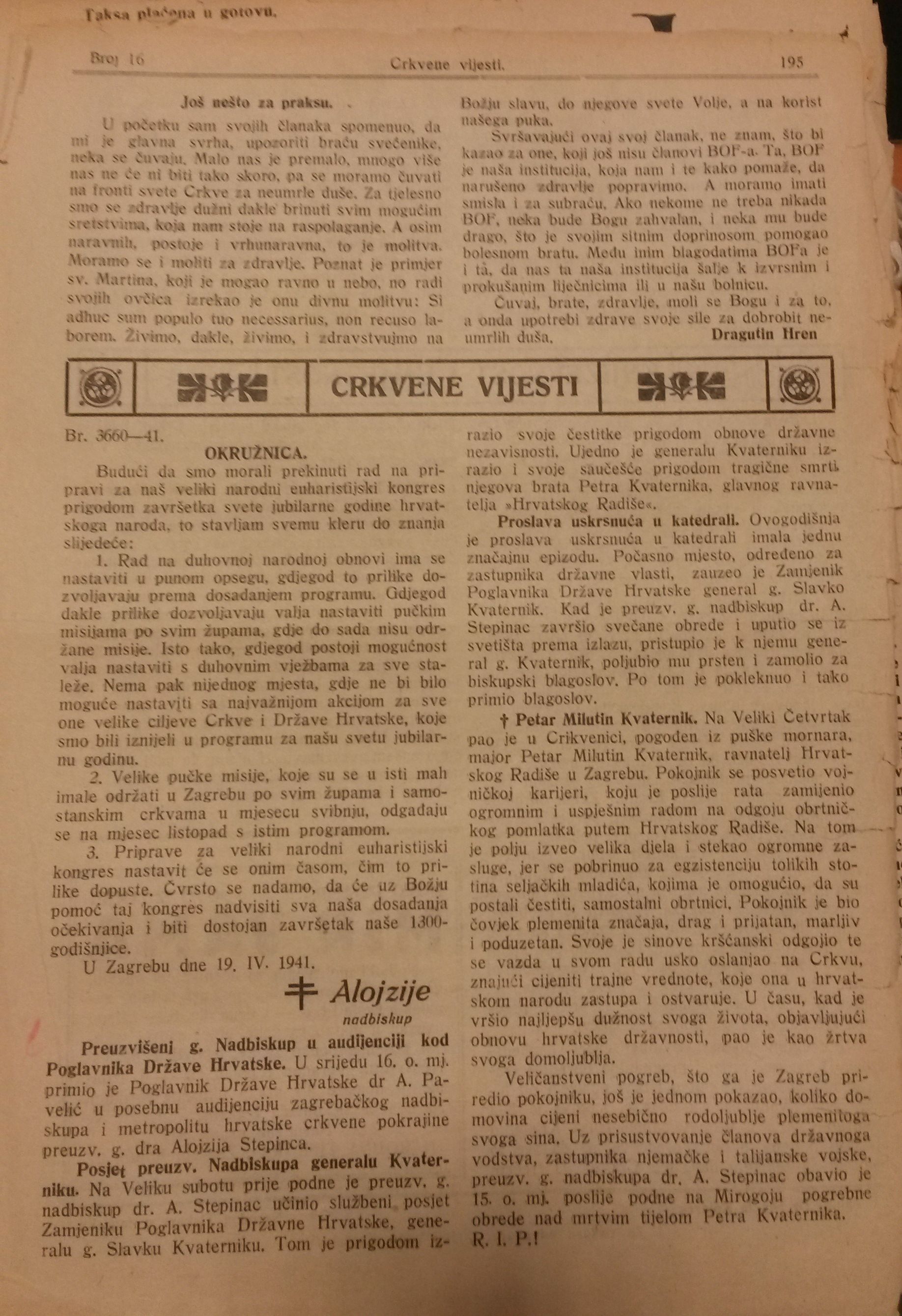Stepinac u istom broju šalje okružnicu za intenziviranje duhovne obnove i rada na programu obilježavanja jubilarne godine, "najvažnijom akcijom za sve one velike ciljeve Crkve i Države Hrvatske". Tu je i vijest da je 16. travnja Ante Pavelić primio u posebnu audijenciju preuzvišenog nadbiskupa Stepinca, no i da je nadbiskup službeno posjetio zamjenika poglavnika generala Slavka Kvaternika te izvještaj o veličanstvenom pogrebu Kvaternikova brata Milutina, stradalom u Crikvenici prilikom pokušaja uspostave vlasti NDH. Obred je održao Stepinac, uz članove državnog vodstva i zastupnike njemačke i talijanske vojske. O poginulom Kvaterniku se navodi da se uvijek u radu oslanjao na Crkvu, a "u času kad je vršio najljepšu dužnost svoga života, objavljujući obnovu hrvatske državnosti, pao je kao žrtva svoga domoljublja".