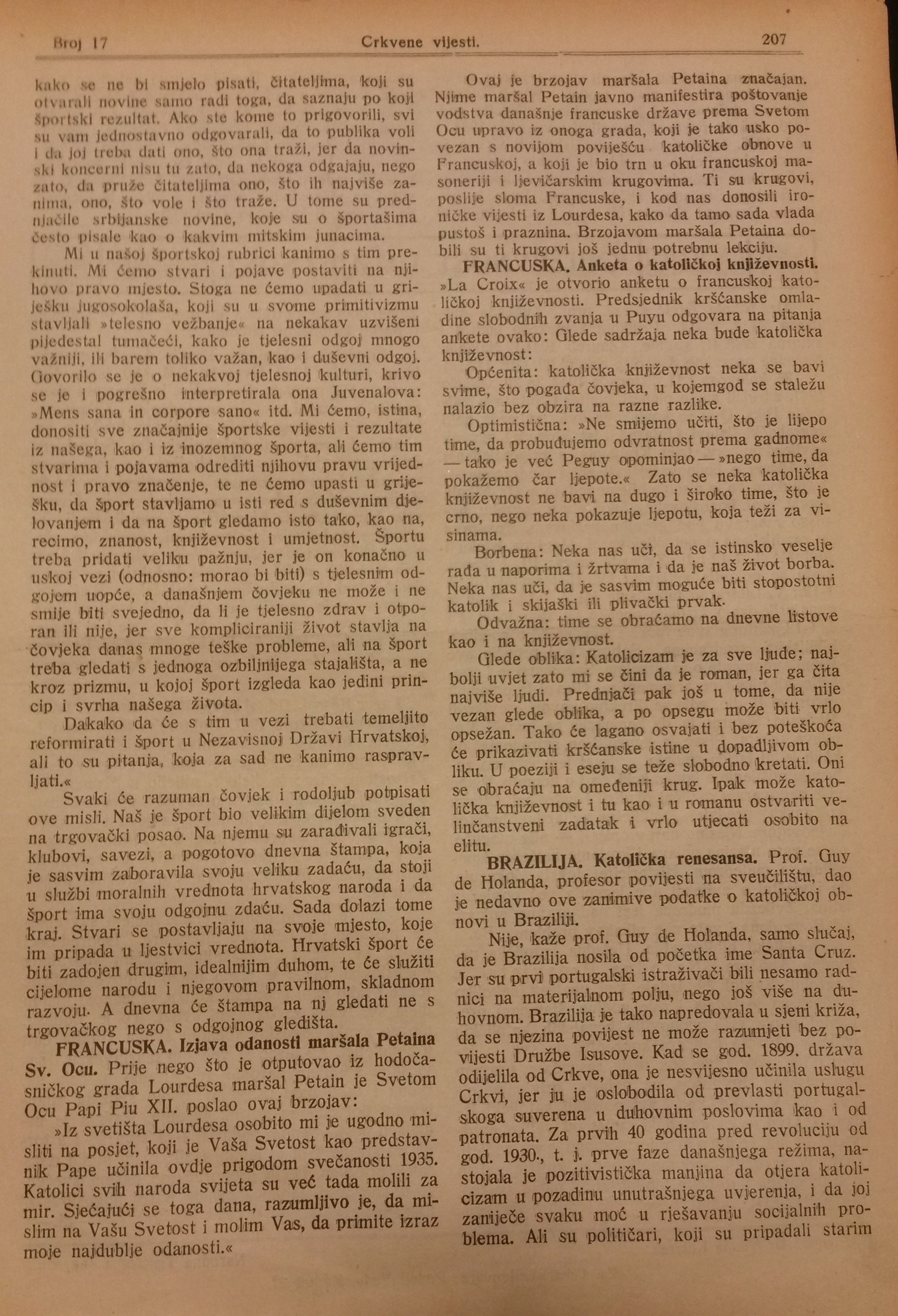 Broj donosi i vijest o francuskom kvislingu maršalu Petainu, koji je posjetio Lourdes i uputio pismo Papi, manifestirajući mu poštovanje upravo iz onog grada, "koji je bio trn u oku francuskoj masoneriji i ljevičarskim krugovima", što su širili vijesti da ondje vlada pustoš i praznina. Napisi o masoneriji su usko vezani za antisemitizam, što će se potvrditi u mnogo navrata.