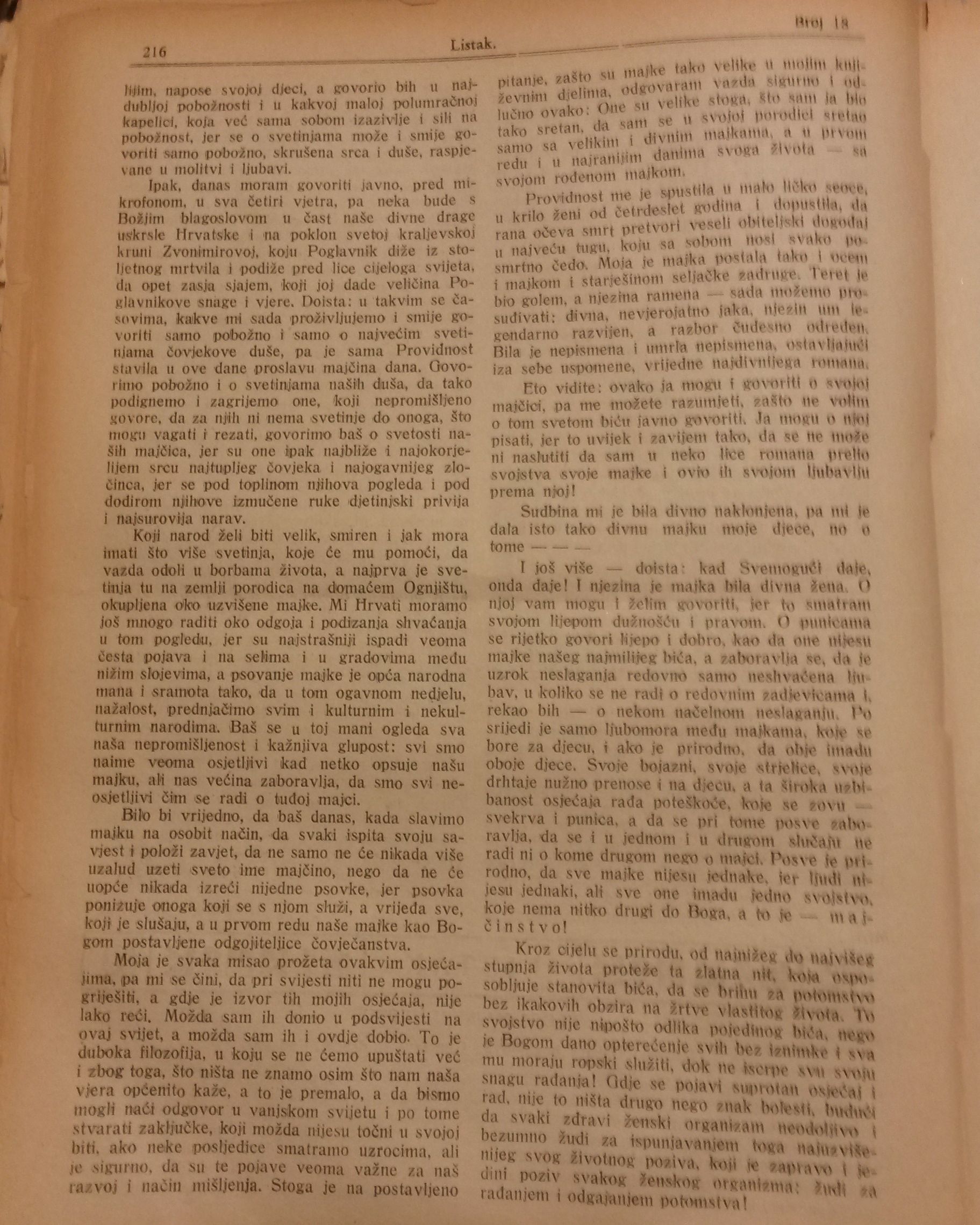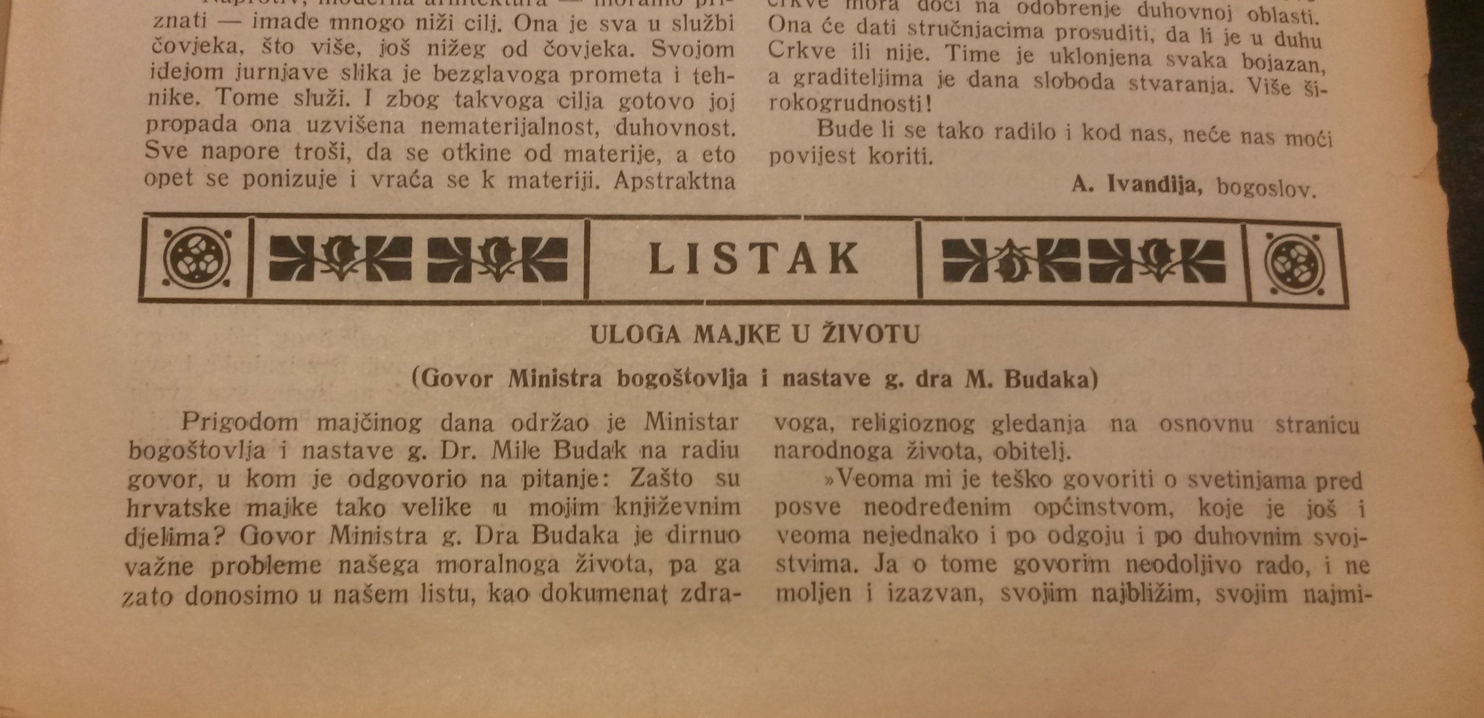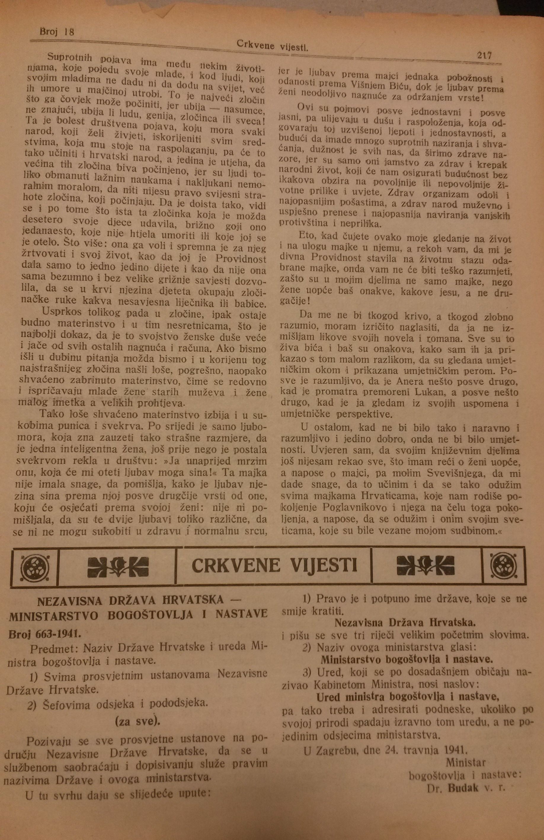 Sljedeći broj donosi govor ministra bogoštovlja, Mile Budaka o majčinstvu. Koristi sada već uvriježeni naziv za NDH, "uskrsla Hrvatska", koju je Poglavnik digao iz stoljetnog mrtvila. Na dnu treće stranice je i poziv svim školama da se ubuduće ministarstvu obraćaju pod punim novim imenom - Ministarstvo bogoštovlja i nastave.