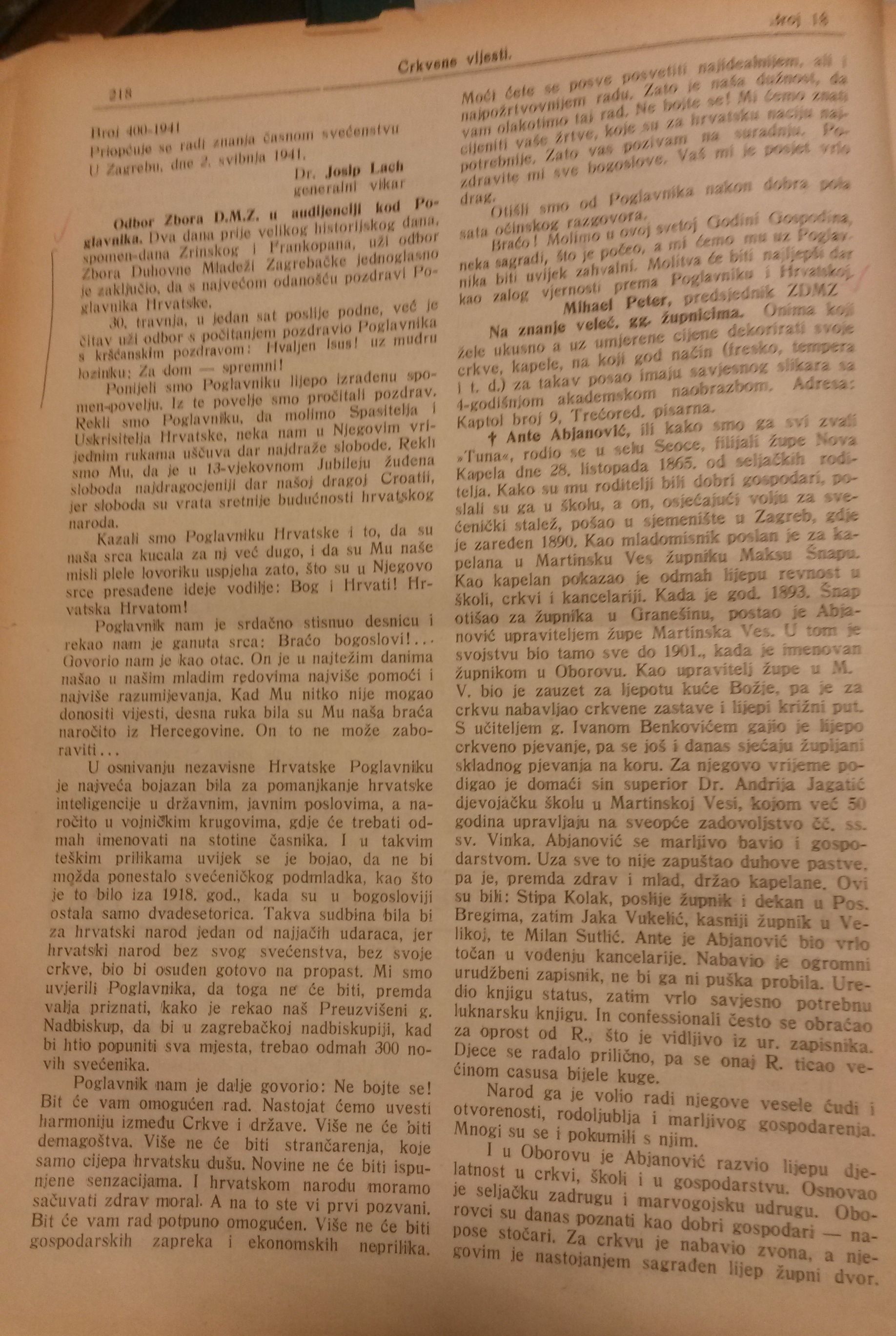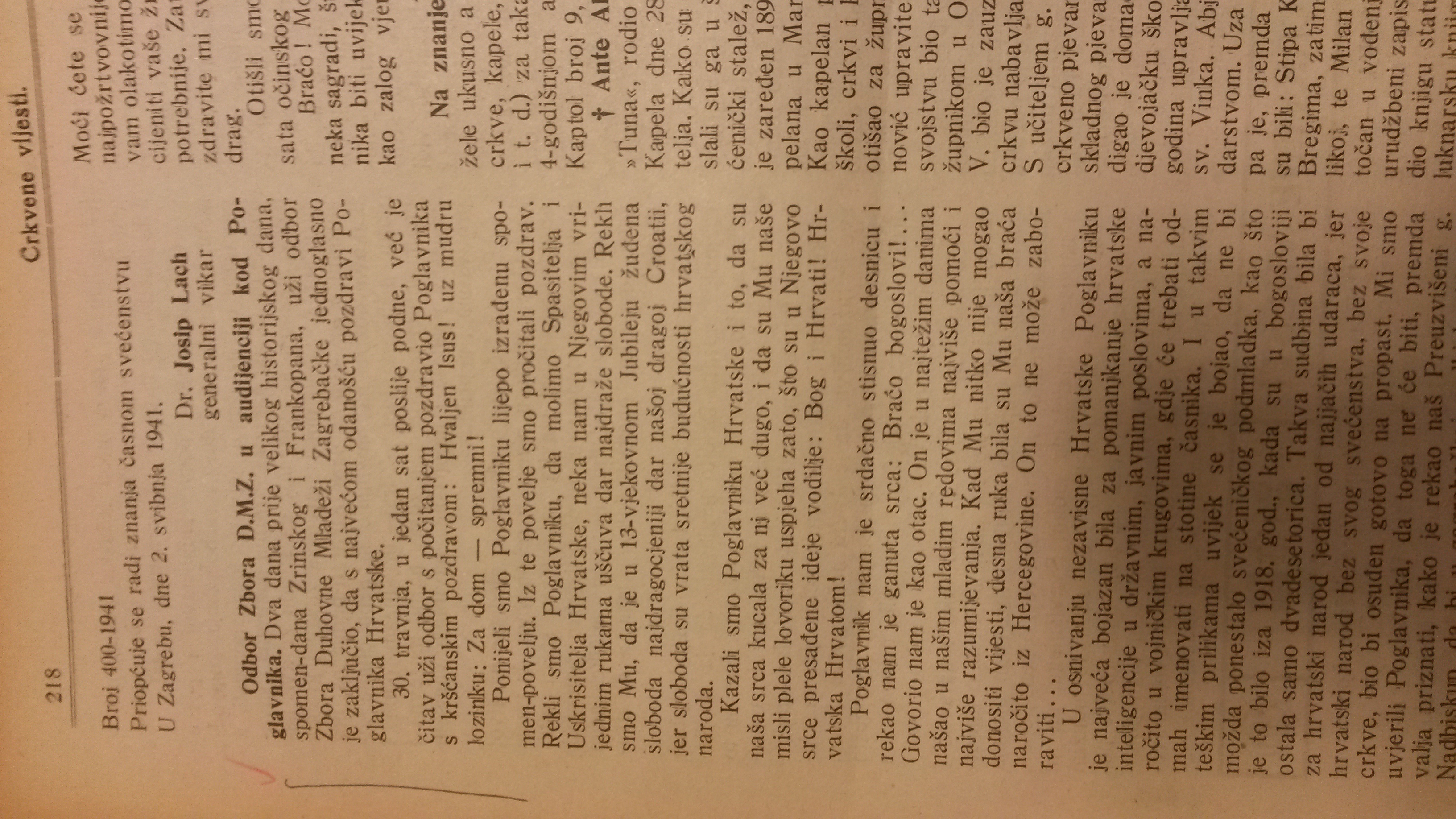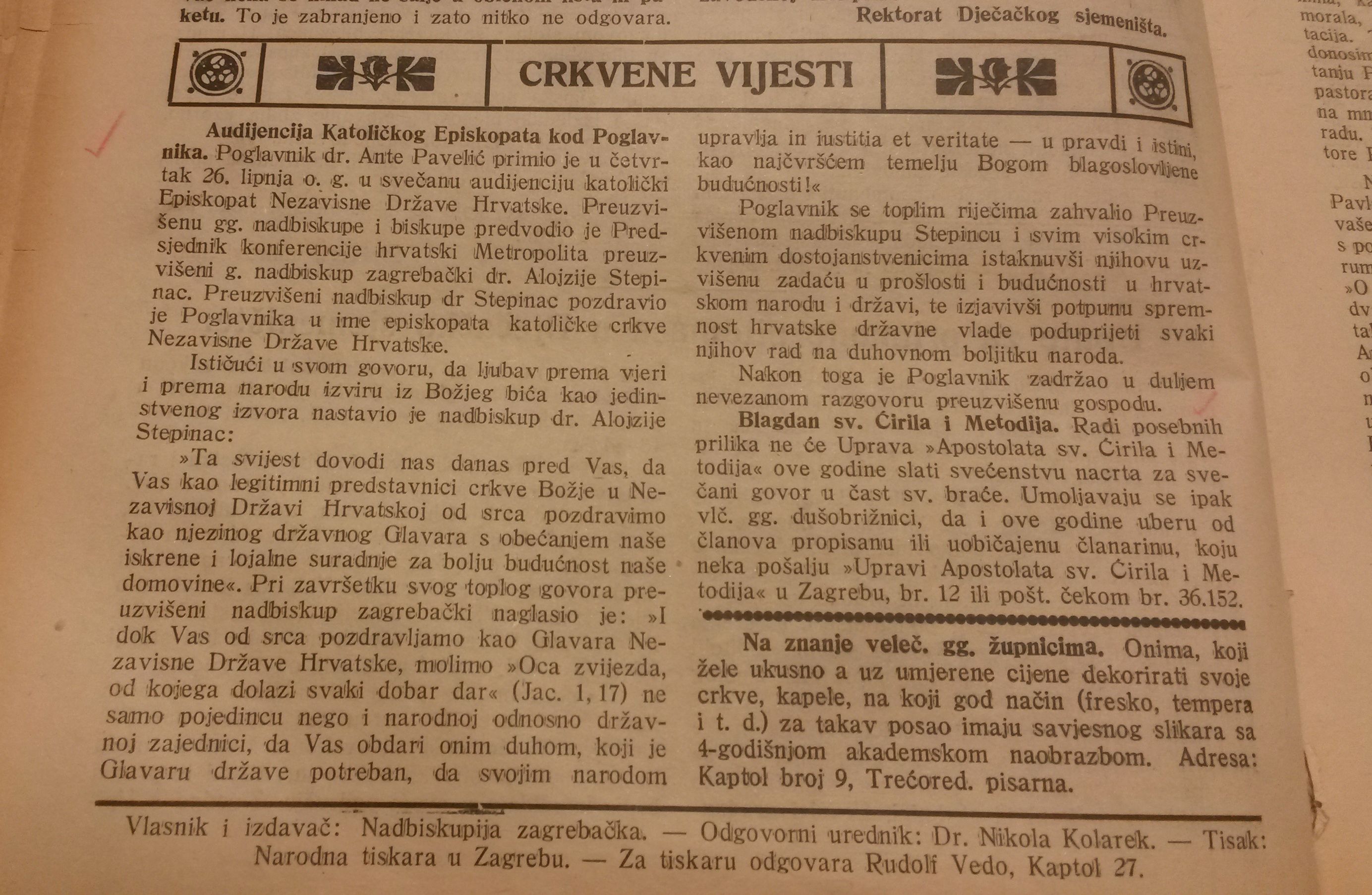 Katolički list izvještava i o audijenciji Episkopata kod Poglavnika, koji je predvodio Stepinac. Pozdravio ga je "od srca" kao jedan od legitimnih predstavnika crkve Božje u NDH, "s obećanjem naše iskrene i lojalne suradnje za bolju budućnost naše domovine". Ovaj mu se zahvalio i izjavio mu spremnost na pomoć u duhovnom radu, a onda su se zadržali "u duljem nevezanom razgovoru".
