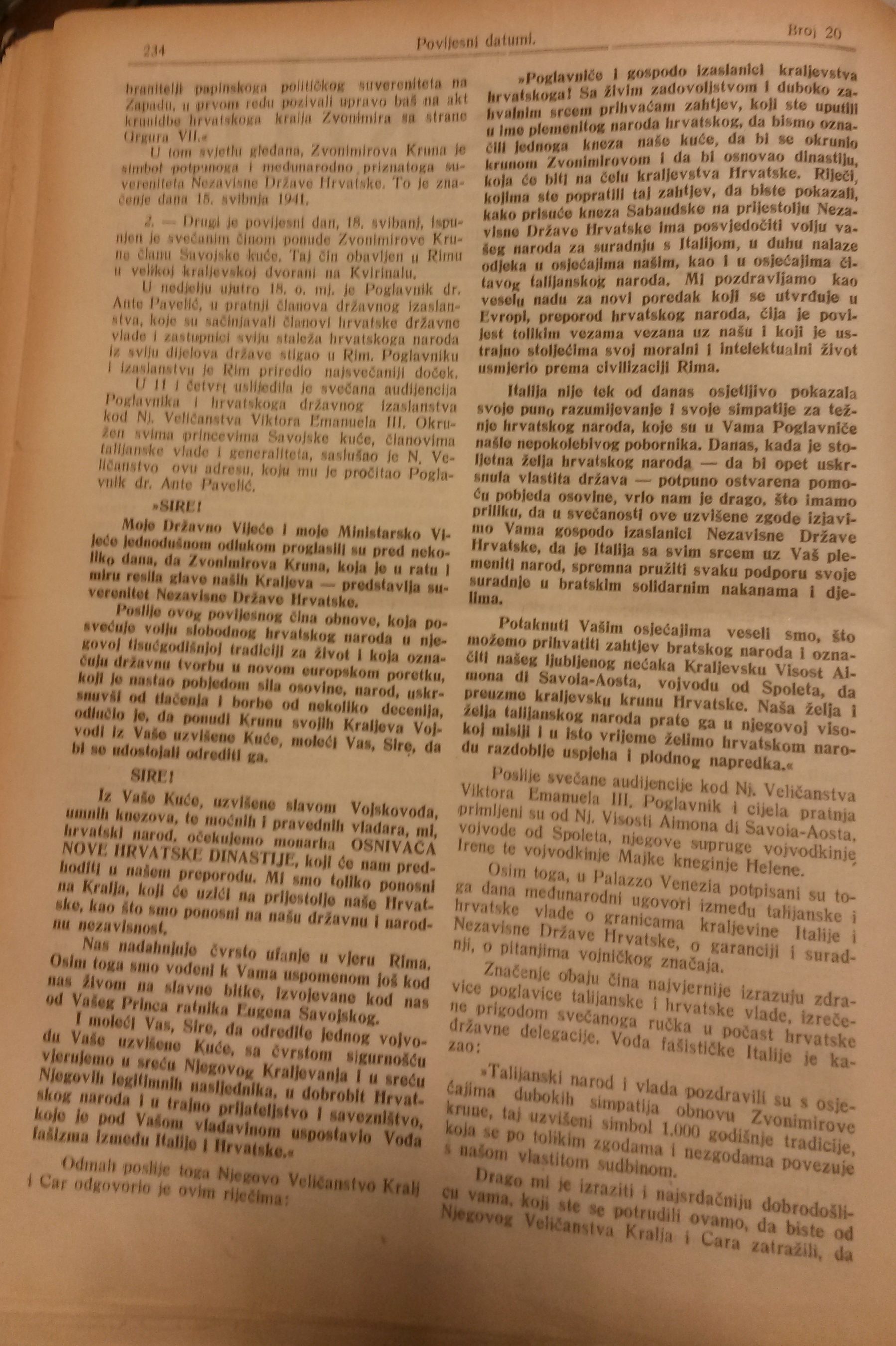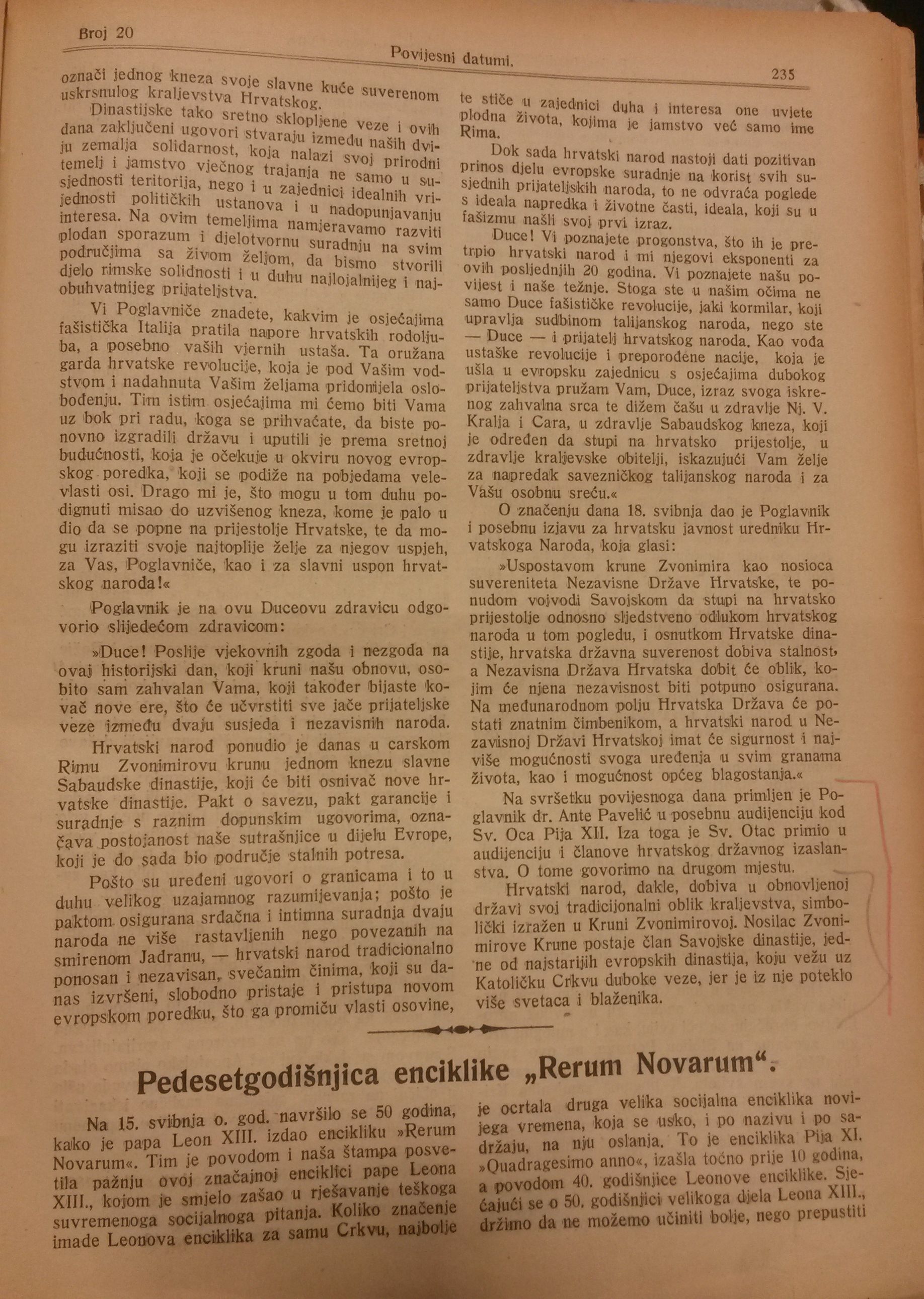 Broj 20 donosi interesantan izvještaj o posjeti Pavelića Italiji, pod naslovom "Povijesni datumi". Kao povijesni datum najprije je predstavljena nedavna odluka Poglavnika da kruna Kralja Zvonimira predstavlja suverenitet NDH, 15. svibnja. S tom je krunom Pavelić otišao u Rim vidjeti Viktora Emanuela III., nudeći tri dana kasnije, 18. svibnja, tu istu krunu članu Savojske kuće, kako bi osnovao dinastiju, koja će biti na čelu kraljevstva Hrvatske.