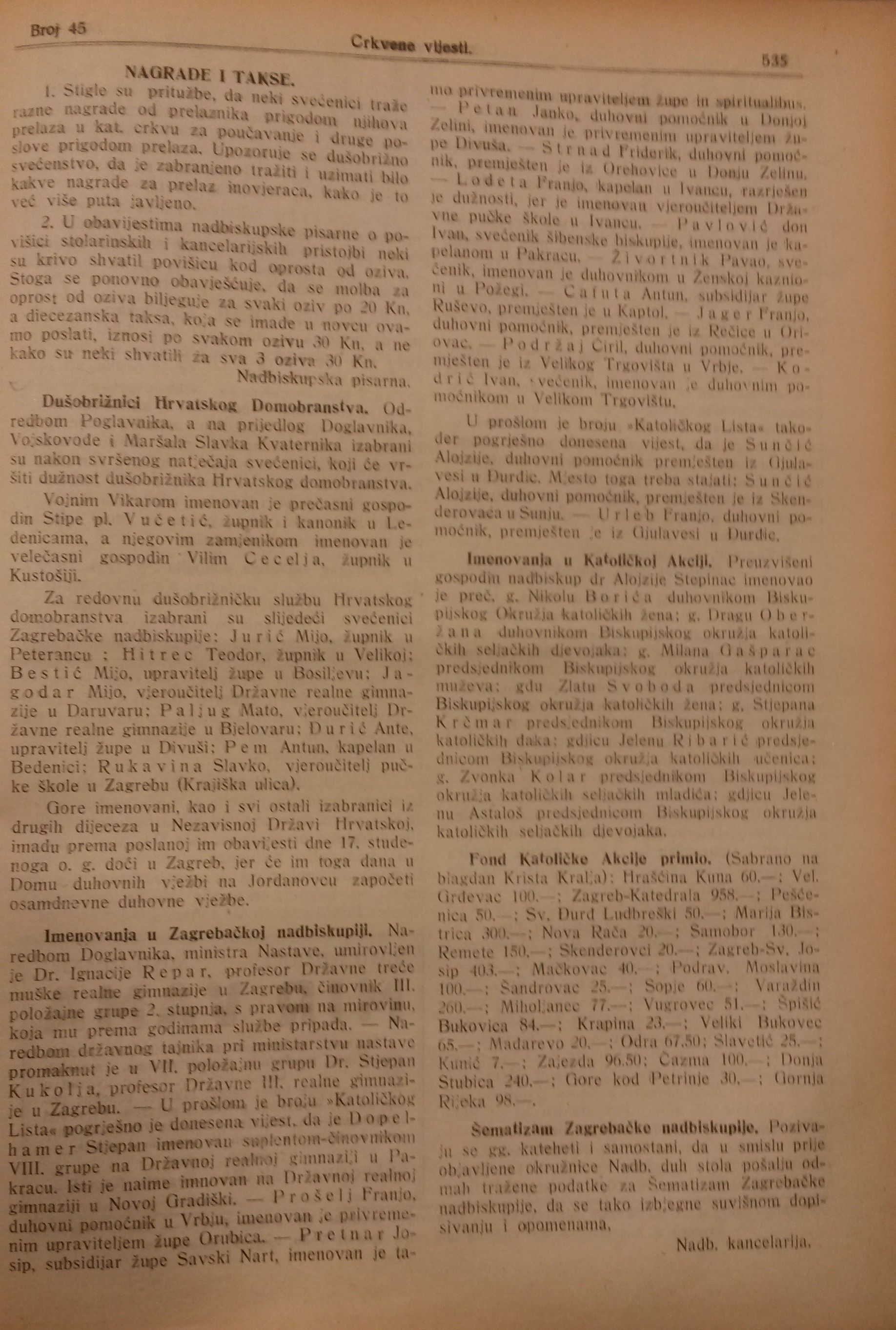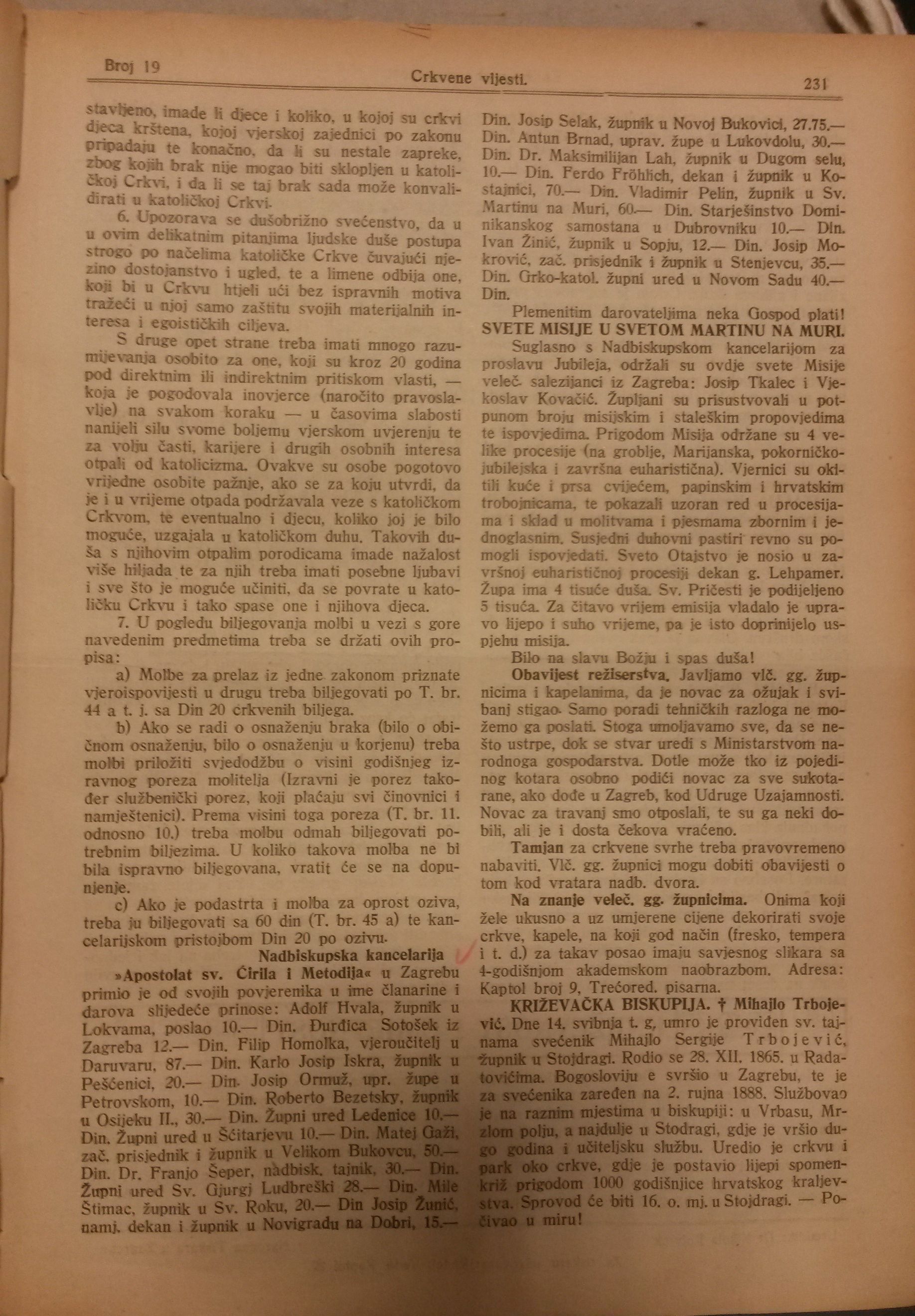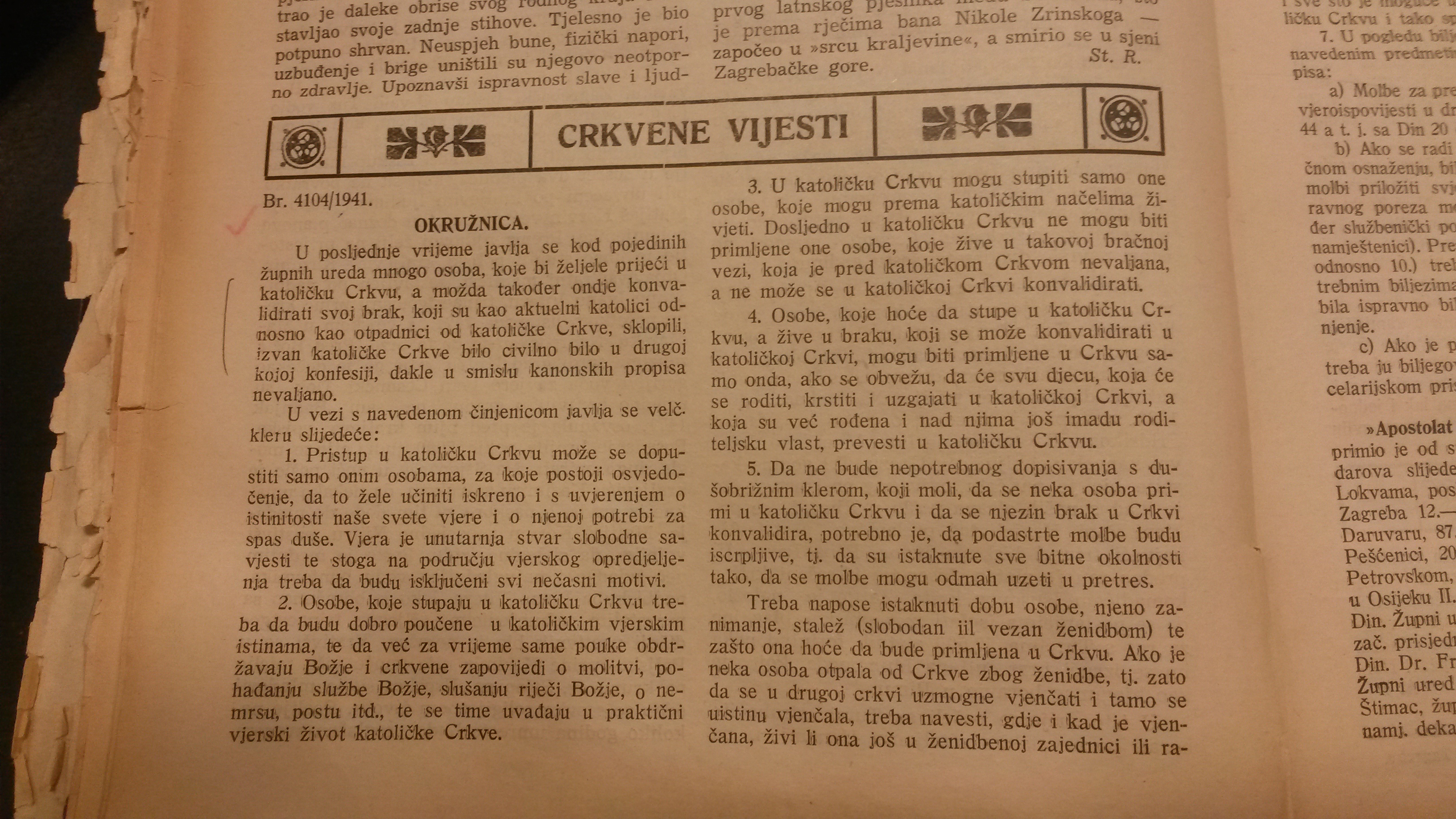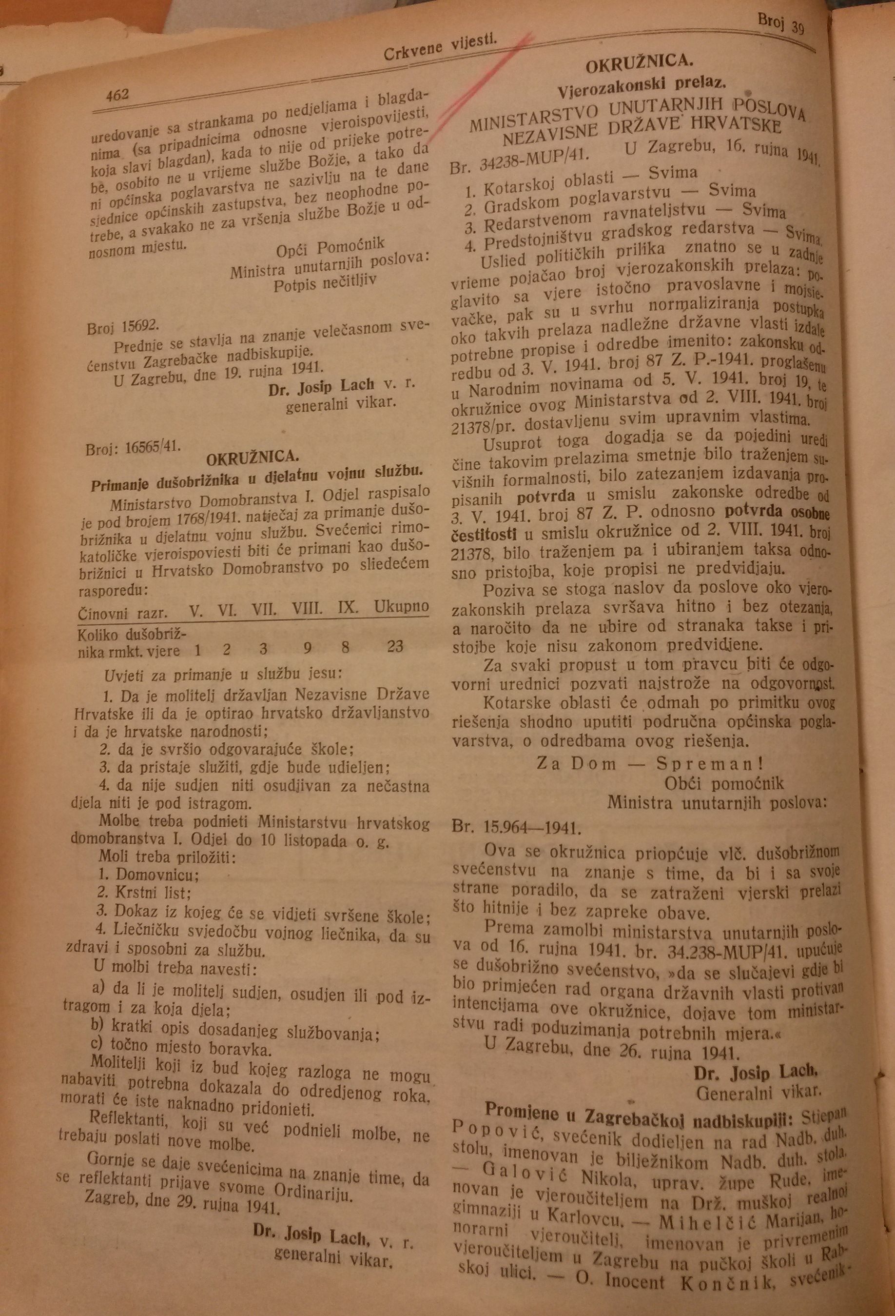 List prenosi i okružnicu vikara Josipa Lacha, na temelju naredbe MUP-a da se vjerski prijelazi svršavaju "hitno i bez otezanja". Pojedini uredi, zamjera MUP, rade smetnje "traženjem suvišnih formalnosti, bilo zatezanjem izdavanja propisanih potvrda... odnosno potvrda osobne čestitosti... bilo traženjem pa i ubiranjem taksa, odnosno pristojbi koje propisi ne predviđaju". Prijeti i pozivanjem na odgovornost.