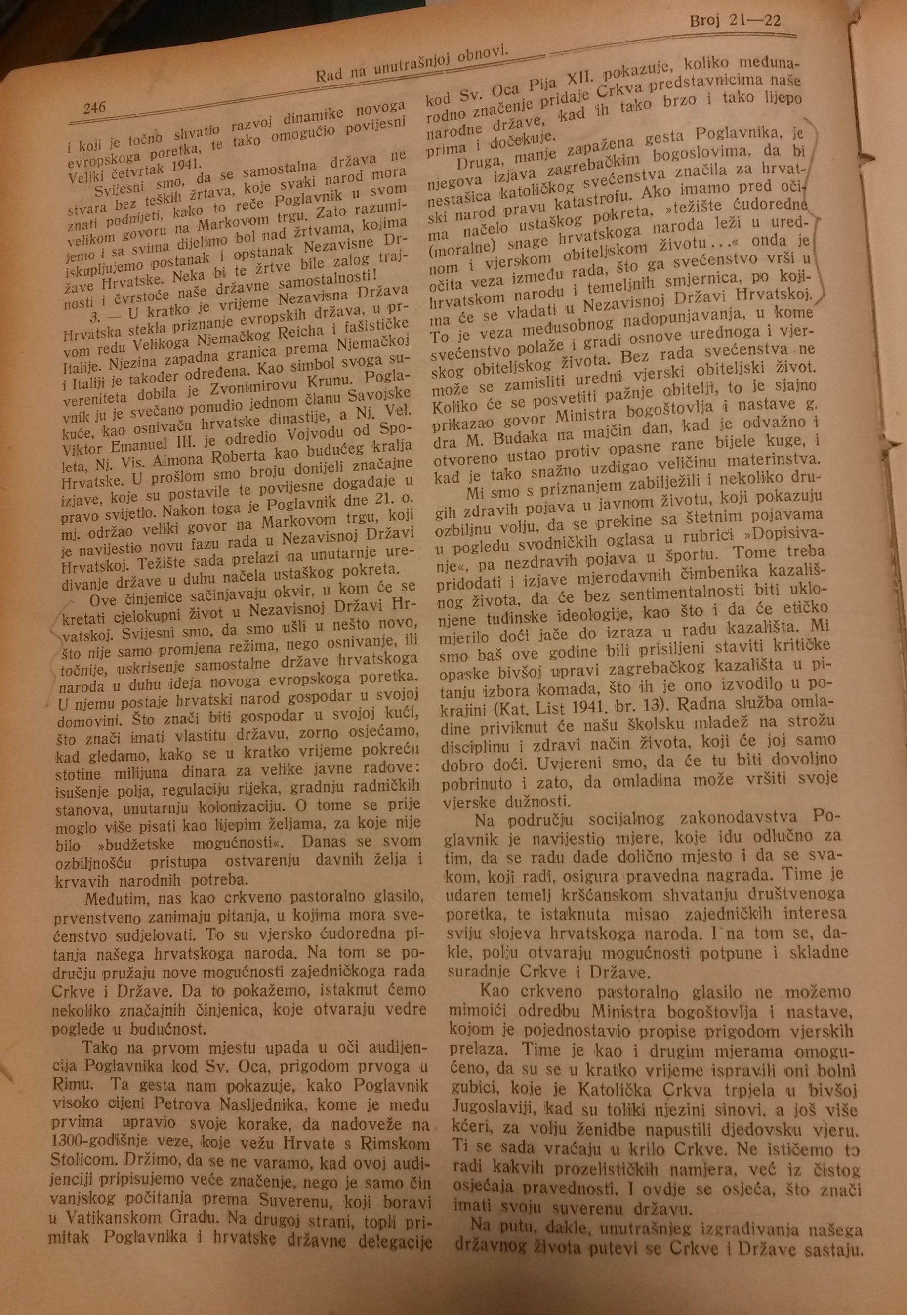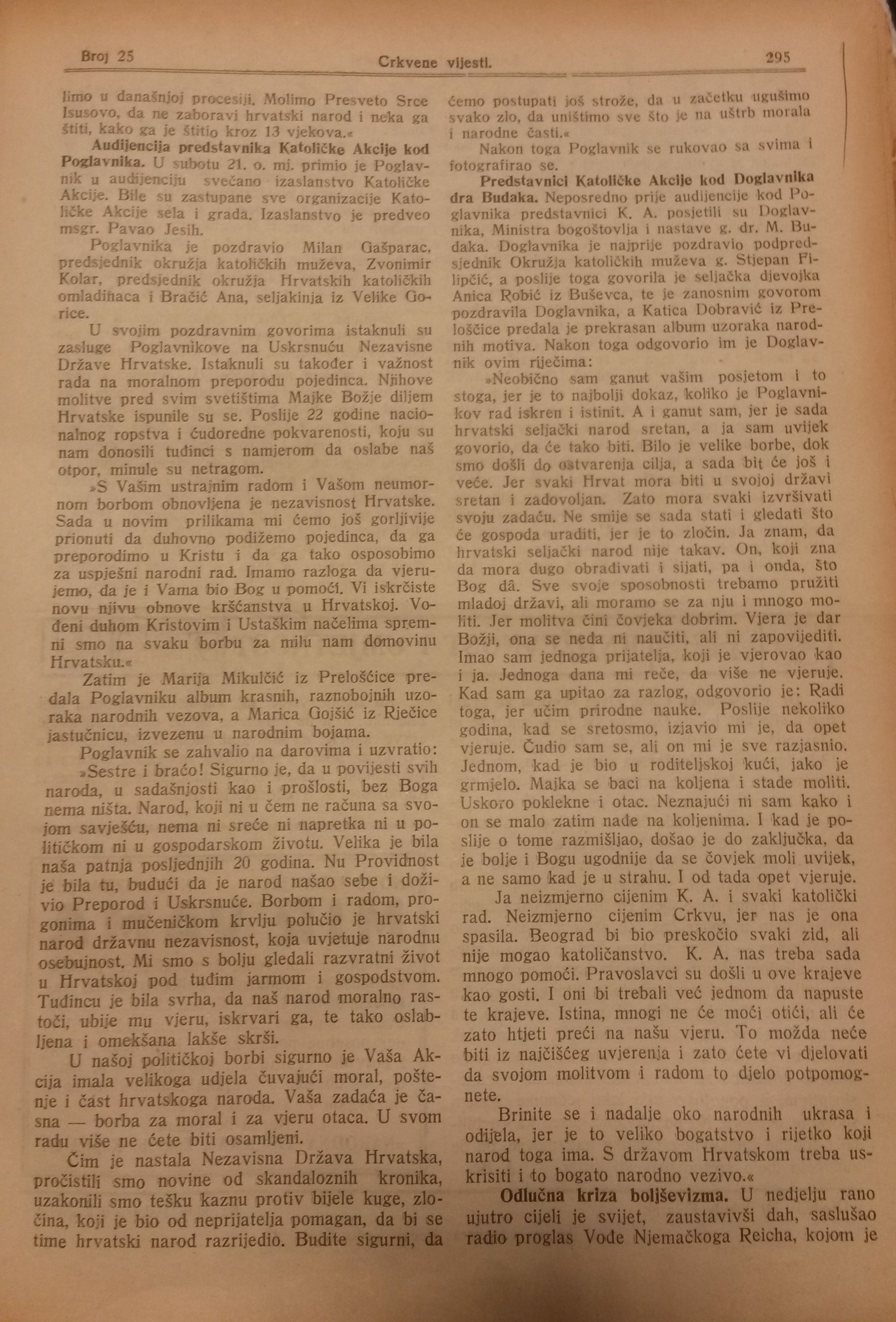 Isti broj izvještava o Poglavnikovom susretu s predstavnicima Katoličke akcije, koja je puna govora o uskrsnuću NDH, vjeri da će Bog biti u pomoći i spremnosti da vođeni duhom Kristovim i ustaškim načelima vodimo borbu za domovinu. Izvještaj završava poglavnikovim izlaganjem da su novine očišćene od skandaloznih kronika, ozakonjena je teška kazna protiv bijele kuge, a obećava im i da će još strože, u začetku ugušiti "svako zlo, uništiti sve što je na uštrb morala i narodne časti". Katolička akcija istoga dana od doglavnika Budaka dobiva konkretan plan: "Pravoslavci su došli u ove krajeve kao gosti. I oni bi trebali već jednom da napuste te krajeve. Istina, mnogi ne će moći otići, ali će zato htjeti preći na našu vjeru. To možda neće biti iz najčišćeg uvjerenje i zato ćete vi djelovati da svojom molitvom to djelo potpomognete".