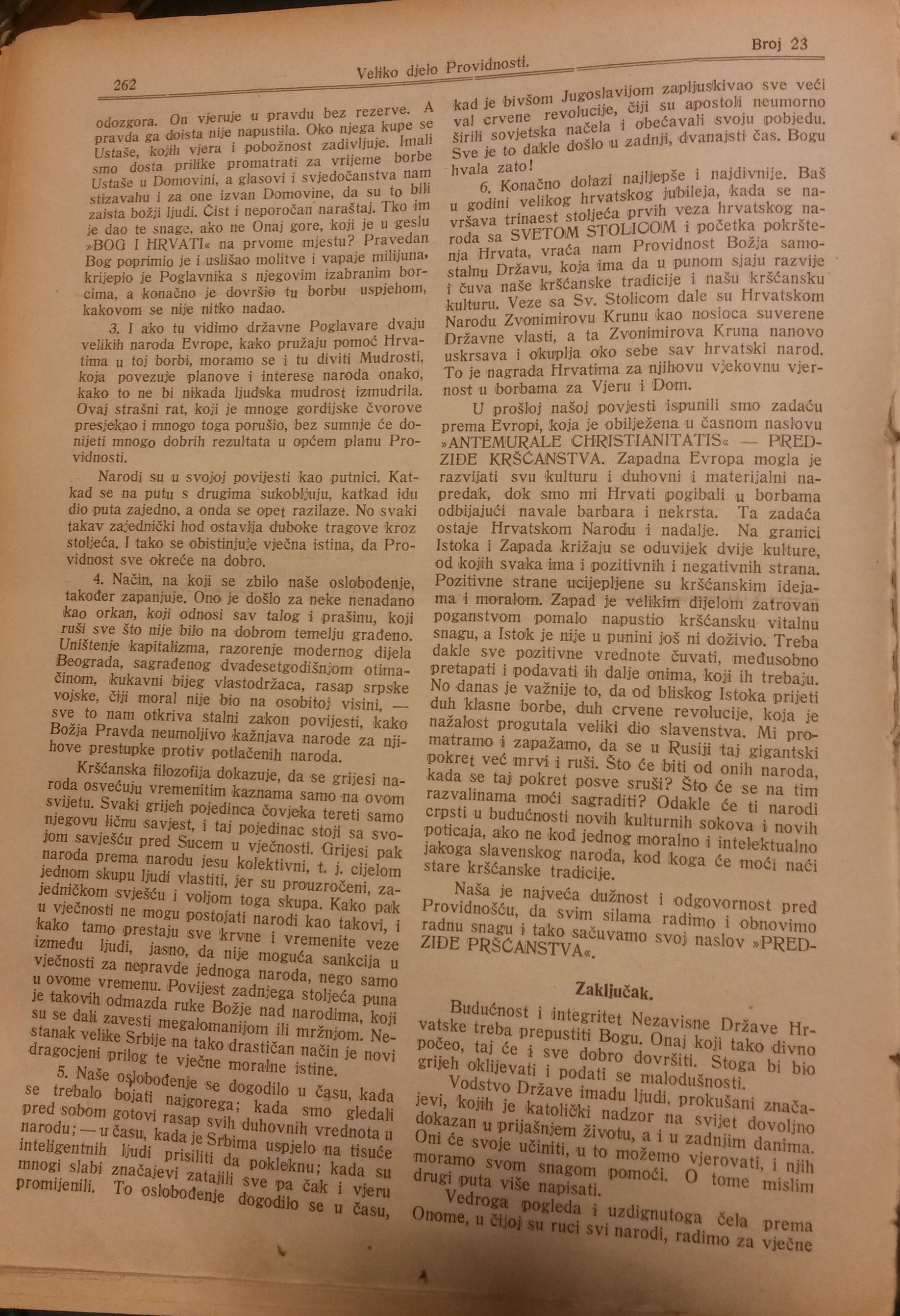 "Veliko djelo Providnosti" je zabrinjavajući tekst Vilima Nuka u kojemu se slavi dva mjeseca od uspostave NDH. Ne zato što je Slavko Kvaternik pripisuje Božjoj Providnosti, volji saveznika, požrtvovnosti Pavelića... A Stepinac u okružnici kleru od 28. travnja navodi: "I tko nam može zamjeriti, ako i mi kao duhovni pastiri dajemo svoj prinos narodnom veselju i zanosu, kad se puni dubokog ganuća i tople zahvalnosti obraćamo Božjem Veličanstvu? Jer koliko god i bilo zamršeno pletivo današnjih sudbonosnih događaja... ipak je lako razabrati ruku božju na djelu", nego zato što u nastavku autor "izvodi dokaze da je NDH djelo božje providnosti" i pravde, zbog zapanjujućeg načina na koji je došlo do oslobođenja. "Nenadano kao orkan, koji odnosi sav talog i prašinu, koji ruši sve što nije bilo na dobrom temelju građeno" - tu nabraja "razorenje modernog dijela Beograda, sagrađenog dvadesetogodišnjom otimačinom, kukavni bijeg vlastodržaca, rasap srpske vojske..." Božja Pravda neumoljivo kažnjava narode za njihove postupke protiv potlačenih. Zaključuje da vjeruje u budućnost NDH, jer vjeruje u Božju Pravdu.