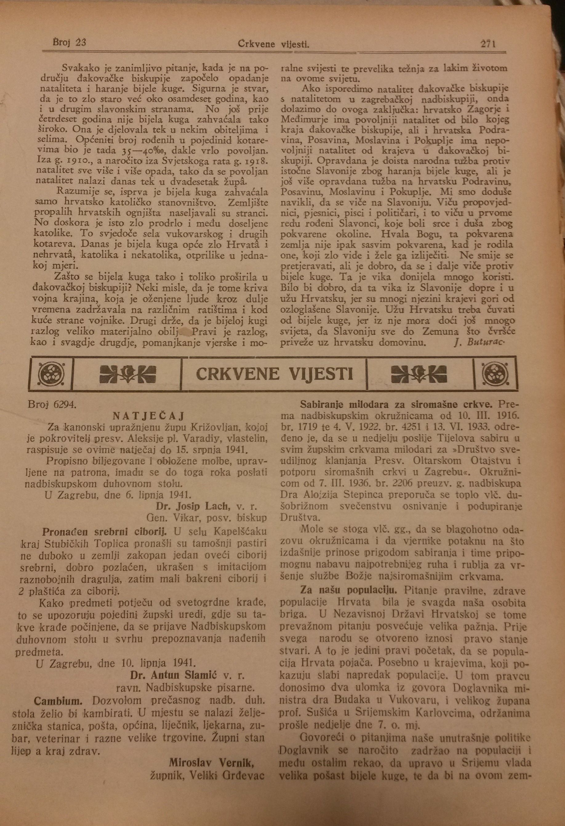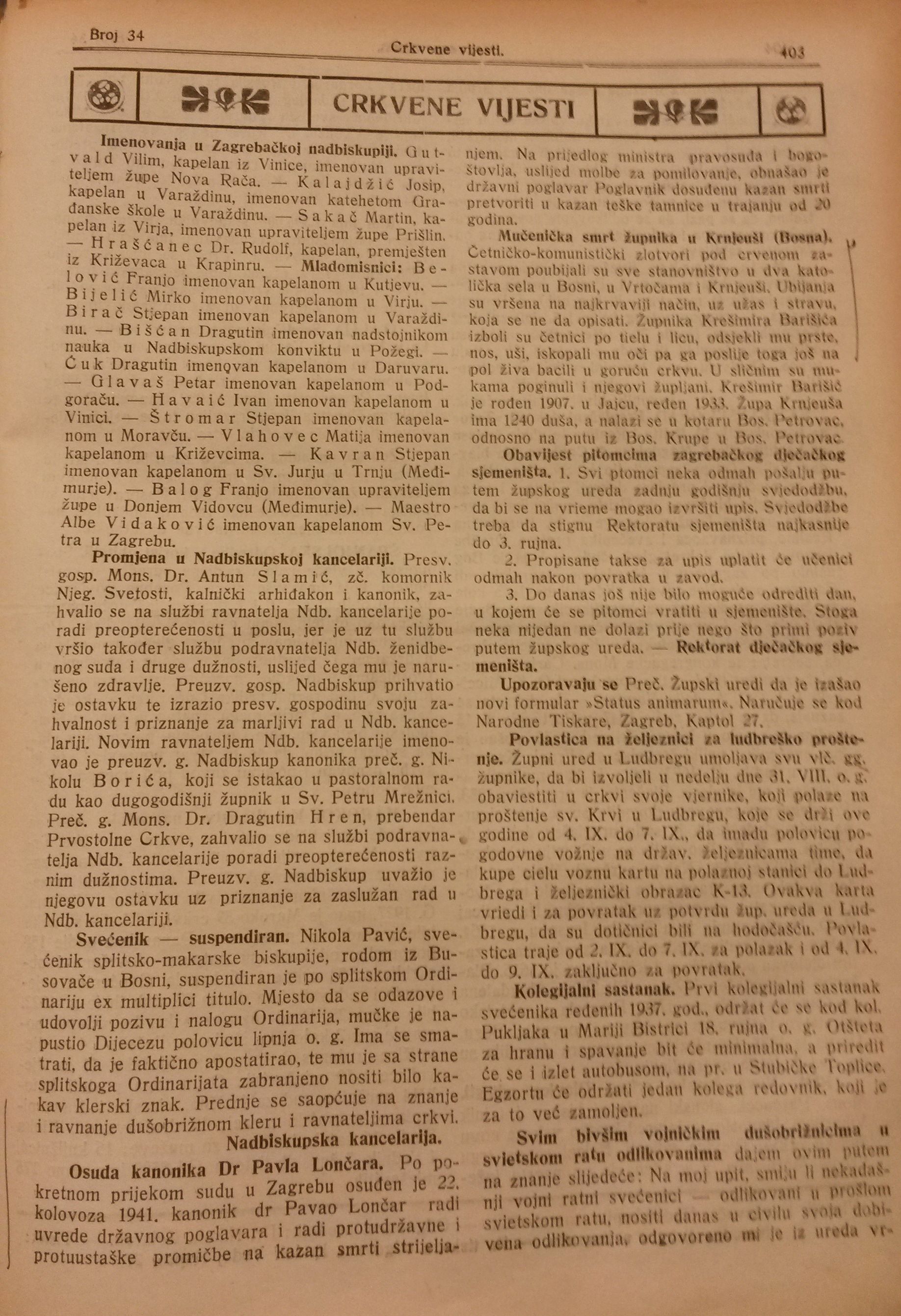 Katolički list, kao što se da vidjeti, ne izvještava o žrtvama rata. No to se mijenja u idućem broju. On donosi tri vijesti o svećenicima - suspenzija Busovljaka Nikole Pavića, bez objašnjenja, osuda drugog na smrt te užasna tortura i ubojstvo trećeg. Župnik Krešimir Barišić ubijen je zajedno sa župljanima u Krnjeuši, pored Bosanskog Petrovca, kako se navodi, od strane četničko-komunističkih zlotvora. Opisuje se da je mučen odsijecanjem dijelova tijela i lica, nakon čega je polumrtav bačen u goruću crkvu. Kanonik Pavle Lončar radi uvrede državnog poglavara i radi protuustaške promičbe je osuđen na strijeljanje, no pomilovan je voljom Poglavnika i osuđen na 20-godišnju tamnicu.