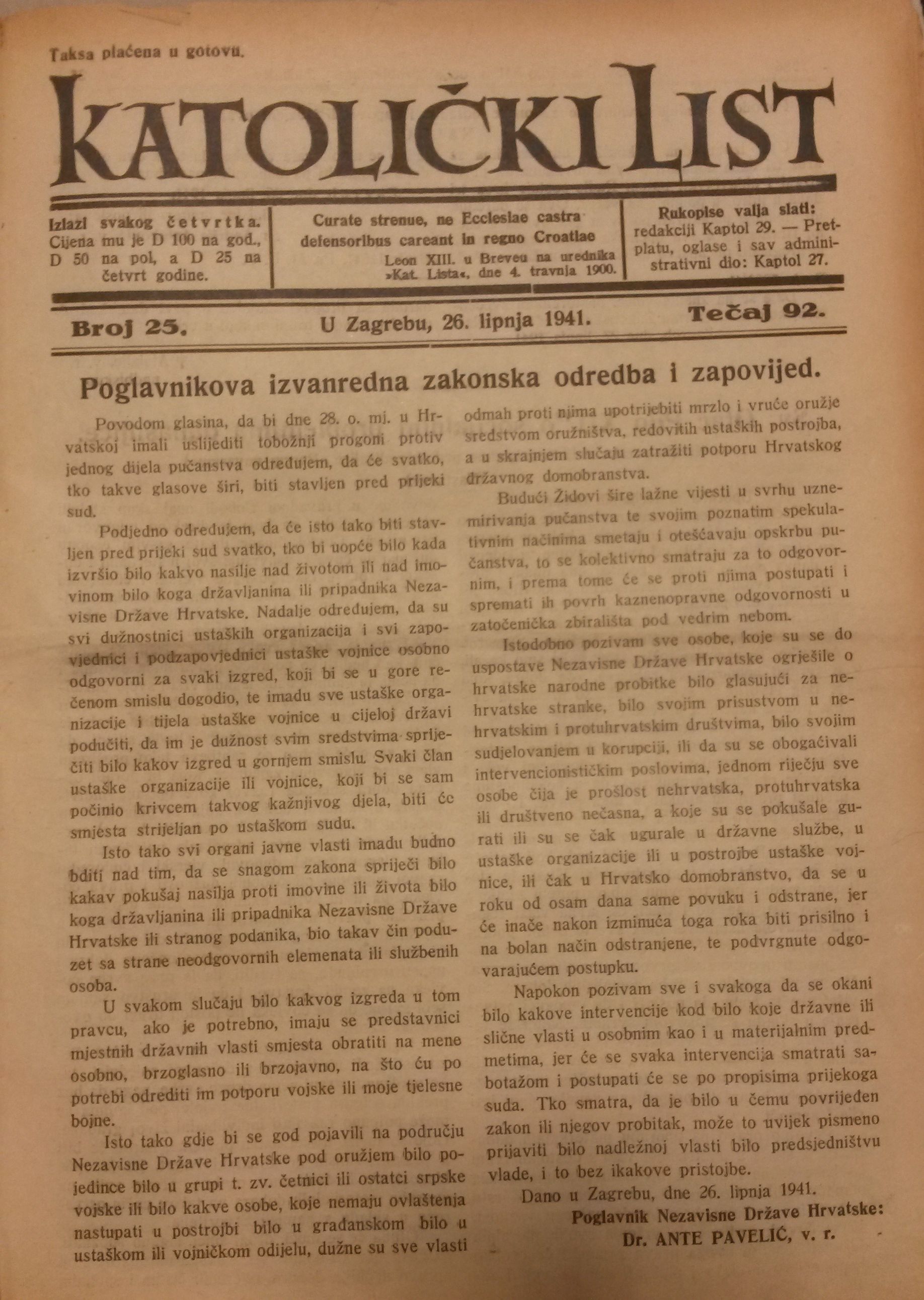 "Budući Židovi šire lažne vijesti u svrhu uznemiravanja pučanstva te svojim poznatim spekulativnim načinima smetaju i otešćavaju opskrbu pučanstva, te se kolektivno smatraju za to odgovornim i prema tome će se proti njima postupati i spremati ih povrh kaznenopopravne odgovornosti u zatočenička zbirališta pod vedrim nebom". Ovo je dio Poglavnikove izvanredne zakonske odredbe i zapovijedi, koja je izdana 26. lipnja "povodom glasina da bi 28. o. mj. u Hrvatskoj imali uslijediti tobožnji progoni protiv jednog dijela pučanstva". Osim što su Židovi na ovoj naslovnici Katoličkog lista već kolektivno proglašenim krivim za ovaj prijestup i upućeni u logore, prijeki se sud obećava svima koji budu širili glasine o "tobožnjem progonu dijela pučanstva".