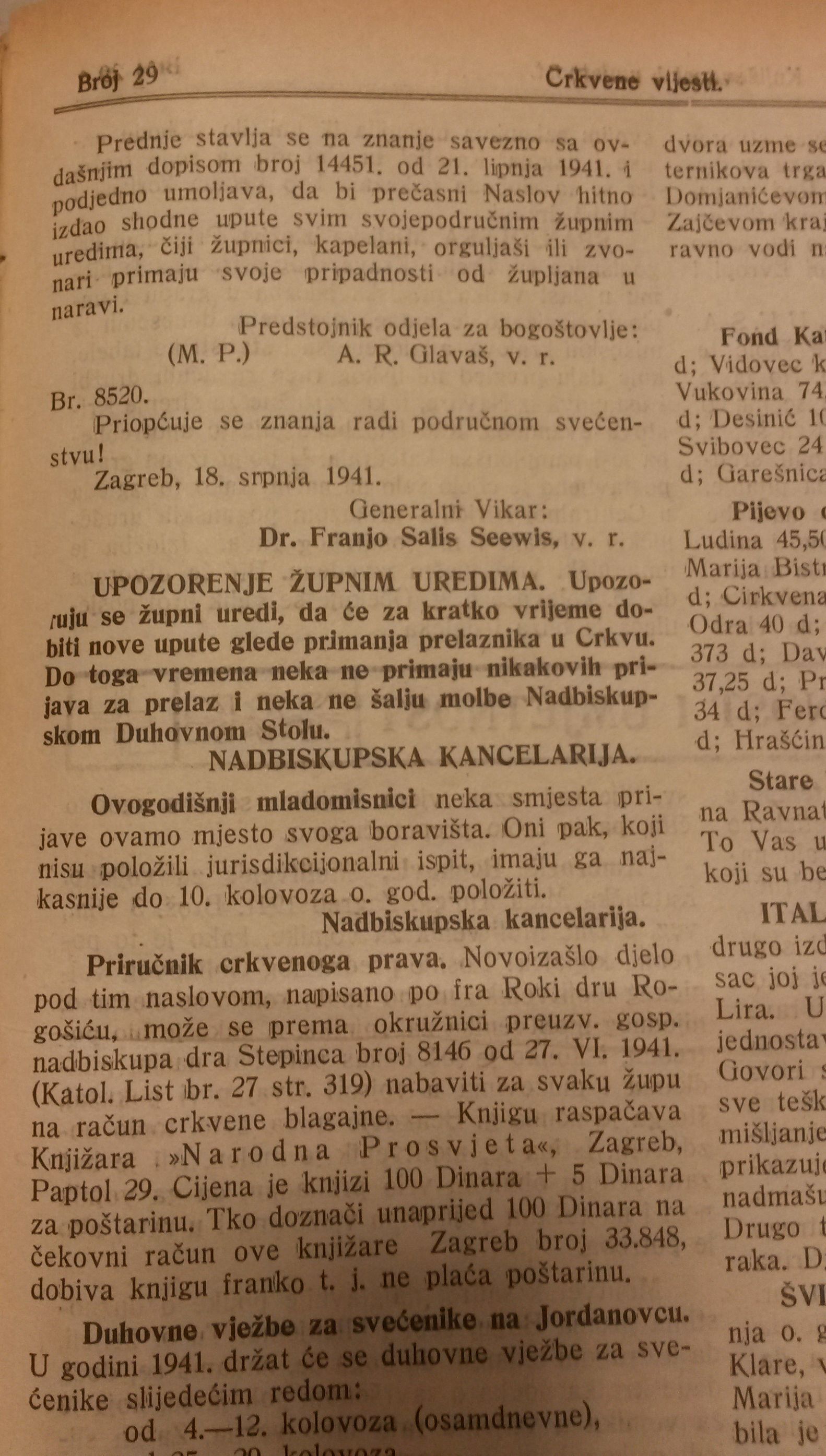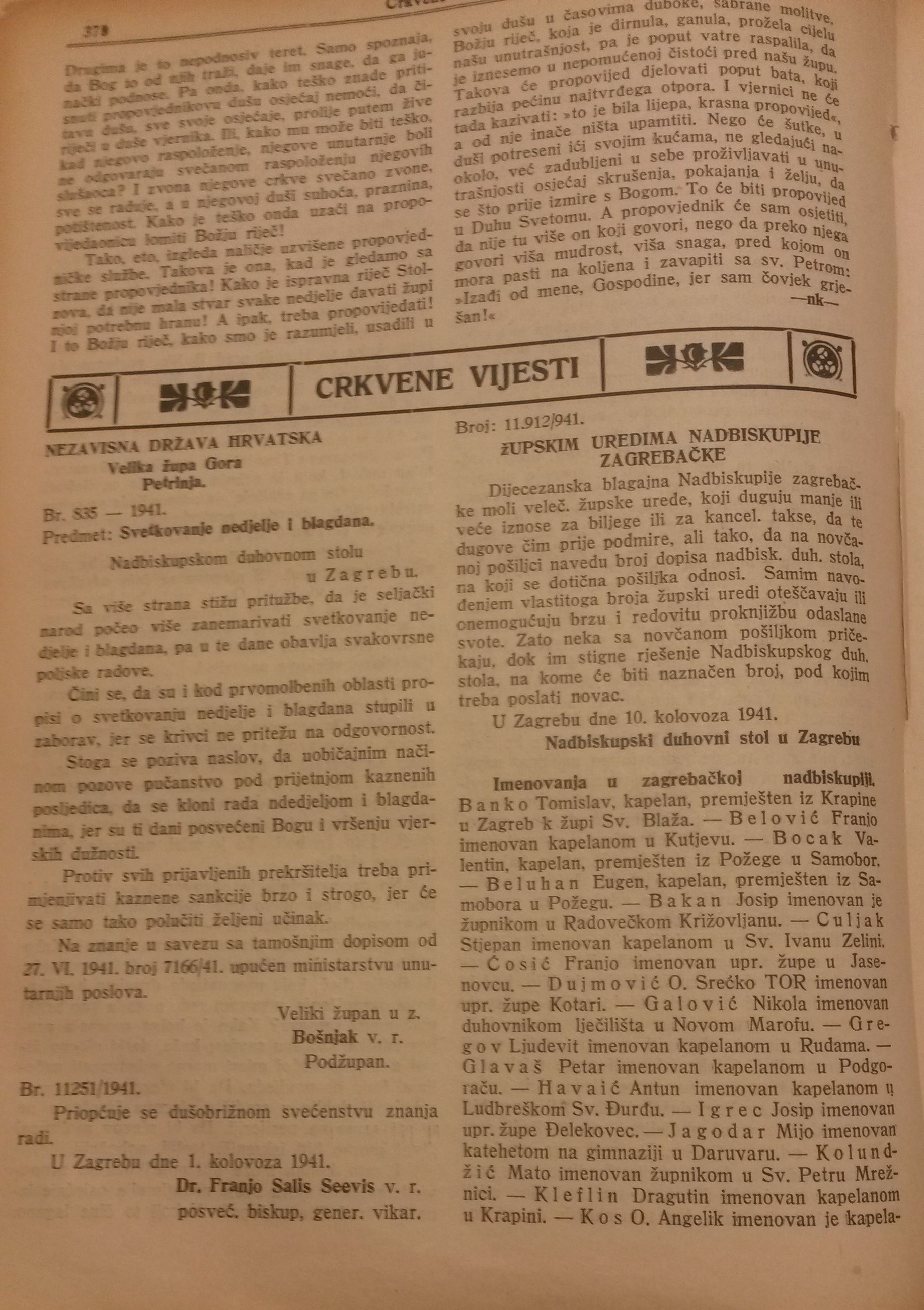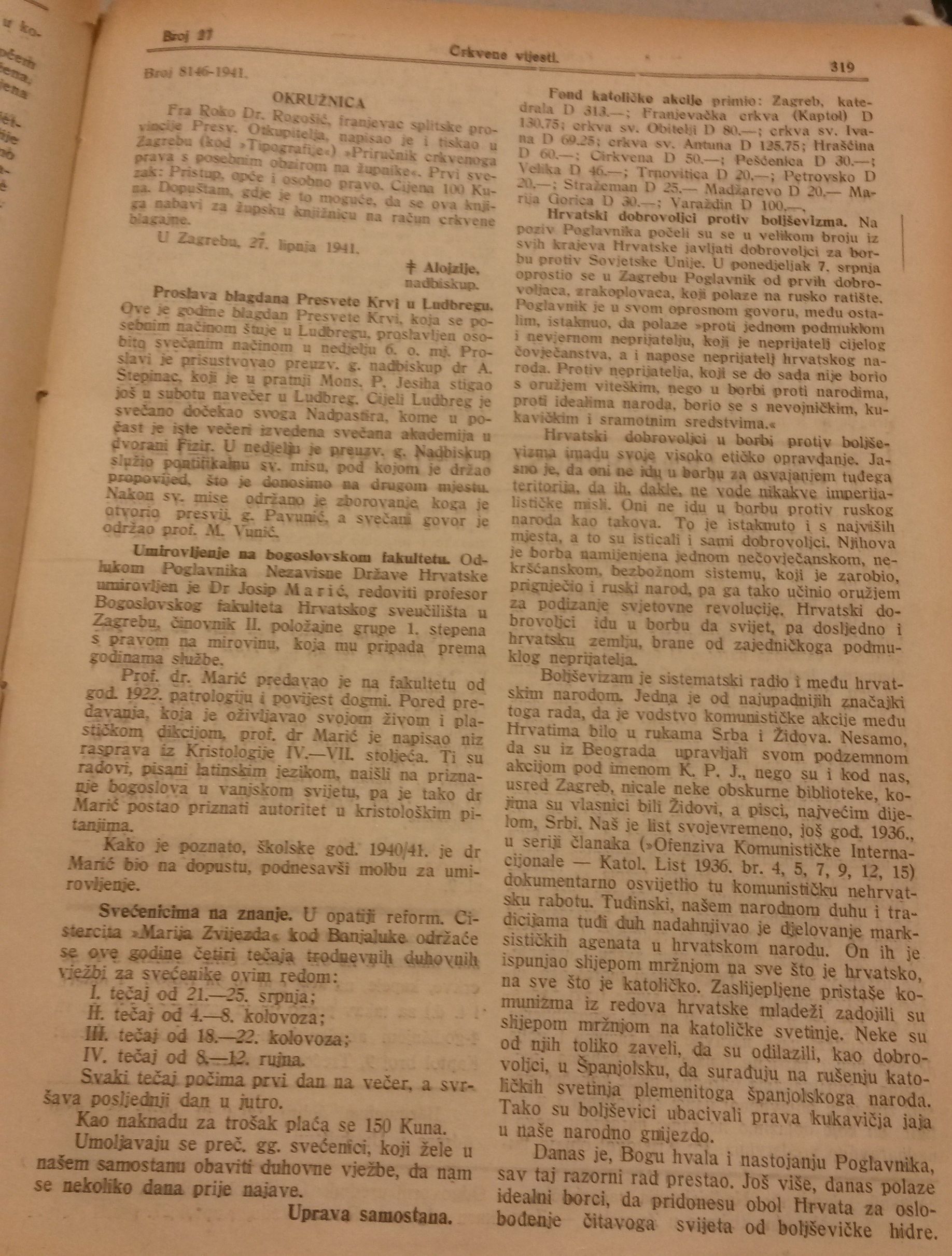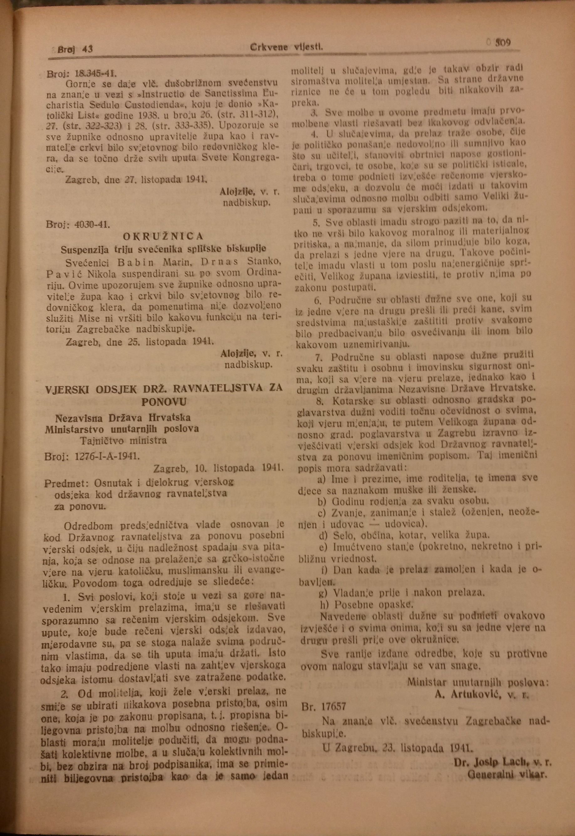 Ova će se odredba oglašavati i preko oltara, po nalogu šefa MUP-a Andrije Artukovića, koju je u idućem broju oglasio Stepinac.