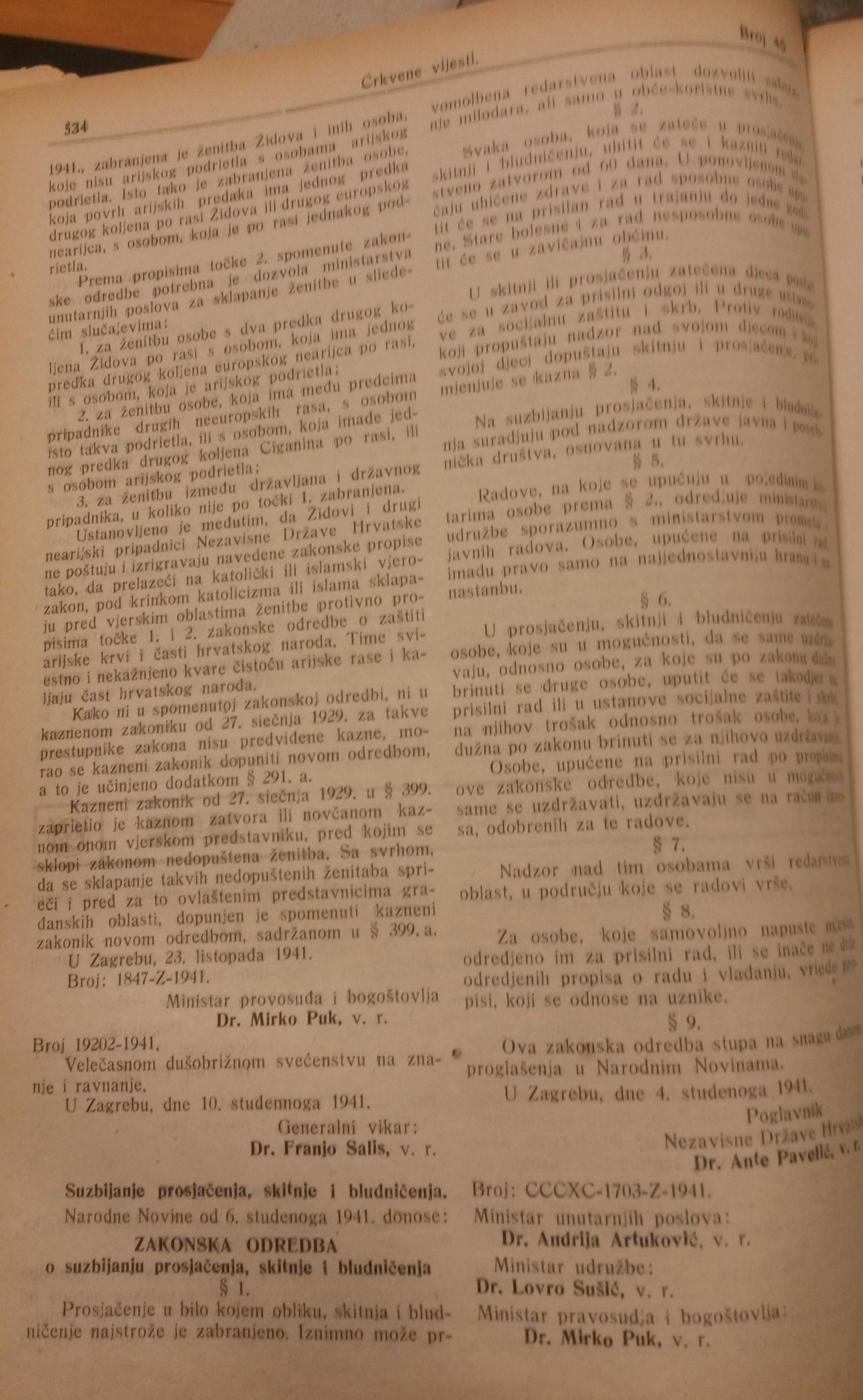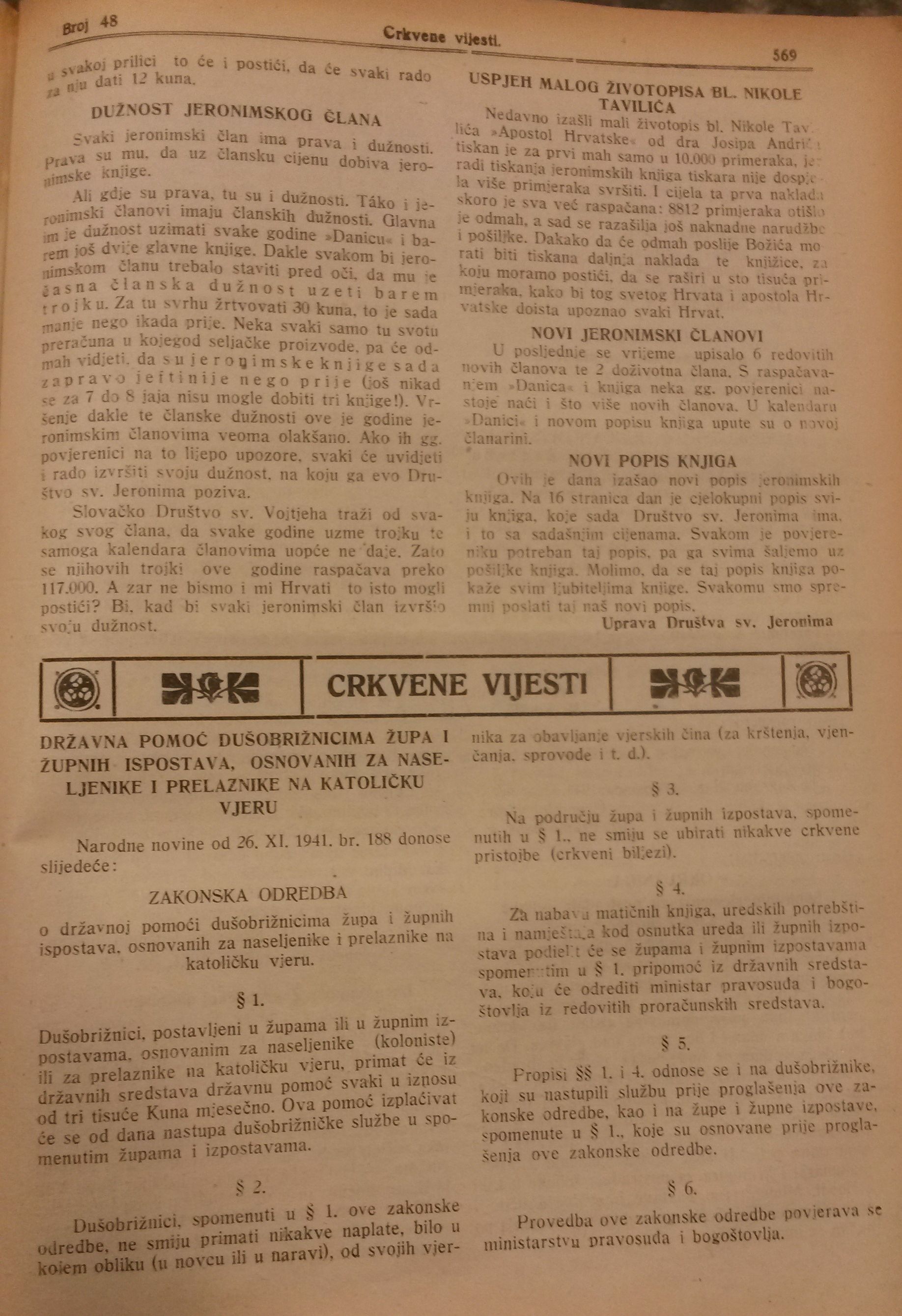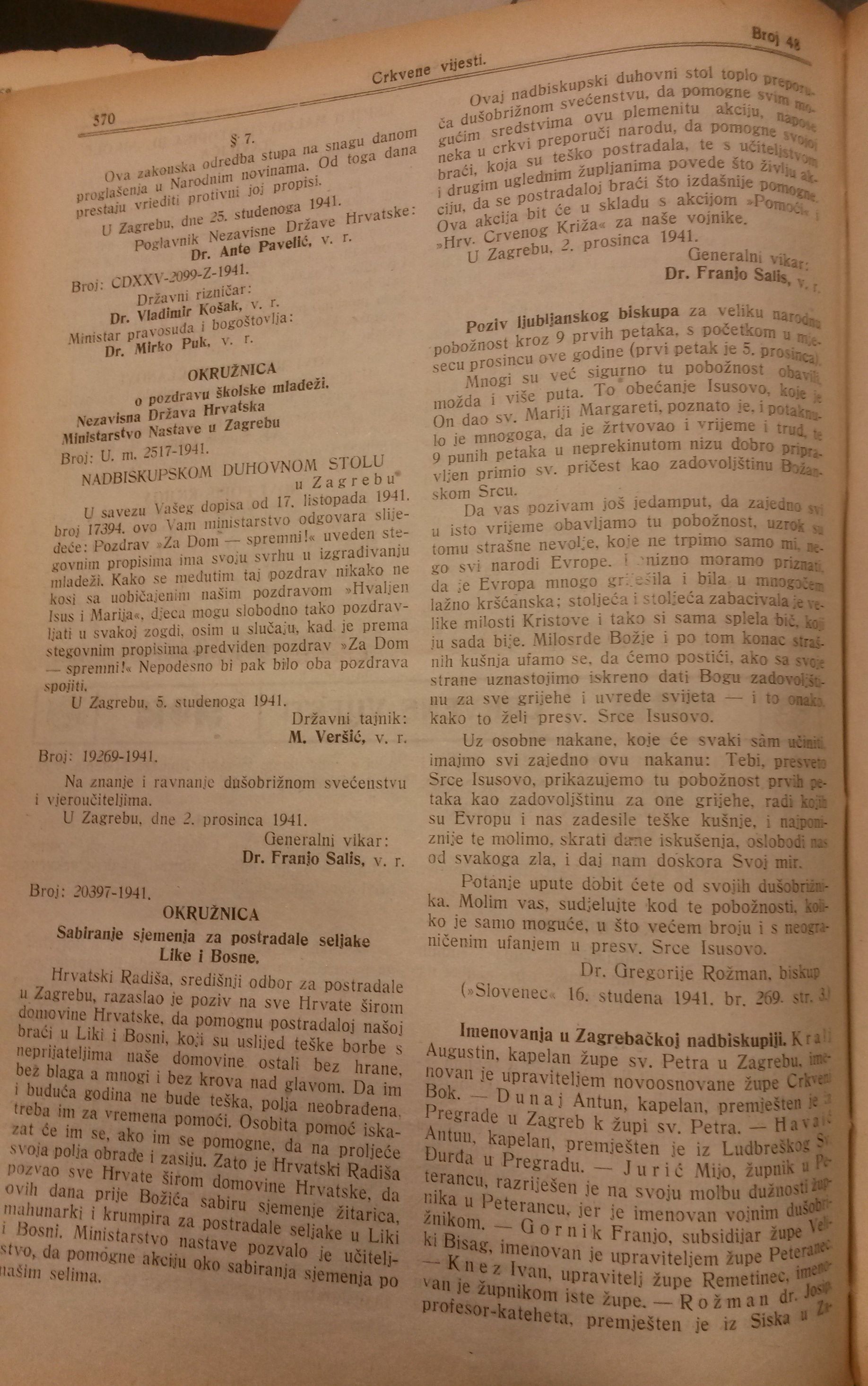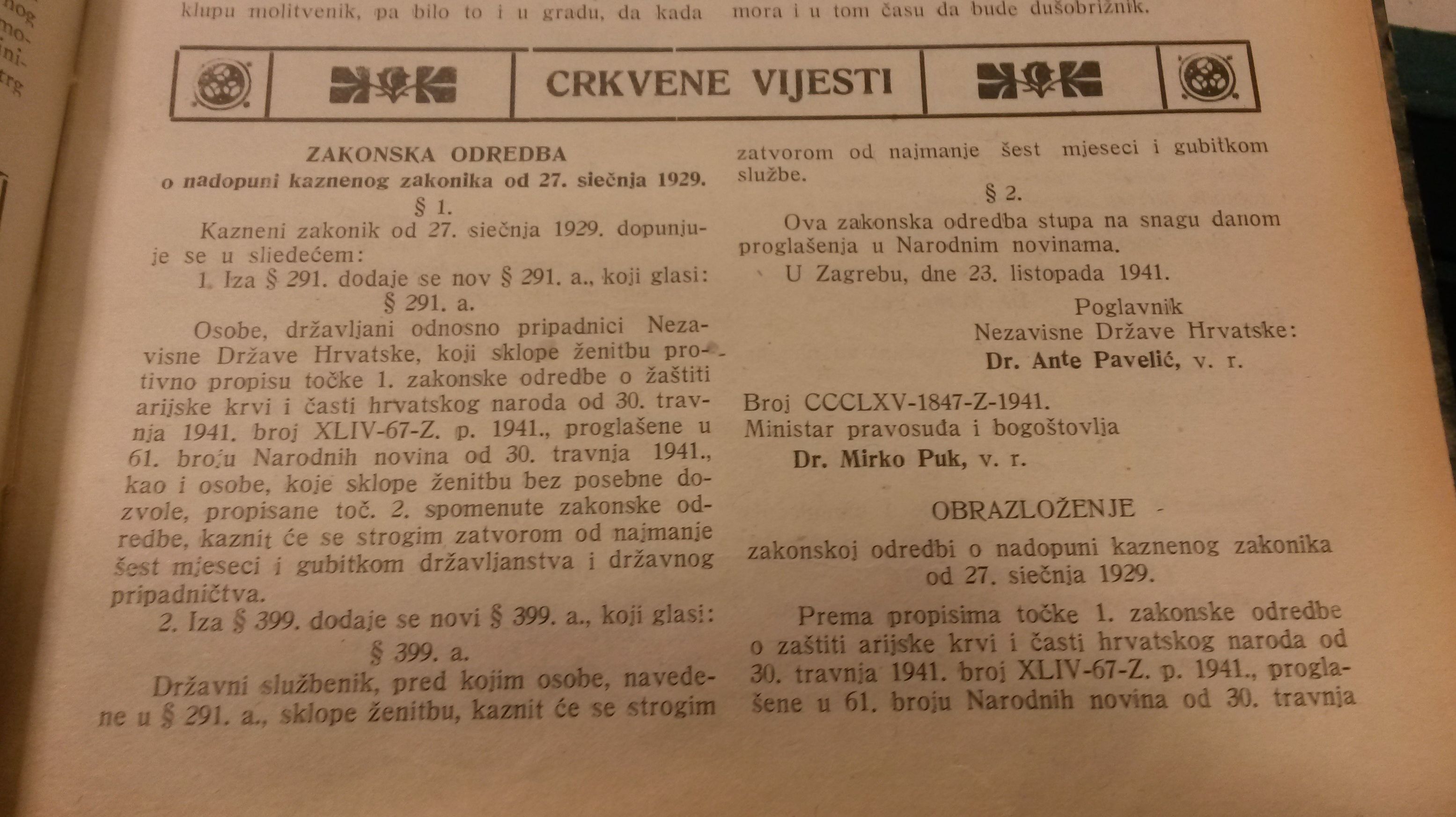 Ova će se odredba oglašavati i preko oltara, po nalogu šefa MUP-a Andrije Artukovića, koju je u idućem broju oglasio Stepinac.