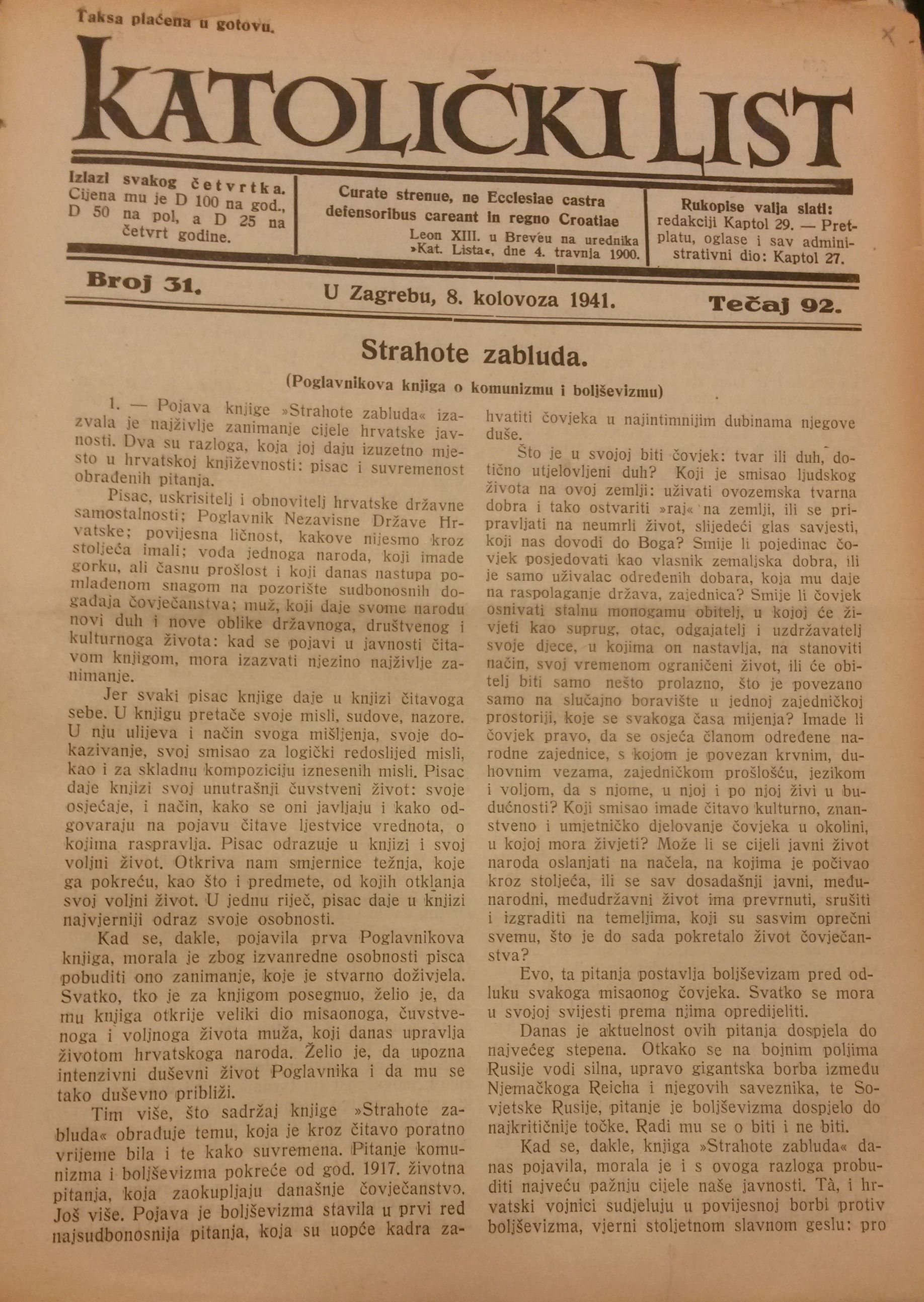 "Strahote zabluda" su literarni uradak Ante Pavelića o komunizmu i boljševizmu, koji je za Katolički list 8. kolovoza predstavio glavni urednik Nikola Kolarek, ne štedeći riječi hvale. Do te mjere ga slavi da na momente izgleda kao da subverzivno podriva Poglavnika. "Pisac, uskrisitelj i obnovitelj", "povijesna ličnost kakove nijesmo kroz stoljeća imali", "vođa koji imade gorku, ali časnu prošlost i koji danas nastupa pomlađenom snagom na pozorište sudbonosnih događaja čovječanstva: muž, koji daje svome narodu novi duh i nove oblike državnoga, društvenog i kulturnog života", dakle, Pavelić, daje u knjizi najvjerniji odraz svoje osobnosti. "Svatko tko je za knjigom posegnuo želio je da mu knjiga otkrije veliki dio misaonoga, čuvstvenoga i voljenoga života muža, koji danas upravlja životom hrvatskog naroda... da upozna intenzivni duševni život Poglavnika i da mu se tako duševno približi", kaže se.