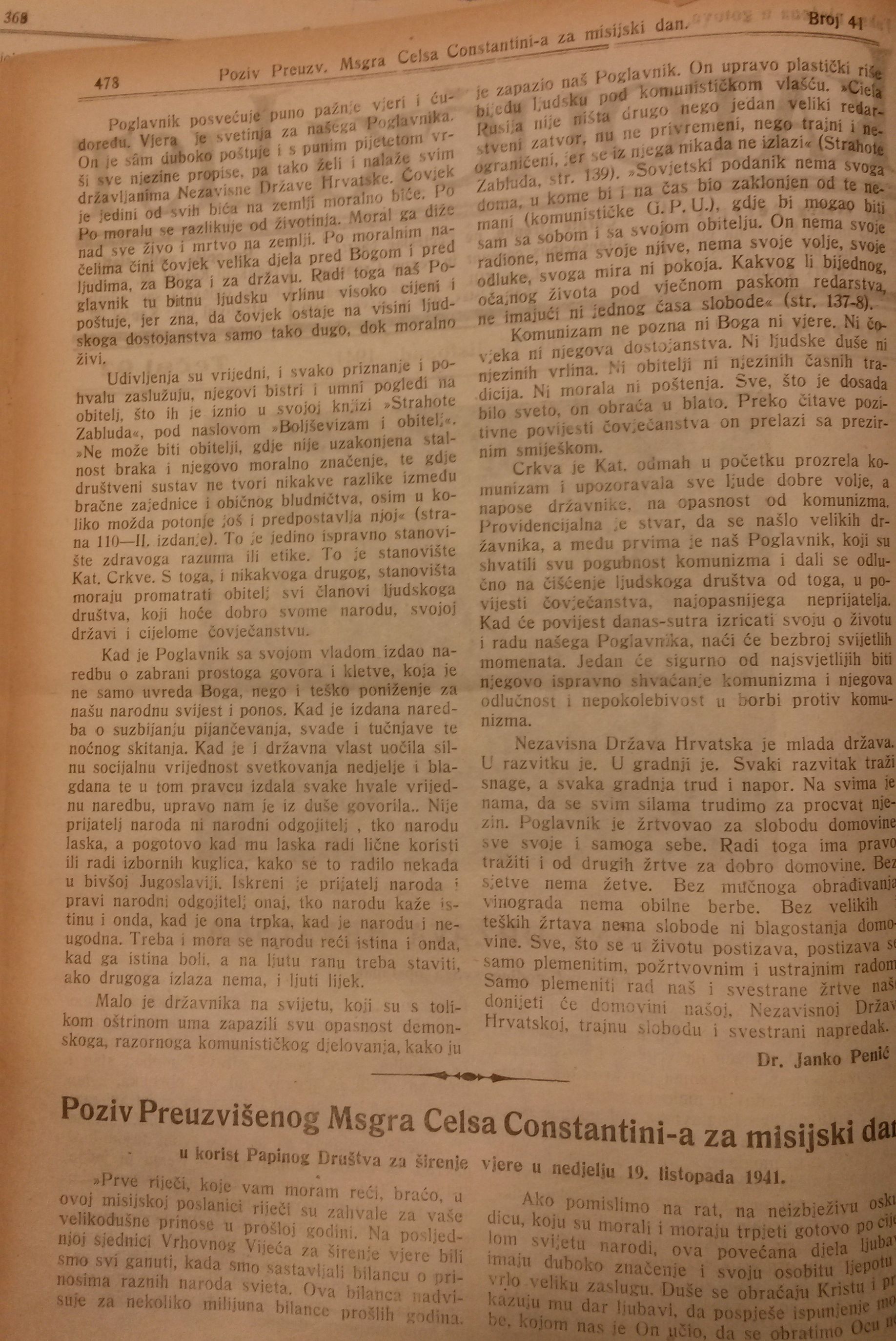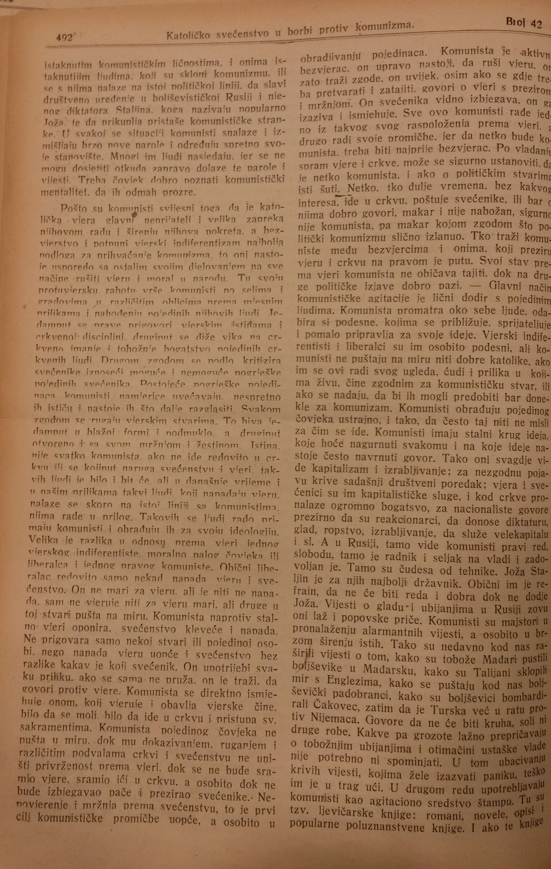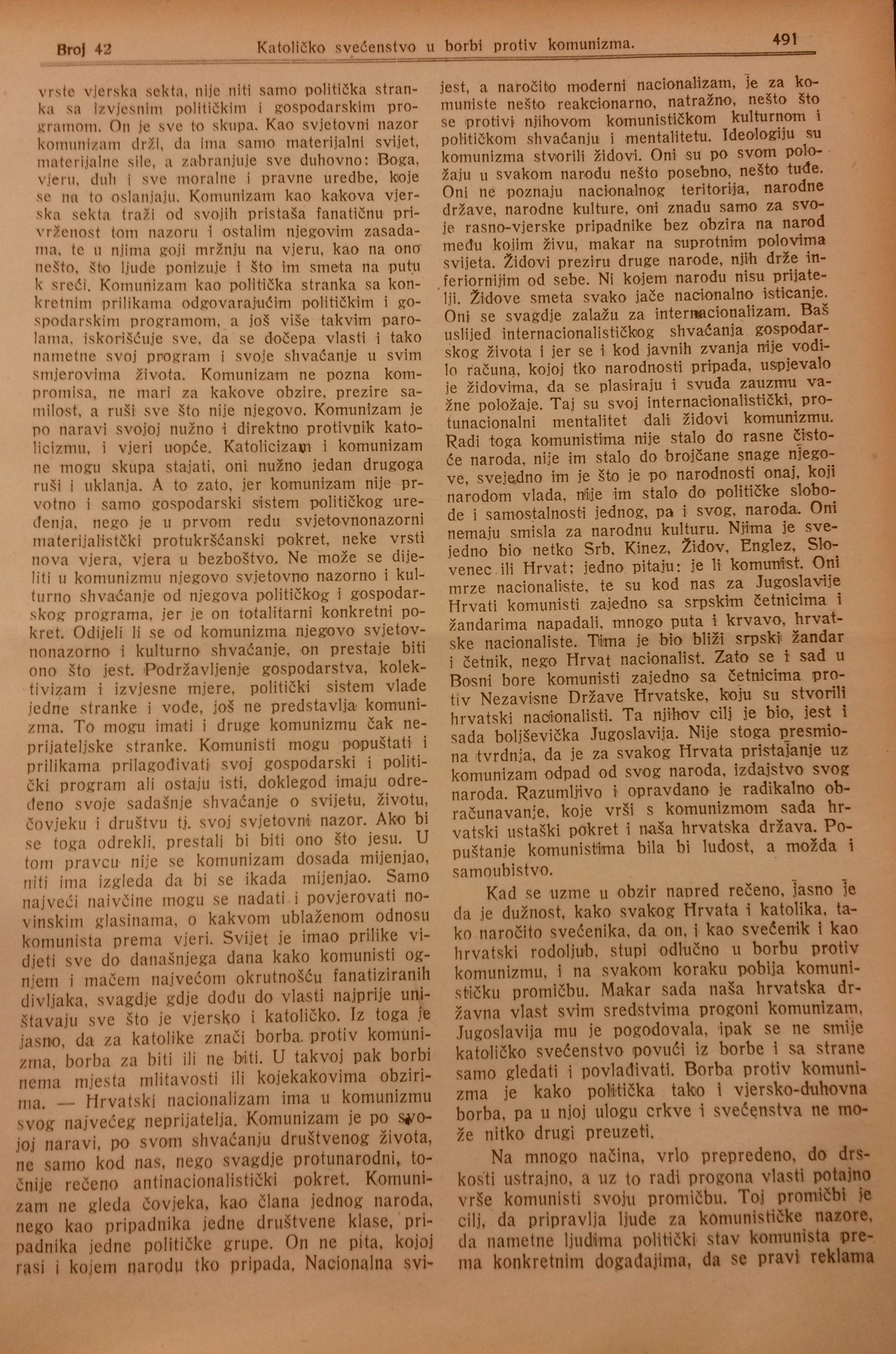 Kroz antikomunističku propagandu u članku "Katoličko svećenstvo u borbi protiv komunizma", ponovno se napadaju židovi, kao tvorci te ideologije i to na dosad najbrutalniji način: "Oni su po svom položaju u svakom narodu nešto posebno, nešto tuđe. Oni ne poznaju nacionalnog teritorija, narodne države, narodne kulture, oni znadu samo za svoje rasno-vjerske pripadnike, bez obzira na narod među kojim žive, makar na suprotnim polovima svijeta. Židovi preziru druge narode, njih drže inferiornijim od sebe. Ni kojem narodu nisu prijatelji. Židove smeta svako jače nacionalno isticanje. Oni se svagda zalažu za internacionalizam... Taj su svoj internacionalistički, protunacionalni mentalitet dali židovi komunizmu. Radi toga komunistima nije stalo do rasne čistoće naroda, nije im stalo do brojčane snage njegove... Oni nemaju smisla za narodnu kulturu. Njima je svejedno bio netko Srb, Kinez, Židov, Englez, Slovenec ili Hrvat: jedino pitaju: je li komunist..."