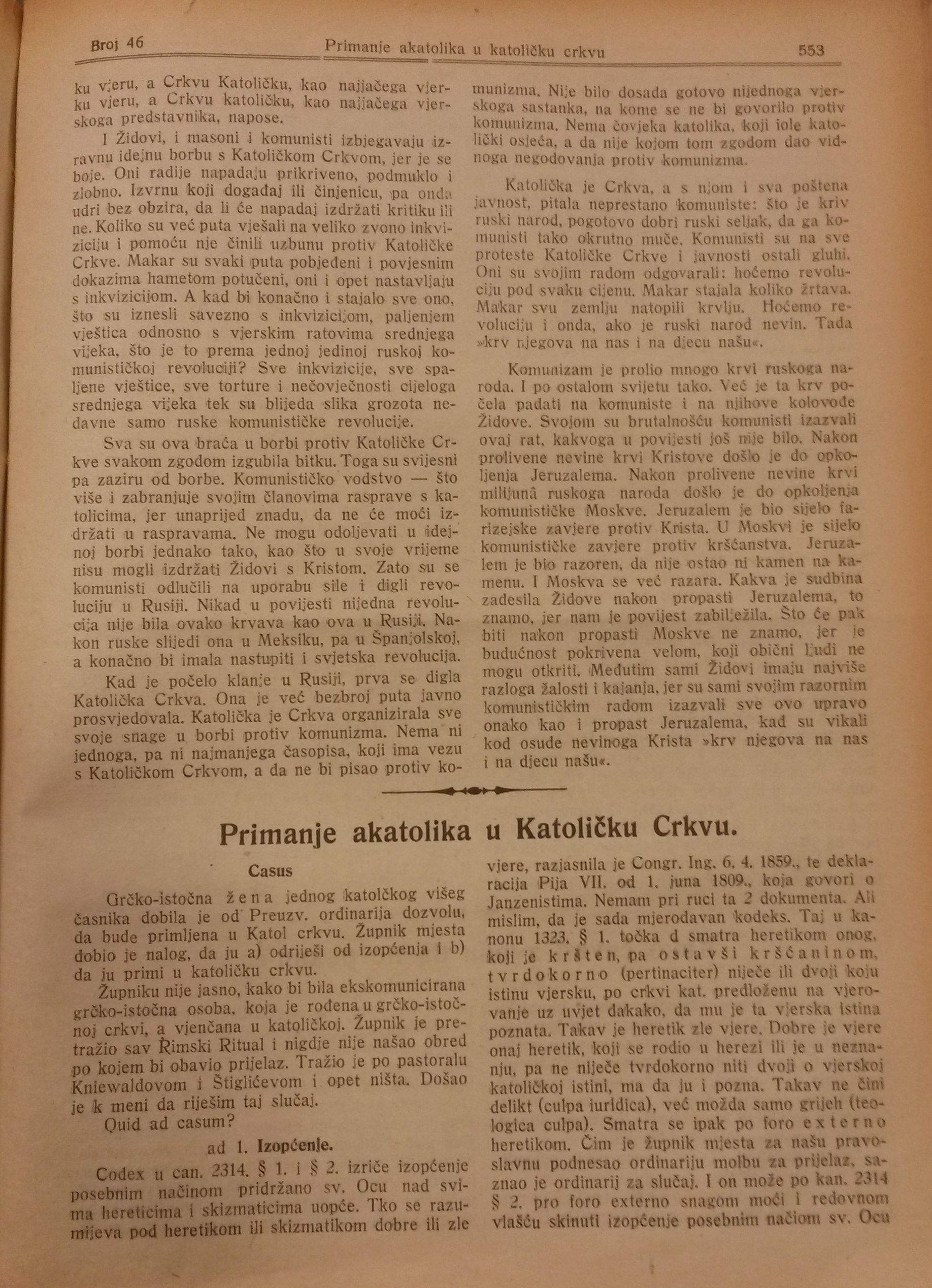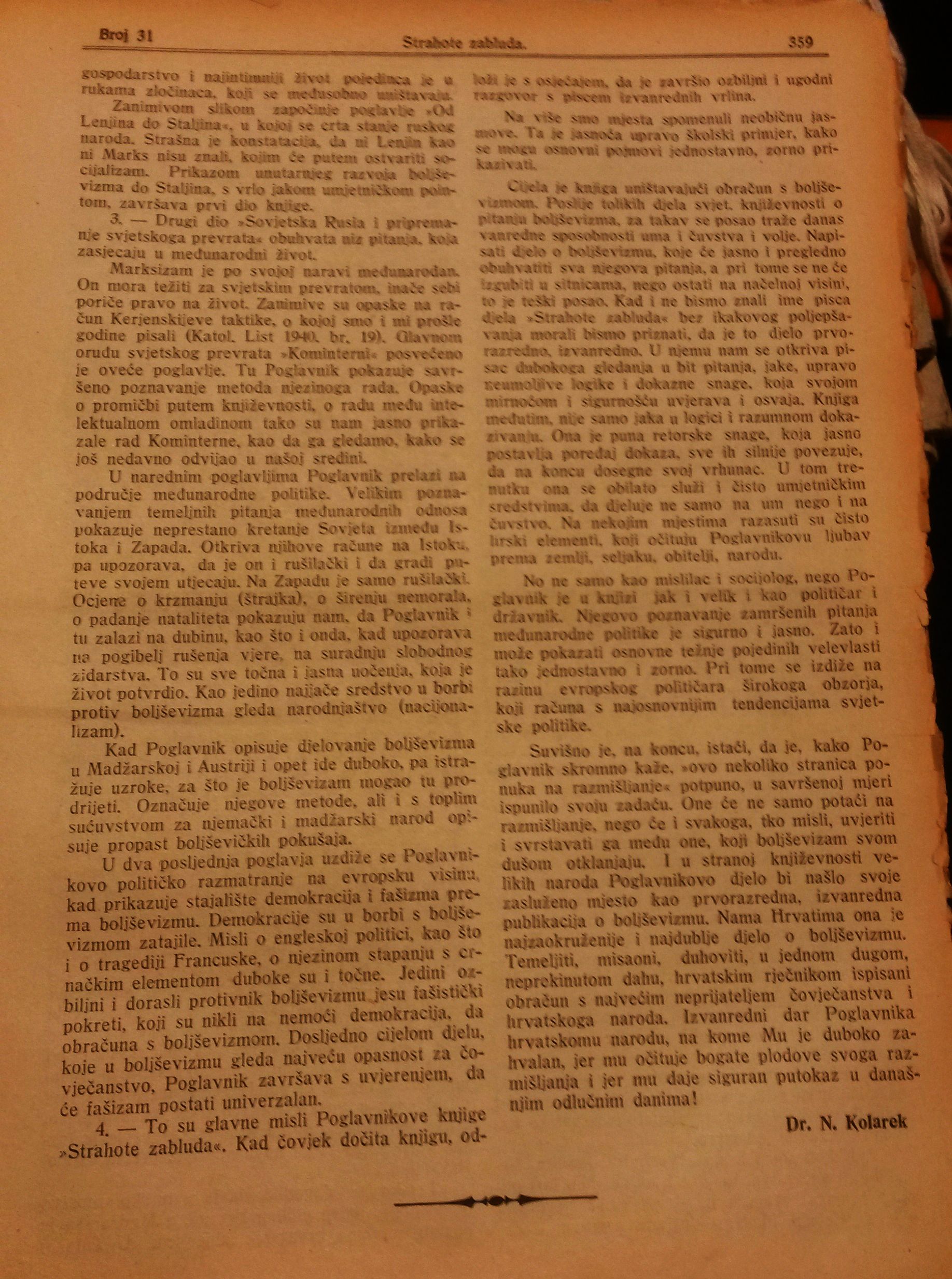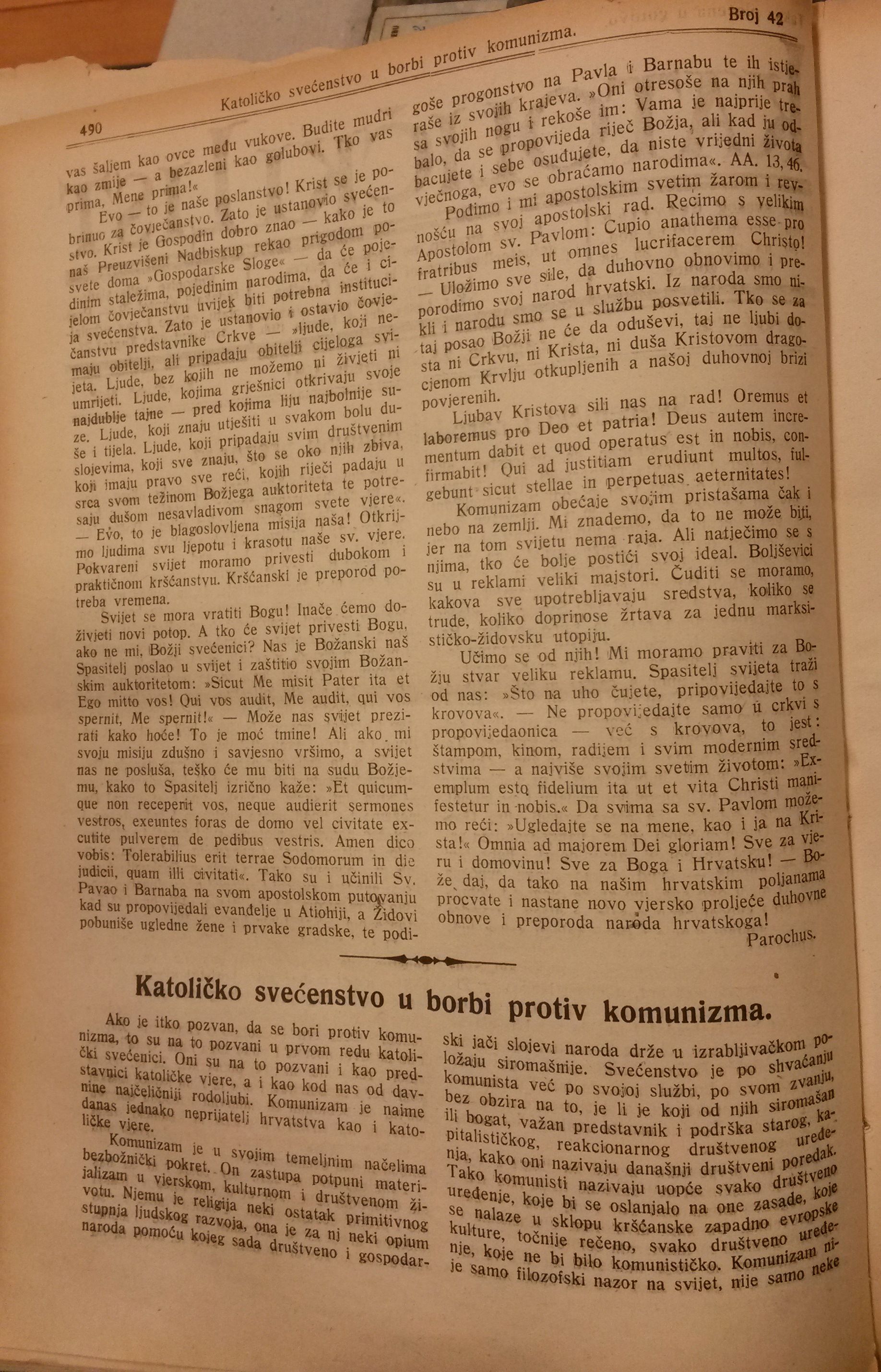 Kroz antikomunističku propagandu u članku "Katoličko svećenstvo u borbi protiv komunizma", ponovno se napadaju židovi, kao tvorci te ideologije i to na dosad najbrutalniji način: "Oni su po svom položaju u svakom narodu nešto posebno, nešto tuđe. Oni ne poznaju nacionalnog teritorija, narodne države, narodne kulture, oni znadu samo za svoje rasno-vjerske pripadnike, bez obzira na narod među kojim žive, makar na suprotnim polovima svijeta. Židovi preziru druge narode, njih drže inferiornijim od sebe. Ni kojem narodu nisu prijatelji. Židove smeta svako jače nacionalno isticanje. Oni se svagda zalažu za internacionalizam... Taj su svoj internacionalistički, protunacionalni mentalitet dali židovi komunizmu. Radi toga komunistima nije stalo do rasne čistoće naroda, nije im stalo do brojčane snage njegove... Oni nemaju smisla za narodnu kulturu. Njima je svejedno bio netko Srb, Kinez, Židov, Englez, Slovenec ili Hrvat: jedino pitaju: je li komunist..."