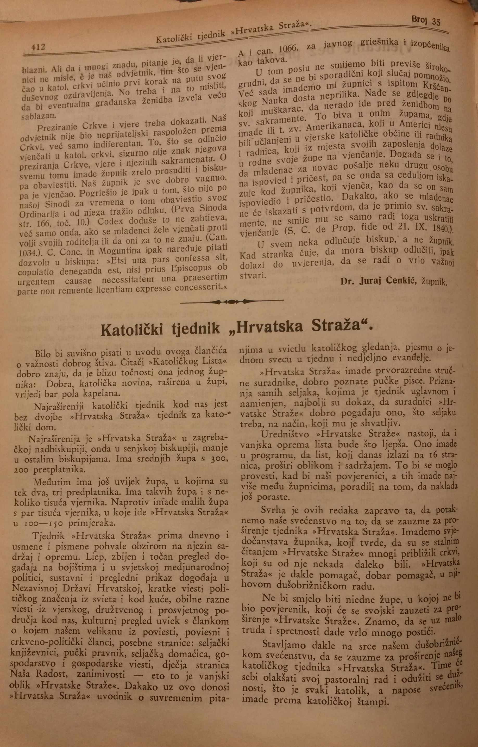 Penić u broju 19 upozorava na svakovrsne vjersko moralne zablude i nastranosti, koje zadaju gorke jade svećenicima: "komunizam, nemoral, bijela kuga, vjerski nehaj, toliki razvodi brakova i priležništva". Poziva na strpljenje i takt, a sve za "procvat sv. Crkve i NDH".