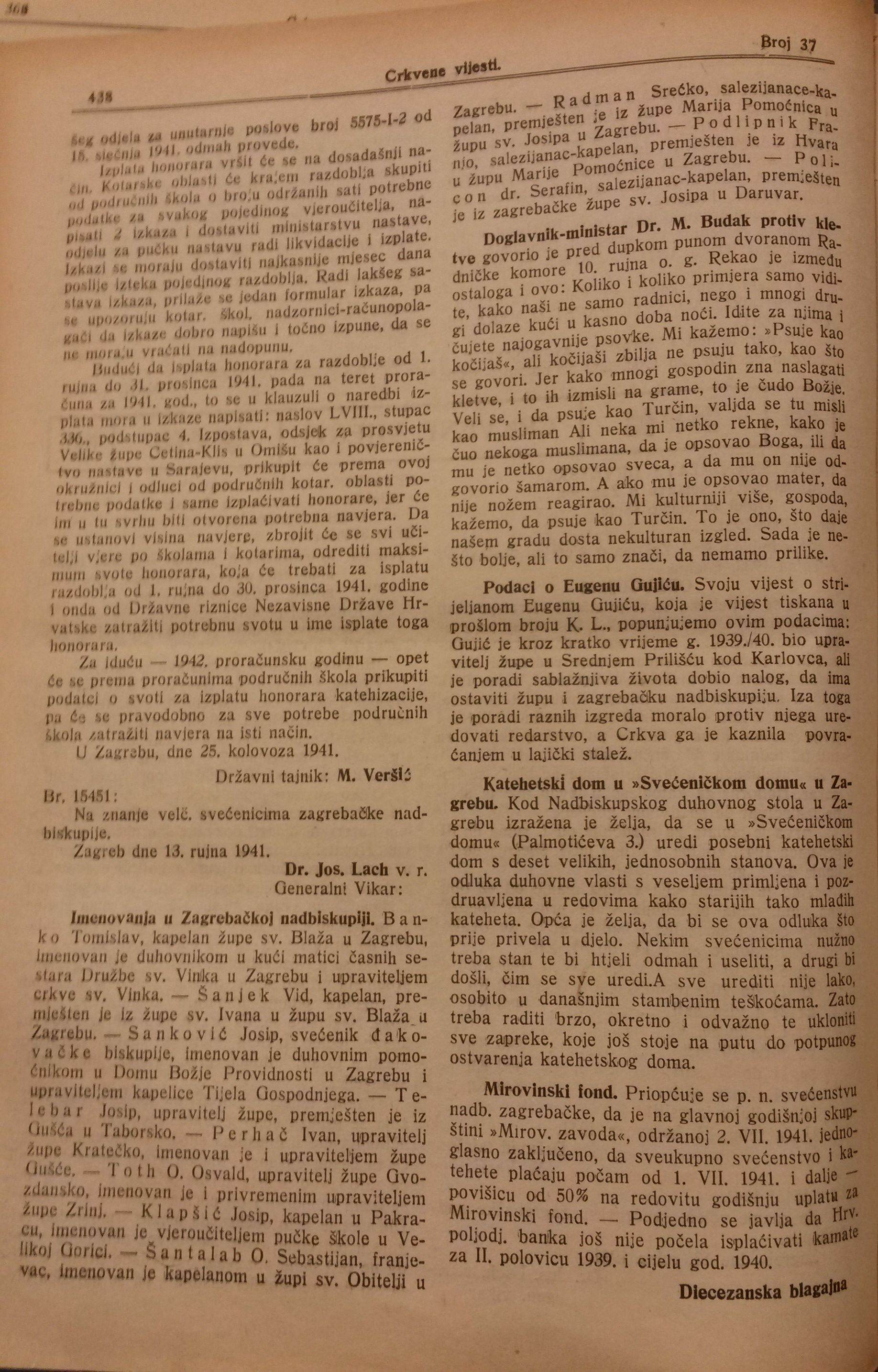 U crkvenim vijestima kratko se izvještava da je svećenik Eugen Gujić streljan (od ustaša) zbog više teških krivičnih djela, među kojima otimačina i ubojstvo. U idućem broju pojašnjavaju da je zbog sablažnjivog ponašanja taj svećenik ranije udaljen iz službe.