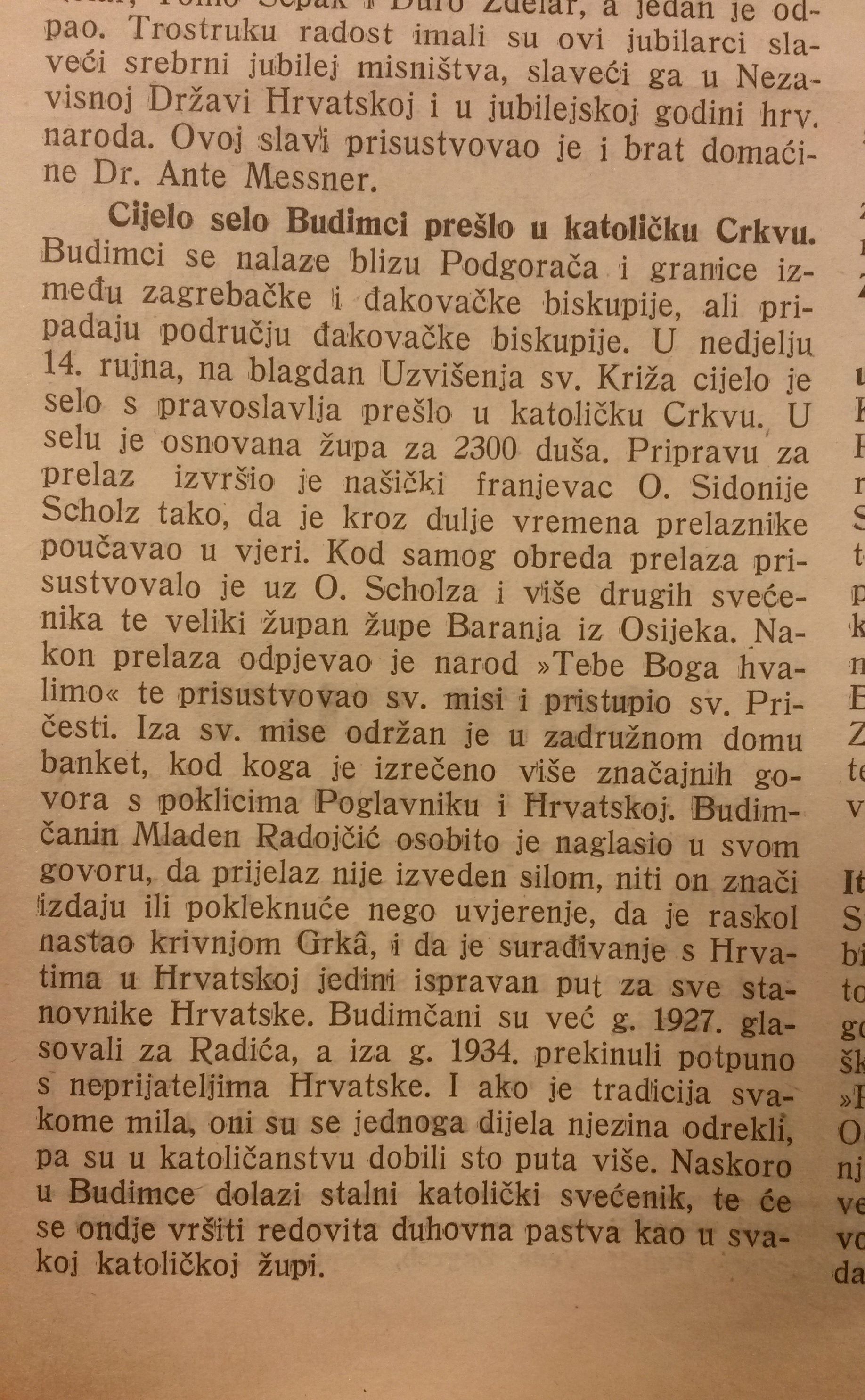 Vijest o masovnom prijelazu prvi puta dolazi na stranice Katoličkog lista - cijelo selo Budimci kod Podgorača s 2.300 stanovnika s pravoslavlja prelazi na katoličanstvo: "Iza svete mise održan je u zadružnom domu banket, kog koga je izrečeno više značajnih govora s poklicima Poglavniku i Hrvatskoj. Budimčanin Mladen Radojčić osobito je naglasio u svom govoru da prijelaz nije izveden silom, niti on znači izdaju ili pokleknuće, nego uvjerenje, da je raskol nastao krivnjom Grkâ, i da je surađivanje s Hrvatima u Hrvatskoj jedini ispravni put za sve stanovnike Hrvatske".