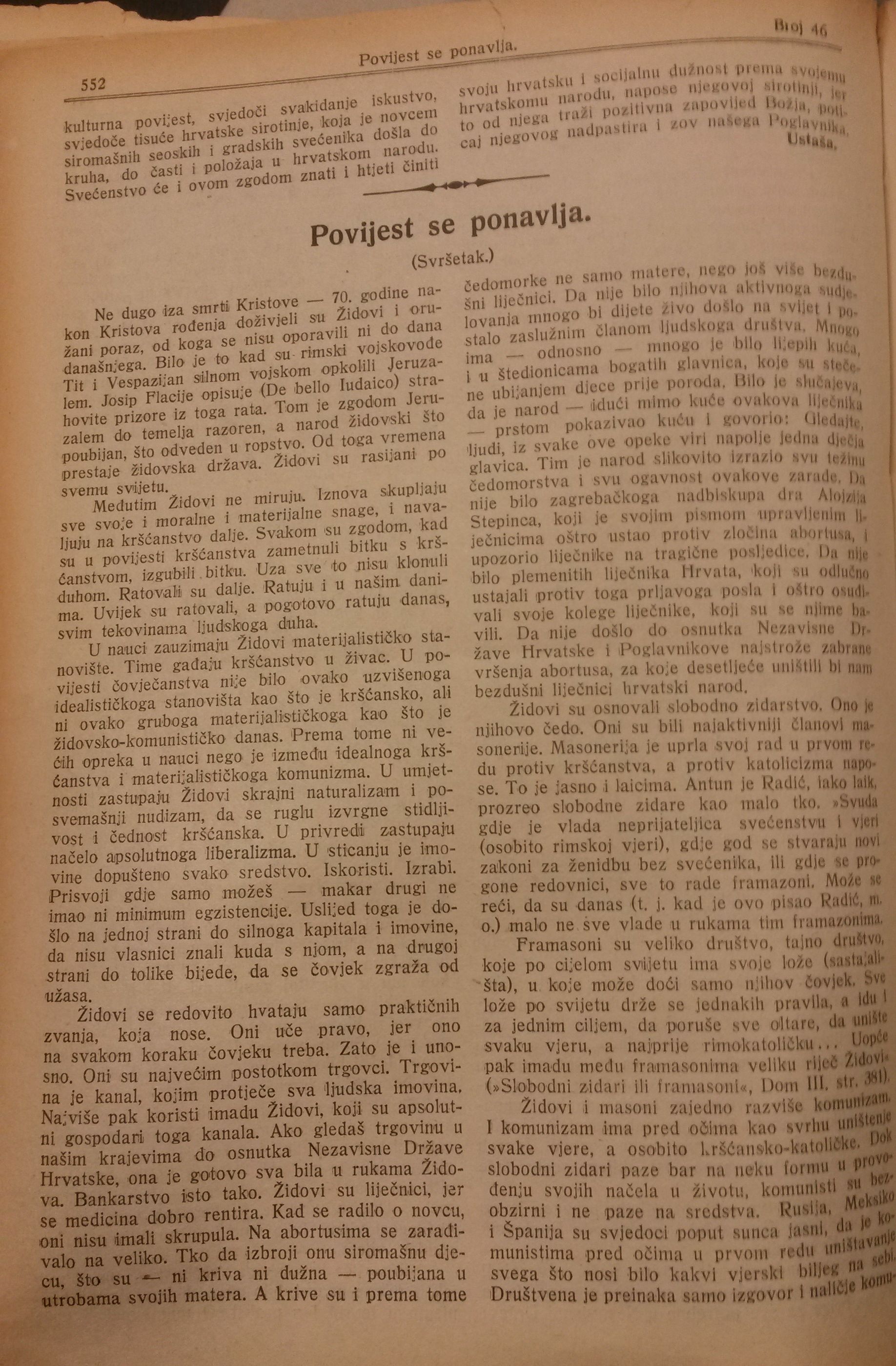 Članak koji je započeo u ranijem broju s uobičajenim podsjećanjem da su Židovi krivi za Isusovu smrt, "Povijest se ponavlja", u svom nastavku zaoštrava retoriku: "Židovi su rasijani po svemu svijetu. Međutim, Židovi ne miruju. Iznova skupljaju svoje moralne i materijalne snage i navaljuju na kršćanstvo dalje. Svakom su zgodom, kad su u povijesti kršćanstva zametnuli bitku s kršćanstvom, izgubili bitku. Uza sve to nisu klonuli duhom. Ratovali su dalje. Ratuju i u našim danima... Židovi su osnovali slobodno zidarstvo. Ono je njihovo čedo... Framasoni su veliko društvo, tajno društvo, koje po cijelom svijetu ima svoje lože... Židovi i masoni zajedno razviše komunizam..."