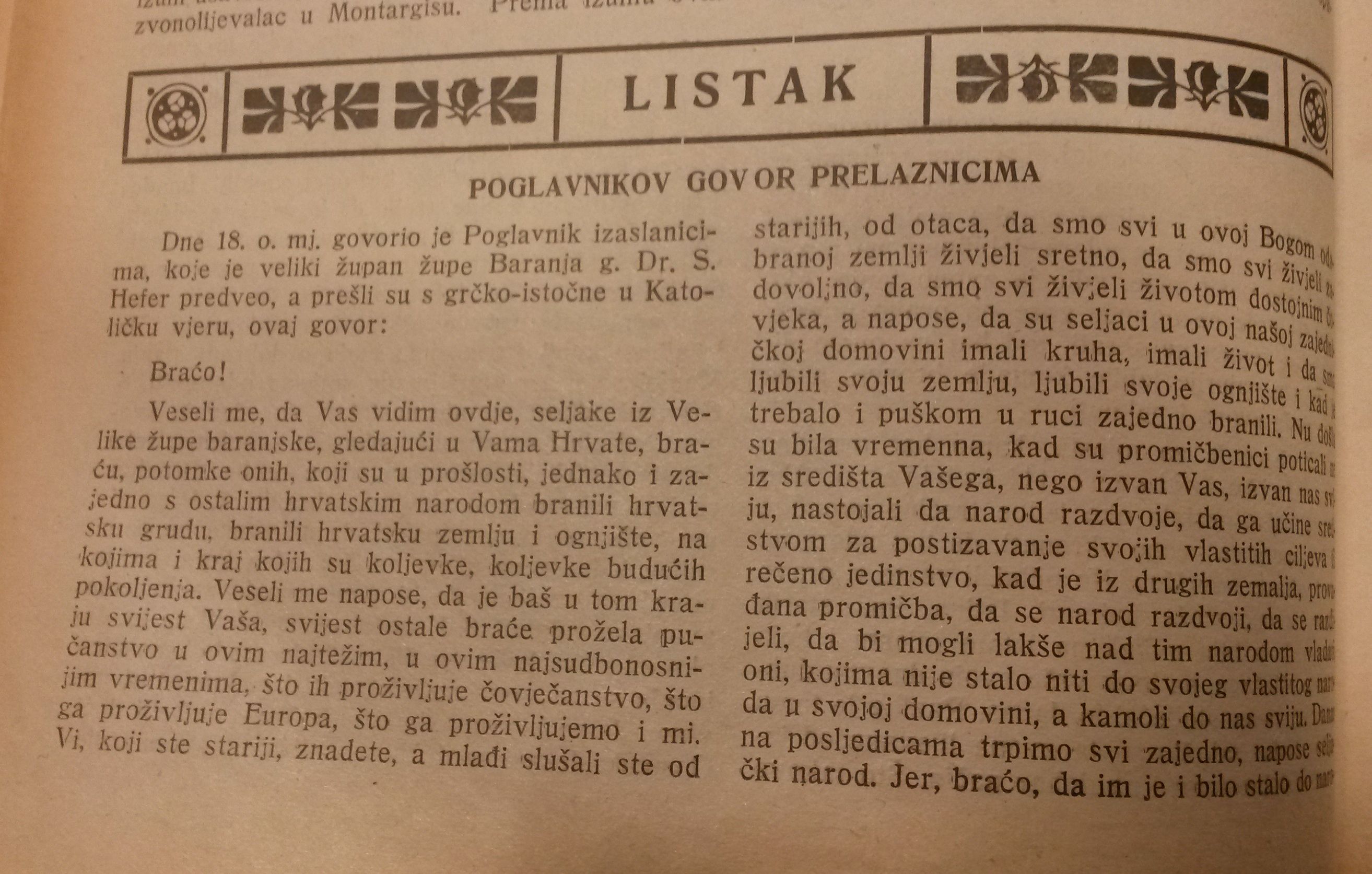 Članak iz Katoličkog lista o prijelazu čitavog sela s pravoslavlja, uz klicanje Anti Paveliću. Država je tražila da se vjerski prijelazi ubrzaju i opominjala svećensto da ne smije tražiti novac od prijelaznika mimo zakonom propisanih taksi, više puta (FOTO: Lupiga.Com)