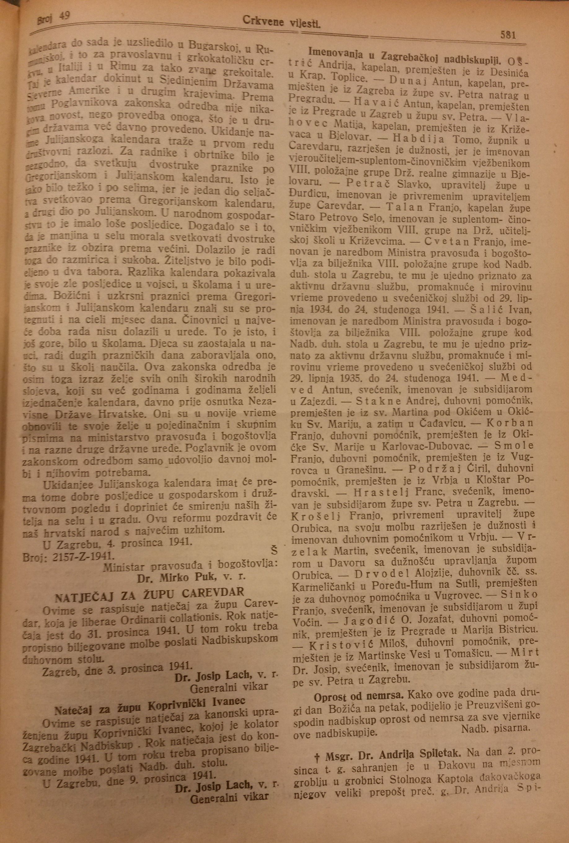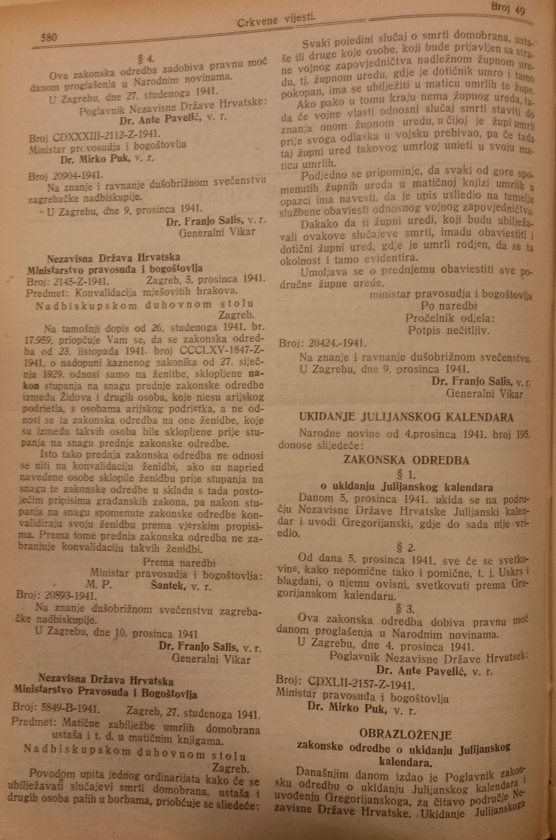 Pred sam kraj 1941. godine Katolički list dodatno pojašnjava zakonske odredbe o brakovima s osobama nearijskog podrijetla te objavljuje da je ukinut Julijanski kalendar. Navodi se i da je on ukinut u nizu drugih država te da je bilo nepraktično slaviti dvostruke praznike.