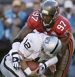 mica mogla biti metom terorista, što se kao što vidite nije pokazalo opravdanim, pa je možda nekom od odgovornih žao onih rigoroznih provjera i rekordnih 9 milijuna dolara utrošenih na mjere osiguranja. U zadnji tren prije utakmice cijene ulaznica kod švercera dosezala su i nevjerojatnih 6 000 zelembaća. Oni koji si takvo nešto nisu mogli priuštiti ili nisu mogli kampirati dva dana ispred blagajni kada su karte puštene u prodaju, ostali su doma pred ekranima svojih ili možda tuđih televizora, a takvih je samo u USA bilo 150 milijuna. U Hrvatskoj se utakmica mogla gledati zahvaljujući Novoj TV, čiji komentatori su nas toliko podučavali pravilima kao da smo osnovnoškolci, pa treba ponoviti i nekoliko puta kako bismo utvrdili gradivo. Na stadionu je održan i veliki koncert na kojem su nastupili mnogi, a neka od najzvučnijih imena su Sting, No Doubt, Jon Bon Jovi, Shania Twain. Pobijedio je Tampa Bay s 48:21, pa je zbog toga u Floridi na ulicama slavilo tisuće ljudi, dok je u Californiji u Oaklandu nešto manji broj ljudi u žalosti zbog poraza krenuo u divljački pohod gradom, paleći automobile bez obzira na registarske tablice, zbog čega je lokalna policija morala uporabiti suzavac i gumene metke koji sadržavaju tekućinu neugodnog mirisa, a koja smrad pušta tek u kontaktu s kožom. Eto tako je i ove godine Super Bowl dokazao kako je to izvorno američko događanje sa svim potpuno američkim popratnim sadržajem.