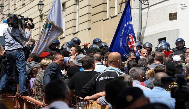 Od ranog jutra na Markovom trgu traje opsadno stanje, koje je kulminiralo oko podneva, kada je dio prosvjednika iz Savske ulice probio policijski kordon i uspio doći do crkve sv. Marka gdje još od sinoć boravi stotinjak prosvjednika, mahom hrvatskih branitelja. Istovremeno, veća skupina od oko stotinjak prosvjednika fizički se sukobila s policijom na prilazu Markovom trgu, bacivši na policajce i nekoliko bengalki, nakon čega su oni branitelji koji su od sinoć u crkvi, oglašavajući se uz pomoć megafona, policiju pozvali da „ne ide na hrvatske branitelje“.