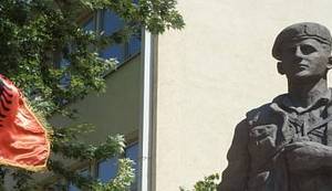 Nakon što kod mosta skrenemo desno - još uvijek smo na sjeveru - kao da prelazimo neku nevidljivu granicu. Oko nas više nema natpisa „Ne šiptarskim izborima“ ili murala posvećenih Rusiji. Okružuje me more crvenih zastavica i crnih orlova, i to na trgu koji nosi ime – Adema Jasharija.