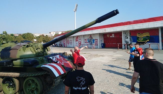 Teško je reći da je bio običan radni dan. Tenk, rekoše prvo da je zaplijenjen u Vukovaru, a zatim da sa Vukovarom nema veze već da je to dar neke neimenovane kompanije, osvanuo je pred sjevernom tribinom stadiona Crvene Zvezde.