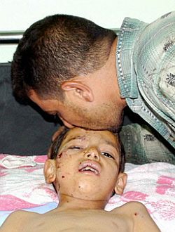 Mosul (Irak), istovremeno - Otac ljubi sina ranjenog u minobacačkom napadu