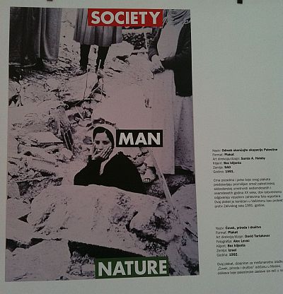 Ovaj plakat dizajniran je za međunarodnu izložbu "Čovjek, priroda i društvo" održanu u Moskvi. Riječi u okvirima oslikane su bojama palestinske zastave. Autor fotografije je ALex Levac, a plakata - David Tartakover.