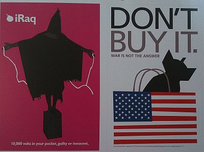 Plakat prvi - ovaj s nuklearnom gljivom - pojavio se u vrijeme pedesetogodišnjice bombardiranja Hiroshime. Predstavlja izraz protesta protiv odluke Francuske da obnovi nuklearne probe na otoku Mururoa. Promjena riječi "hero" (heroj) u "Hiro" služi kao povijesni podsjetnik da dobre namjere lako mogu dovesti do tragedije. Autor - Yossi Lemel.