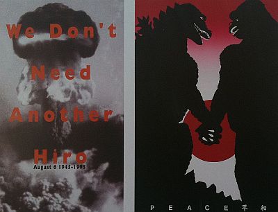 Plakat drugi - ovaj s King Kongom i Godzilom - napravili su 1985. godine američki dizajneri u znak sjećanja na bombardiranje Hiroshime. Plakat podstiče pomirenje dva diva - SAD i SSSR - koji bi mogli uništiti svijet. Autor - Steff Geissbuhier.
