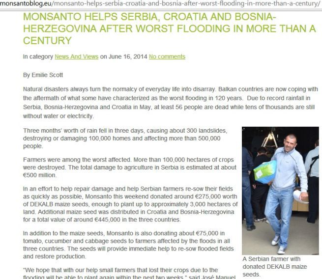 "U namjeri da pomogne u sanaciji štete te da pomogne srpskim farmerima da ponovno zasiju svoja polja što je brže moguće, Monsanto je ovog vikenda donirao oko 275 tisuća eura vrijedno DEKALB sjeme kukuruza, dovoljno da se zasadi oko tri tisuće hektara zemlje. Još sjemena je distribuirano u Hrvatskoj i Bosni i Hercegovini ukupne vrijednosti od oko 445 tisuće eura u sve tri zemlje. Osim sjemena kukuruza, Monsanto također donira oko 75.000 eura vrijedno sjeme rajčice, krastavca i kupusa farmerima pogođenim poplavama u sve tri zemlje. Sjeme će pružiti trenutnu pomoć za ponovnu sjetvu i uspostavljanje proizvodnje na poplavljenim područjima", navodi se na službenom blogu Europskog PR tima Monsanta.