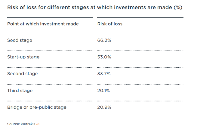 Rizik neuspjeha u prvoj fazi istraživanja iznosi oko 66 posto što privatni investitori i poslovni anđeli rado prepuštaju državi dok se oni koncentriraju na profitabilnije faze. Rad Philipa Auerswalda i Lewisa Branscomba "Doline smrti i darvinovska mora; financiranje izuma i inovacija u SAD" iz 2003. godine pokazuje da je "udio državnih investicija u tvrtke koje razvijaju tehnologije u ranim fazama jednak ukupnim investicijama "poslovnih anđela" te između dva i osam puta veći od privatnih "venture" fondova. Potonji se koncentriraju na područja visokog potencijalnog rasta, niske tehnološke kompleksnosti i niske potrebe za kapitalom obzirom da ovo značajno povećava troškove.