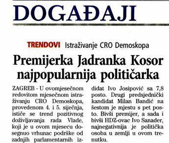 Vjesnik - Premijerka Jadranka Kosor najpopularnija političarka