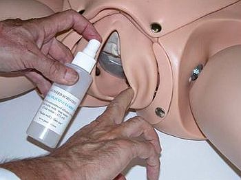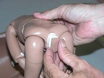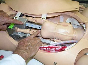 Na ovoj slici, koju smo tajnim putovima prokrijumčarili iz ordinacije na strogo skrivenoj lokaciji vidi se kako vješta ruka mentora osposobljava simulator smještajući "bebu" u mehanizam koji simulira trudnicu