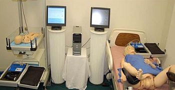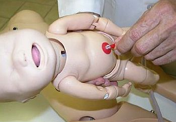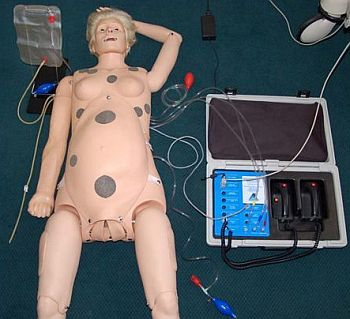 Prije nego se simulator rodilje osposobi, "bebu" treba "pupčanom vrpcom" spojiti za njenu plastičnu majku