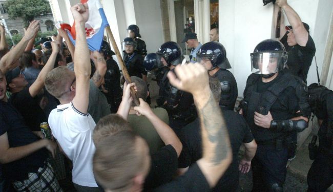 Naime, dok su ovi iz prve dvije skupine neometano mahali zastavama s grbovima s prvim bijelim poljem, policiji pred nosom, navijači su za vrijeme predstave sjedili u kafiću nedaleko od kazališta, uzvikujući iste huškačke parole ('Otvori vrata’, ‘Mi Hrvati ne pijemo vina, samo krvi četnika iz Knina’ i ‘Ustaški se barjak vije za slobodu i za dom’) kao i pravaši te branitelji, da bi kasnije prema gledateljima poletjele i pivske krigle.