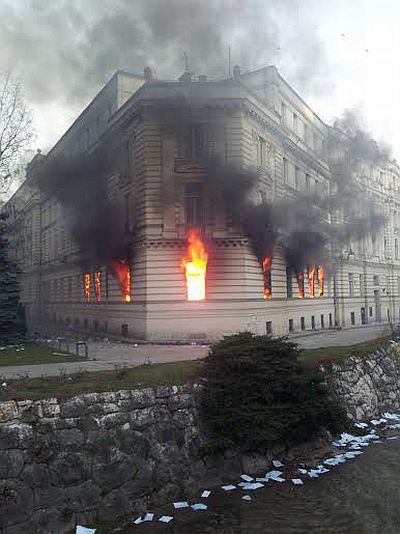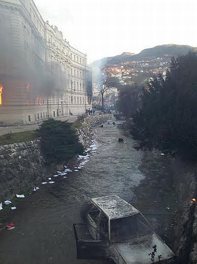 Nije bilo jasno šta i gdje tačno gori, sve dok plameni jezičci nisu počeli izlaziti iz prozora zgrade prema Koševskom potoku šireći se unutrašnjošću zgrade. Papiri i dokumentacija iz opštine Centar su letjeli zrakom. Čulo se pucanje stakla i razbijanje namještaja. U ulici Reisa Džemaludina Čauševića trajala je neprekidna ulična borba. Vidio sam mladiće sa otetim policijskim štitovima i policijskim kacigama na glavama. Bilo je ranjenih demonstranata. Na njihovim licima se vidio adrenalin od ulične borbe.