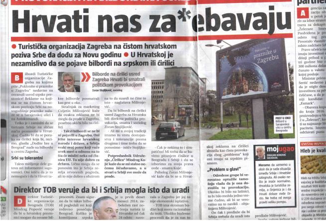 Tu već treba da osetite stid, neko daje silne novce (1.300 evra mesečno po bilbordu, a bilo ih je na strateškim mestima poput Autokomande, Dalmatinske ulice, u Sarajevskoj) da pozovu Srbe i ostale s ove strane Šarengradske ade u Zagreb, a vi došli ovde da ostavljate teško stečene pare. No niste najgori, možda ste, zapravo, i ne znajući, deo čitavog performansa u vezi sa kojim roto dnevnik Informer blizak vlastima nema dilemu: "Hrvati nas za*ebavaju", objavljuje ova tiskovina (ovo je naslov, u tekstu je uredno 'zajebavaju'), uz nemilu opasku u podnaslovu: "Turistička organizacija Zagreba na čistom hrvatskom poziva Srbe da dođu za Novu godinu".