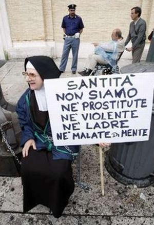 Albina i Teresa vezale su se lancima i u rukama, na sveopću nevjericu brojnih vjernika koji nedjeljom pohode Vatikan, držale dva transparenta. Na jednom od njih je pisalo - "Svetosti, nismo prostituke, nismo nasilne, nismo kradljivice i nismo mentalno nestabilne". No, je li poglavar katoličke crkve upoznat s njihovom porukom, nije poznato, ali svoju je tjednu poruku objavio ne obazirući se na karmelićanke.