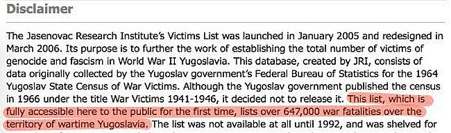 Ali kao što se i navodi u "Disclaimeru" iznad popisa, to nije lista žrtava Jasenovca, već lista oko 647.122 imena s popisa žrtava rata iz cijele Jugoslavije: