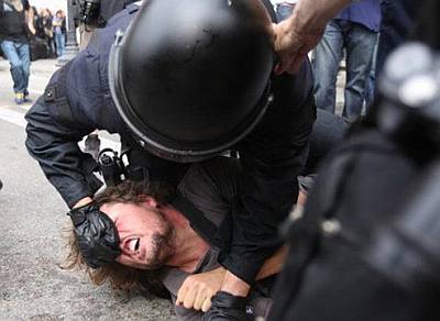 Već desetak dana Španjolskom drmaju prosvjedi, u kojima uglavnom sudjeluju mladi protestirajući protiv tamošnjih najvećih političkih stranaka i korupcije, upozoravajući na rastuću nezaposlenosti i socijalne rezove. Na Plaça de Catalunya, u Barceloni, u tu su svrhu organizirali i provizorni kamp, što se nikako nije svidjelo španjolskim vlastima. Uglavnom mladi ljudi sjeli su na cestu želeći blokirati konvoj kamiona koji su trebali počistiti njihov kamp. Bez imalo milosti policajci su po prosvjednicima pucali gumenim mecima, a kamere su snimile brutalno pendrečenje i metenje asfalta s prosvjednicima.
